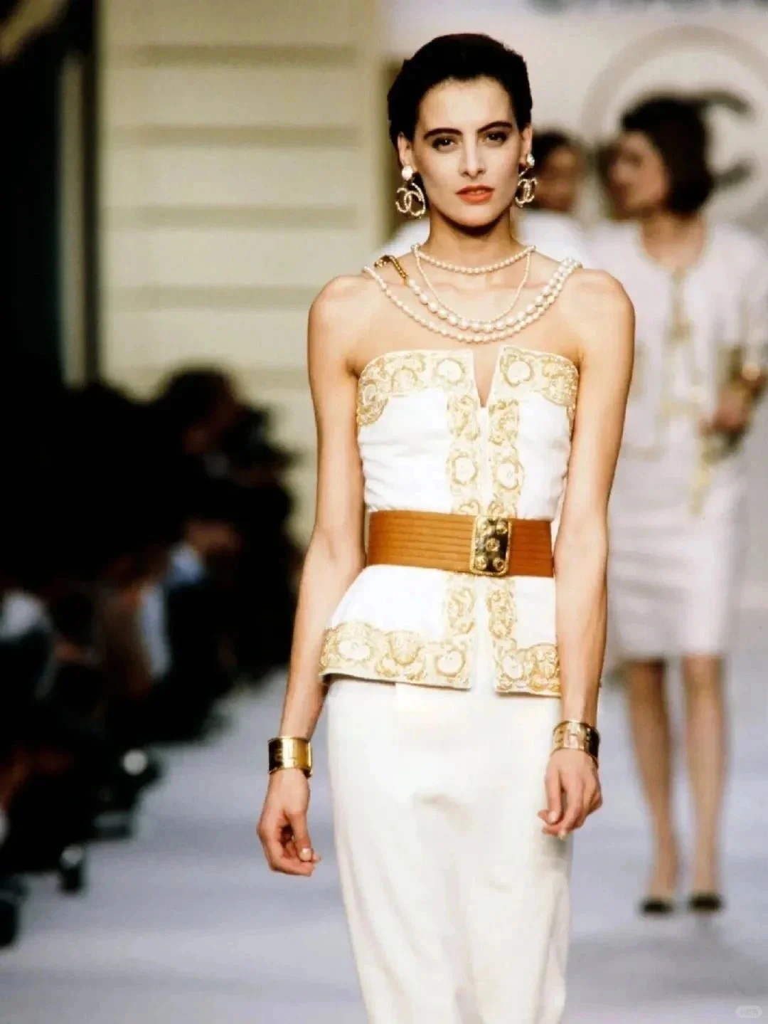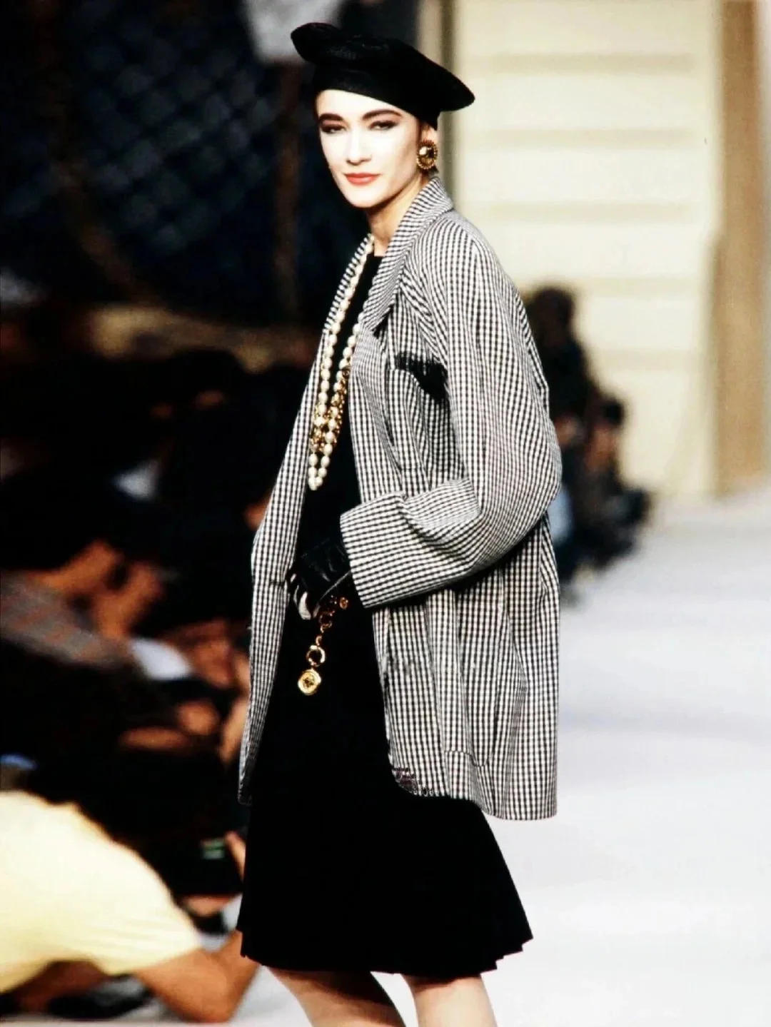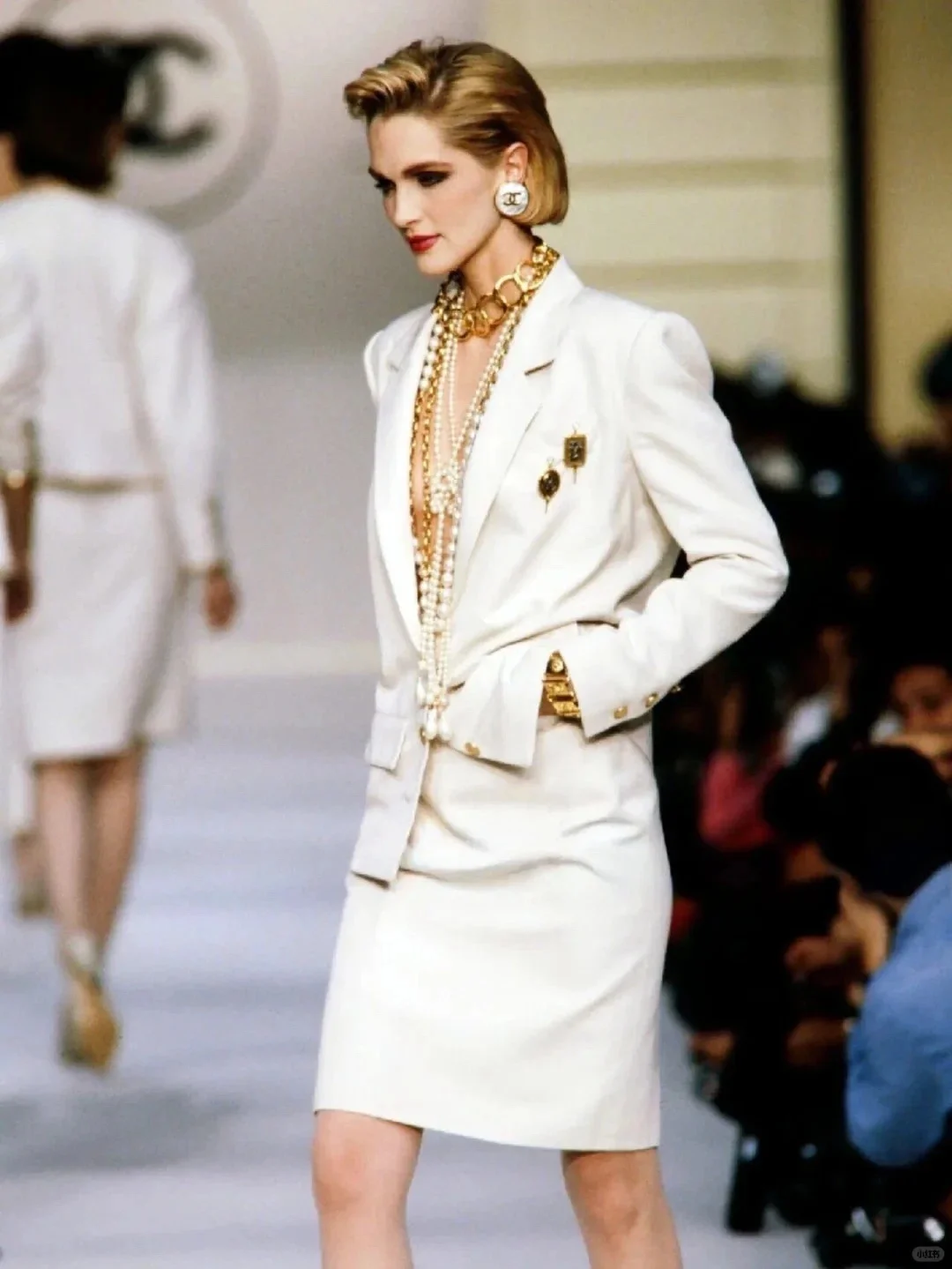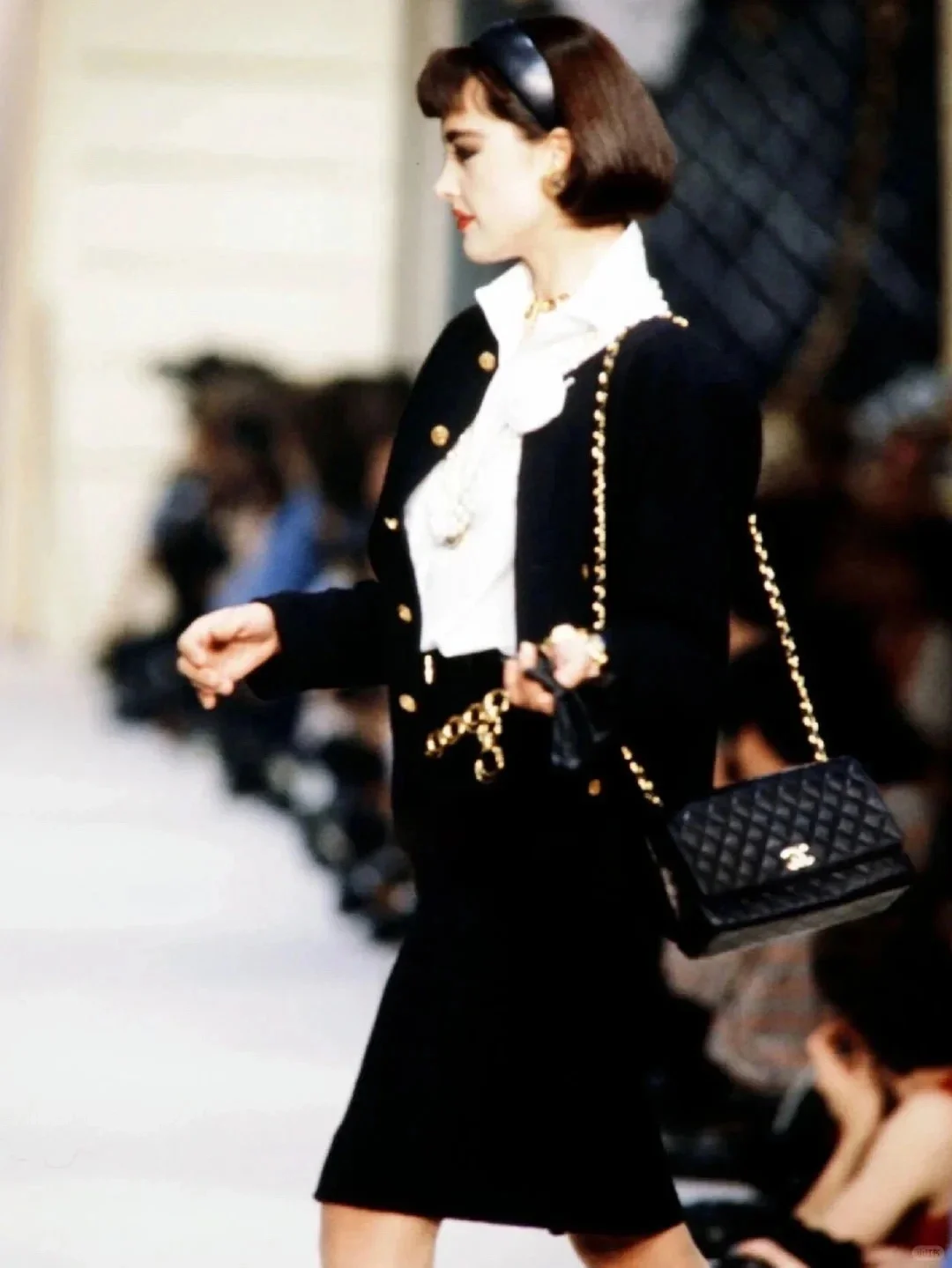 在这个全新系列中,经典的香奈儿套装再度回归收腰的设计。奥斯曼建筑风格的发布会现场令人想起康朋街香奈儿总部的外墙(多年后,香奈儿在巴黎大皇宫的玻璃穹顶下完全复刻了这条著名的街道, 见428-431页)。本季, 香奈儿标志性的菱格纹手袋、山茶花、双色鞋以及珍珠等风格元素均出现在整体造型中。