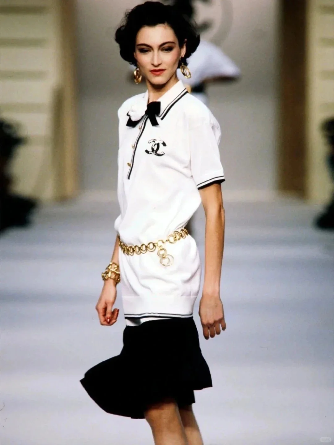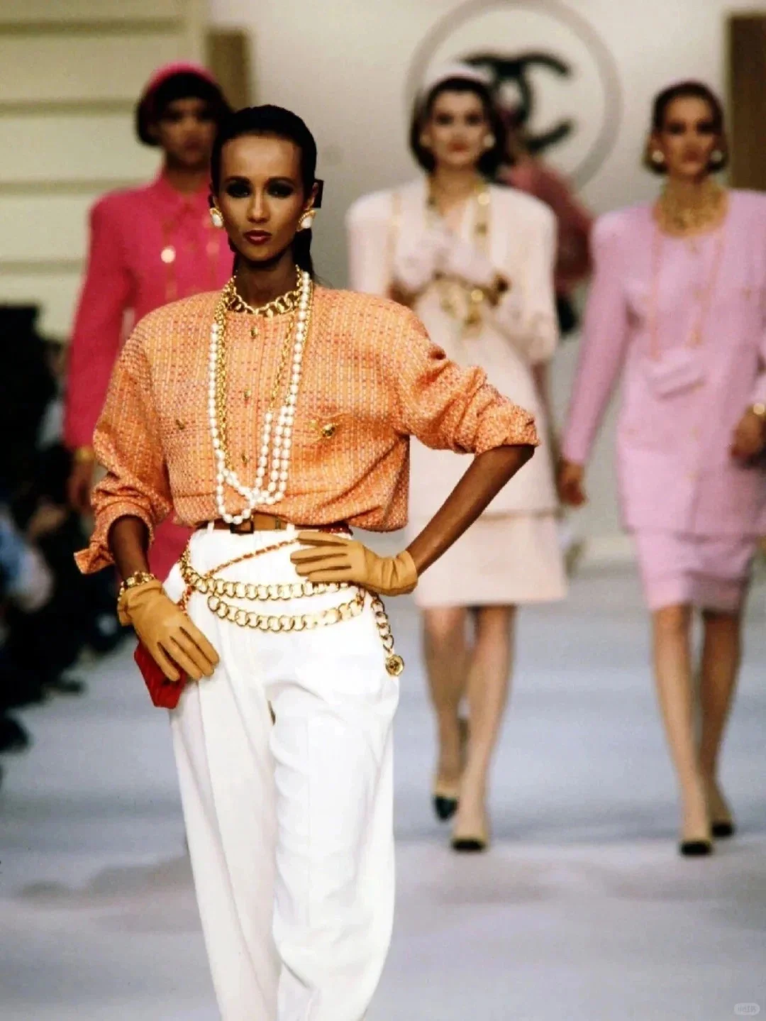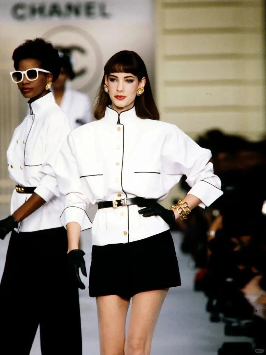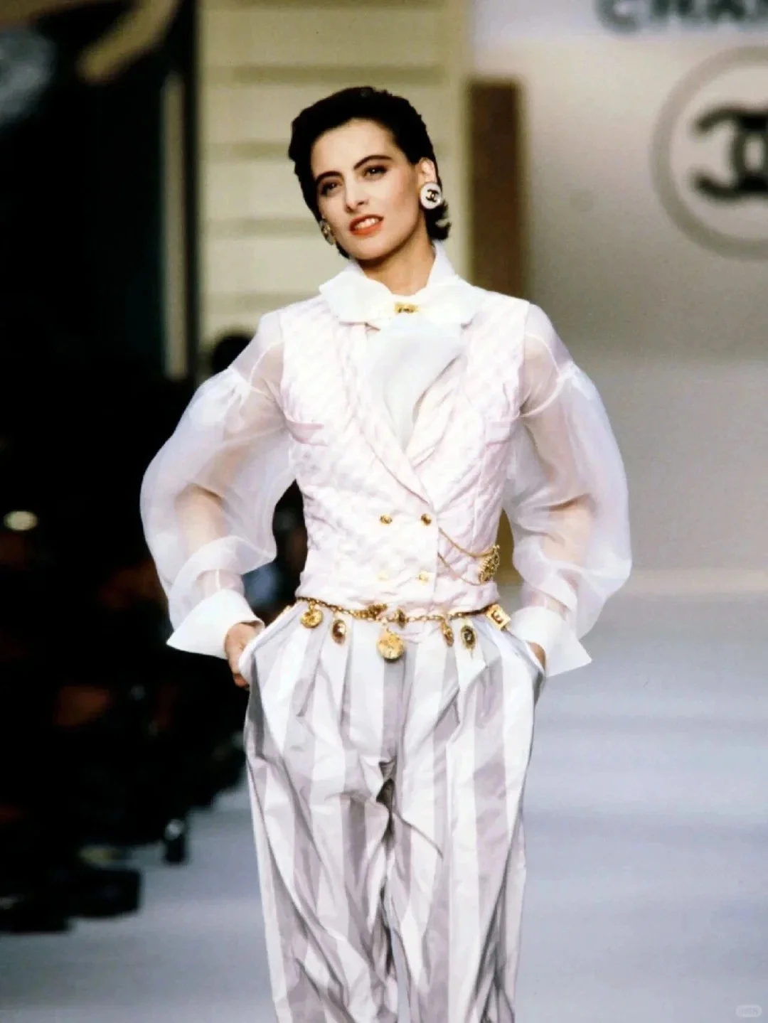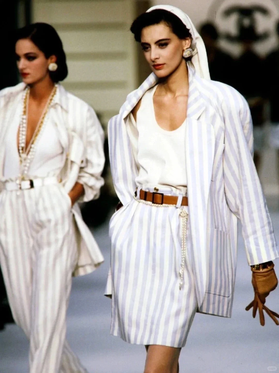 在这个全新系列中,经典的香奈儿套装再度回归收腰的设计。奥斯曼建筑风格的发布会现场令人想起康朋街香奈儿总部的外墙(多年后,香奈儿在巴黎大皇宫的玻璃穹顶下完全复刻了这条著名的街道, 见428-431页)。本季, 香奈儿标志性的菱格纹手袋、山茶花、双色鞋以及珍珠等风格元素均出现在整体造型中。