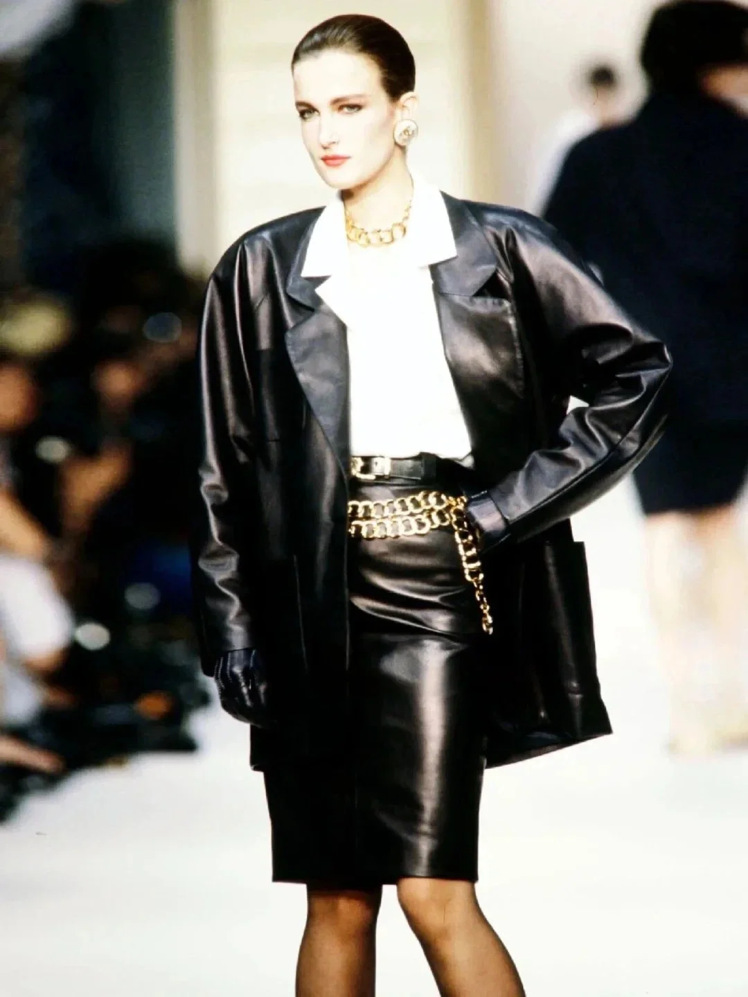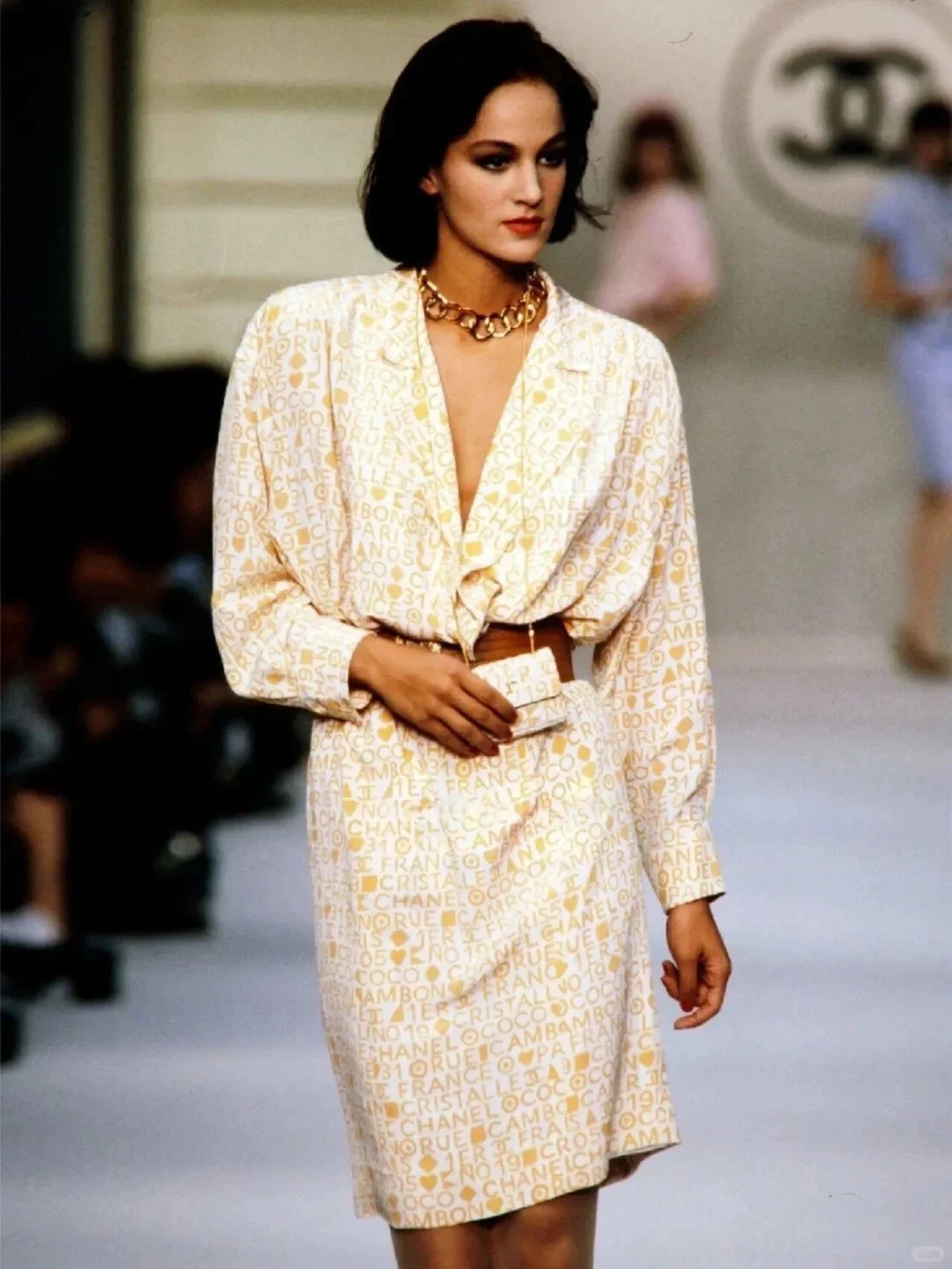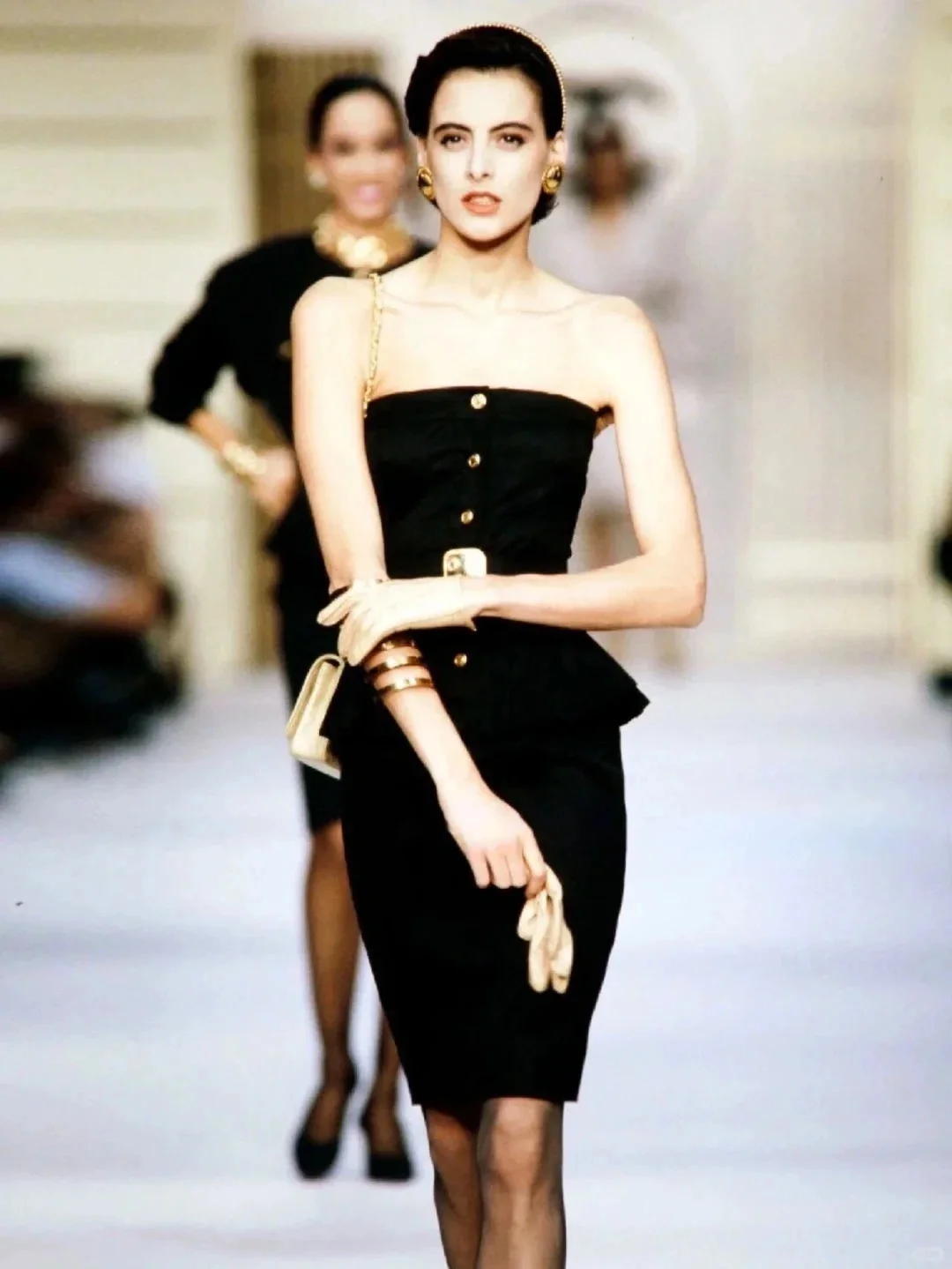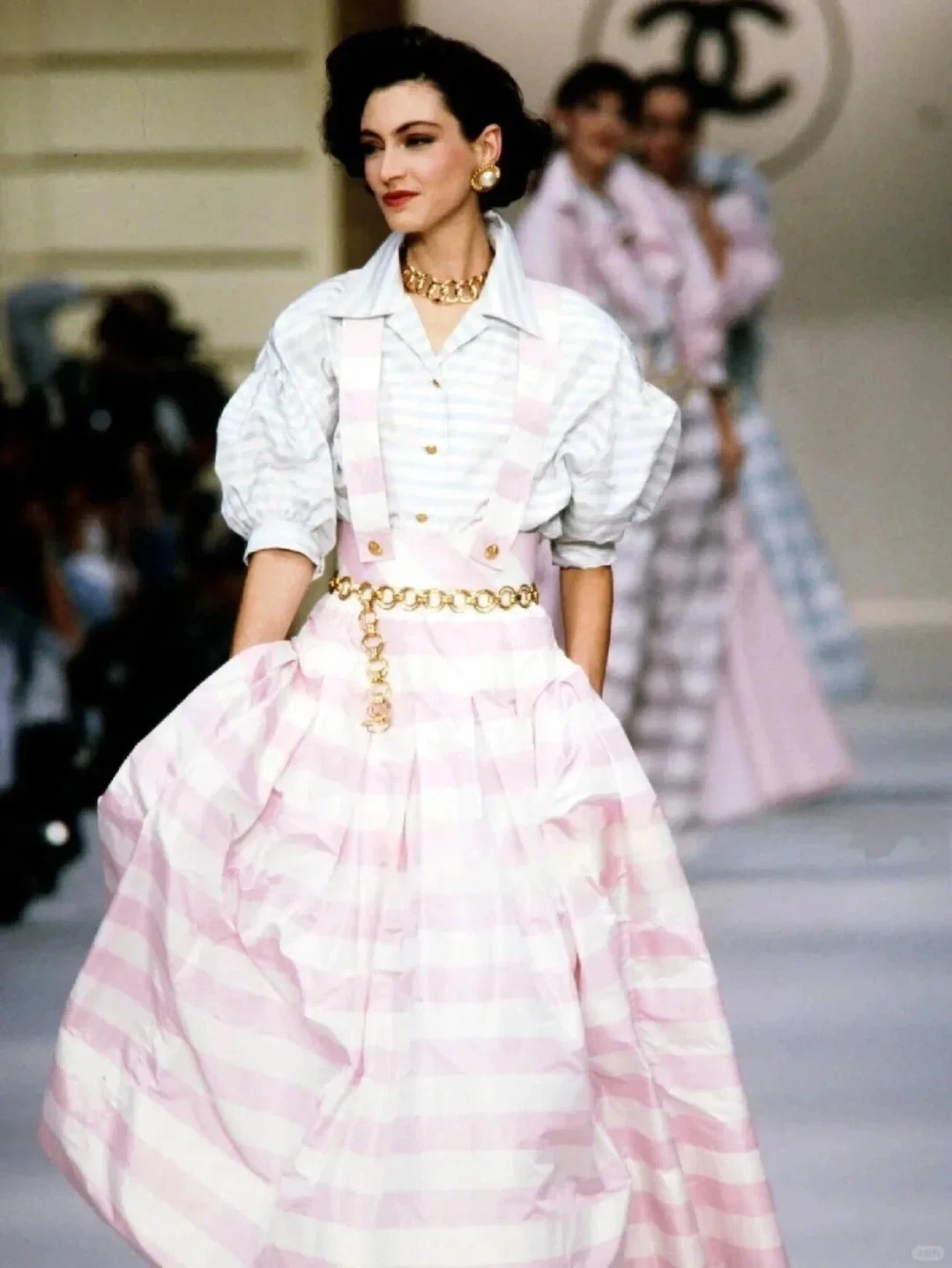 在这个全新系列中,经典的香奈儿套装再度回归收腰的设计。奥斯曼建筑风格的发布会现场令人想起康朋街香奈儿总部的外墙(多年后,香奈儿在巴黎大皇宫的玻璃穹顶下完全复刻了这条著名的街道, 见428-431页)。本季, 香奈儿标志性的菱格纹手袋、山茶花、双色鞋以及珍珠等风格元素均出现在整体造型中。