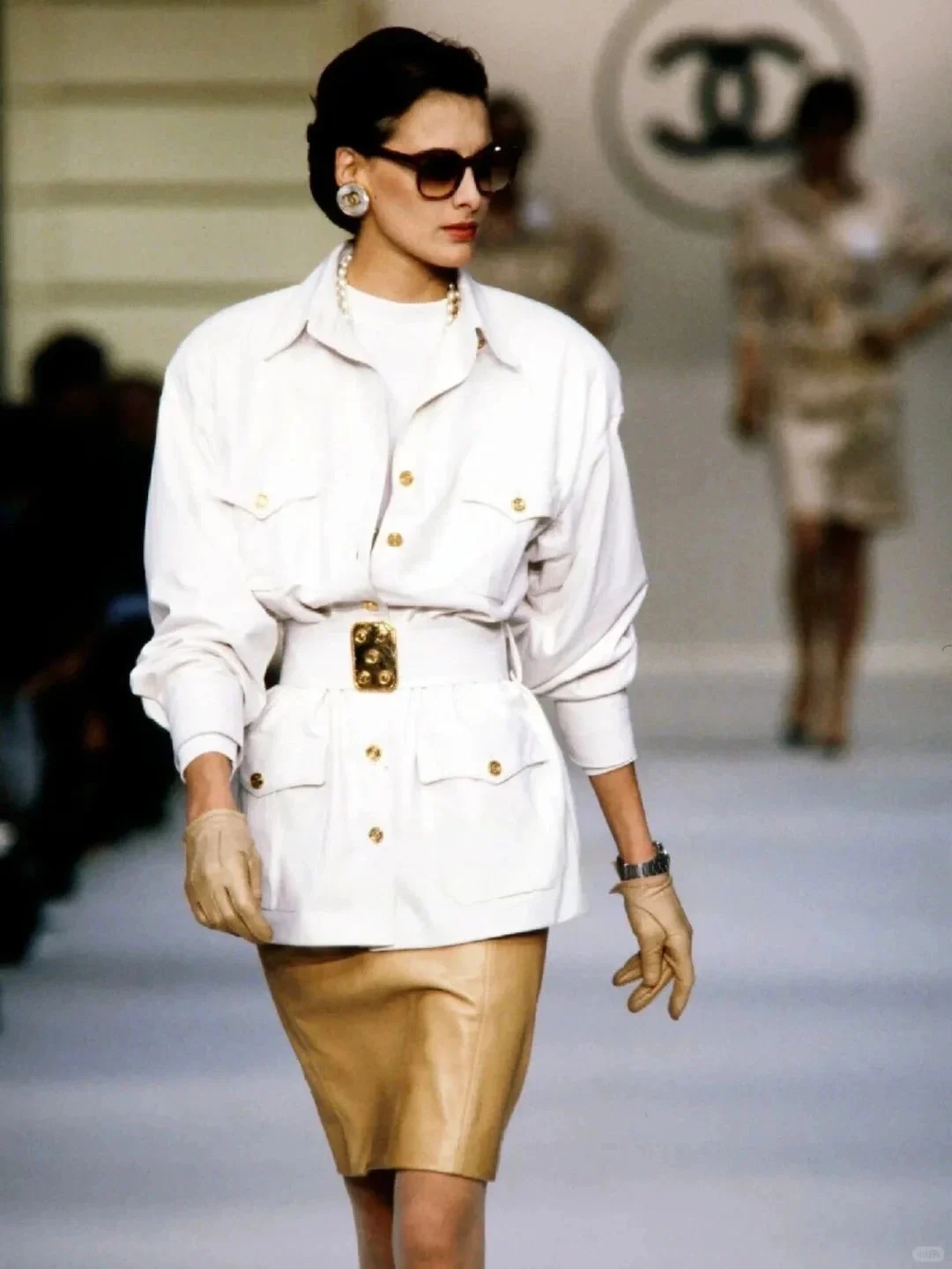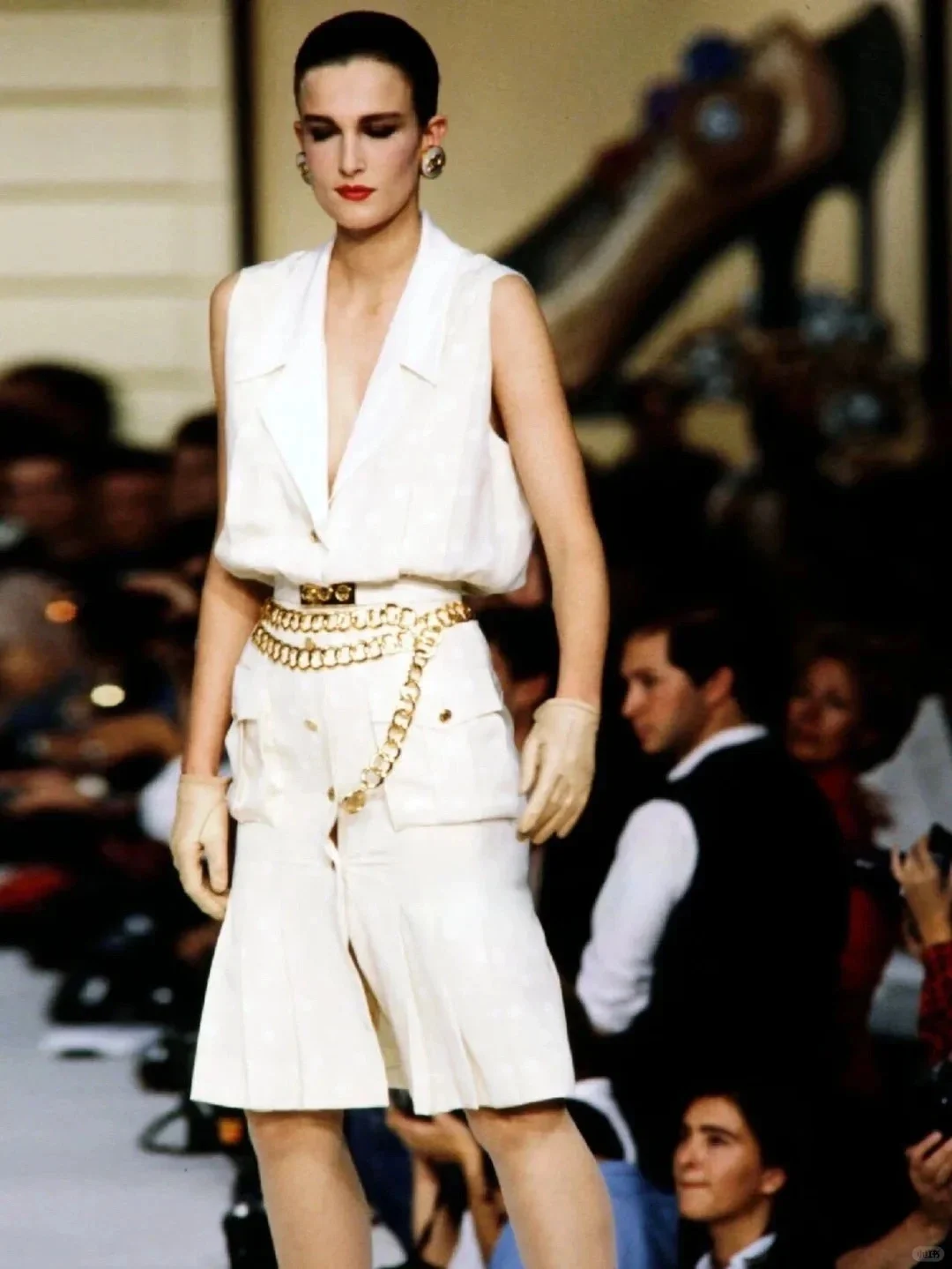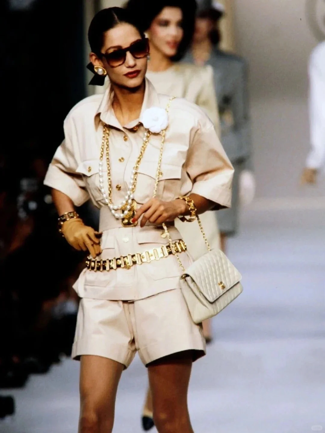 修长的外套搭配简约的白衬衫、都市感短裤或露膝铅笔半身裙。系列廓形以品牌的标志性颜色——黑色、海军蓝、米色与白色演绎。款式多样的金色服饰珠宝作品,无论是系在腰间或用作项链的金色链条,还是超大的金色纽扣、腰带和引人注目的双C标志耳环,都与每套造型完美呼应。