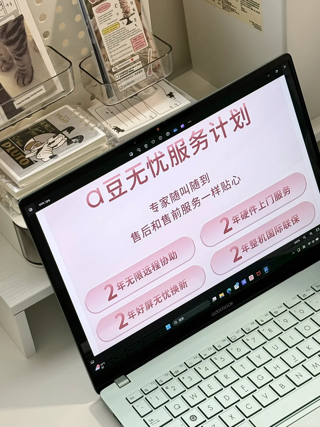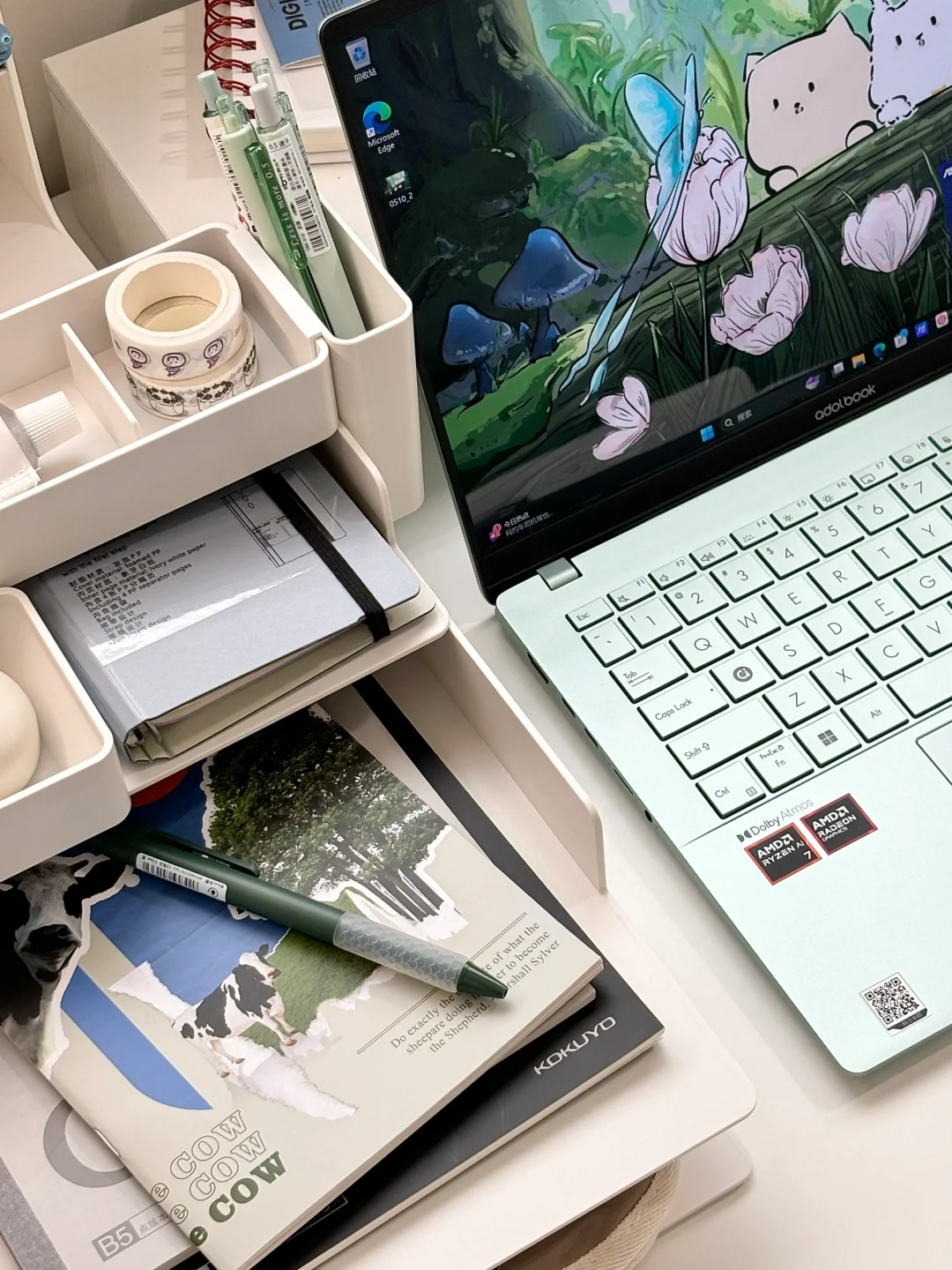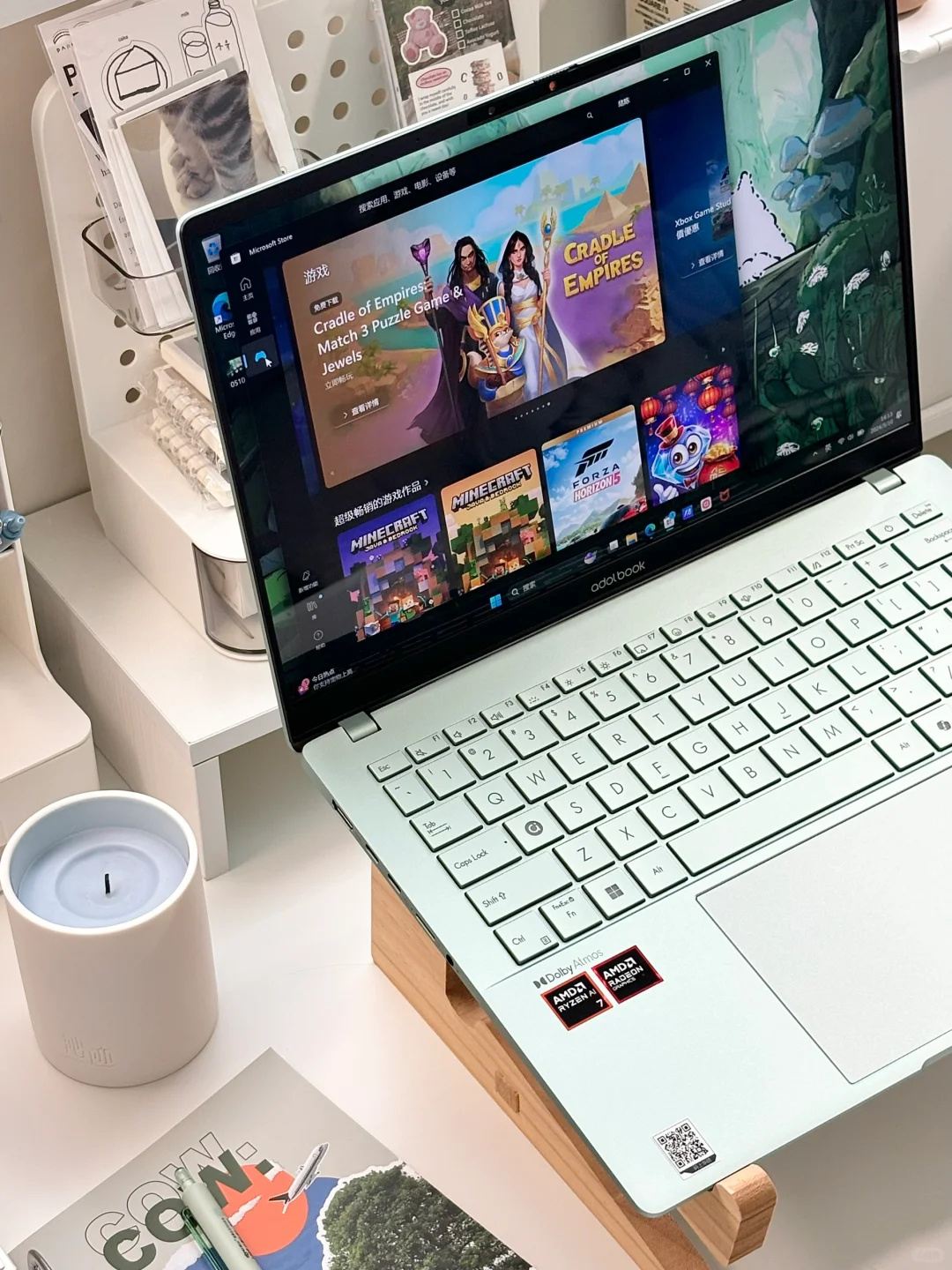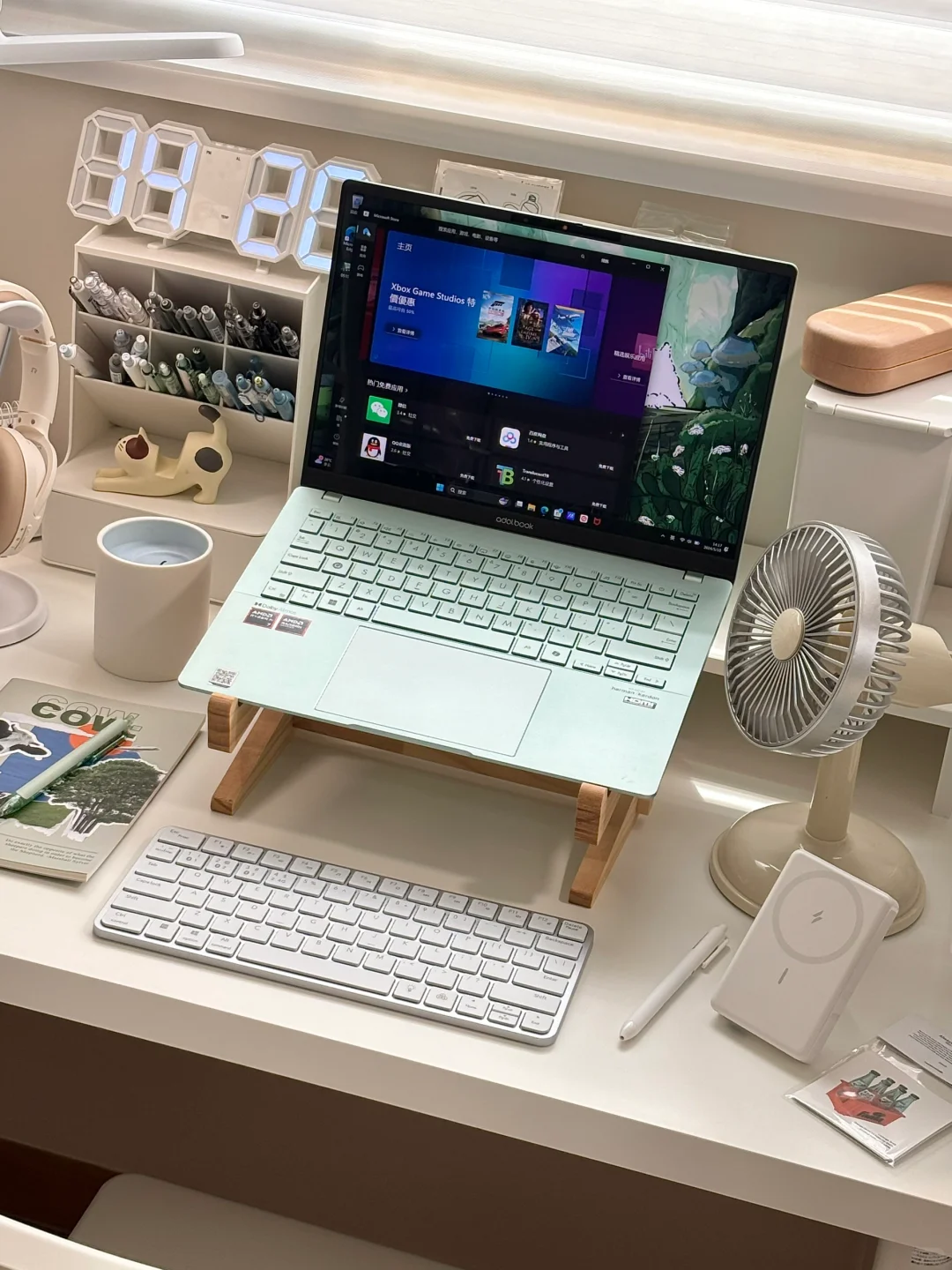 特别喜欢我的新笔记本电脑~这个鼠尾草青色越看越好看!让我整个桌面都变得清新了~充满夏天的味道🌿笔记本整体很轻薄只有1.29kg左右,最薄处只有13.9mm,相比我之前用过的轻薄本轻还要轻薄!!出门携带没有负担~而且它采用高性能处理器,超强悍!颜值实力共存!还有2.8K 120Hz OLED华硕好屏,屏幕质感超清晰!!不管是追剧、玩游戏、ps、剪视频都很丝滑❗️搭配自带的豆叮AI助手,让我的工作学习效率杠杠滴,还有“无忧服务”很放心!我的娱乐办公新晋小搭子~
