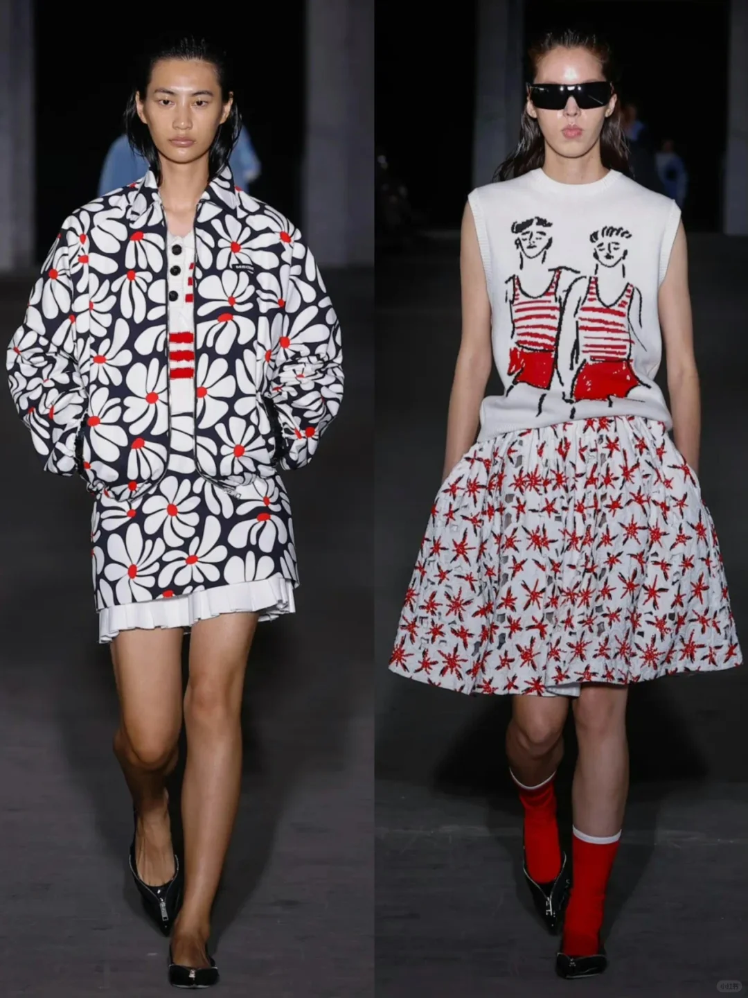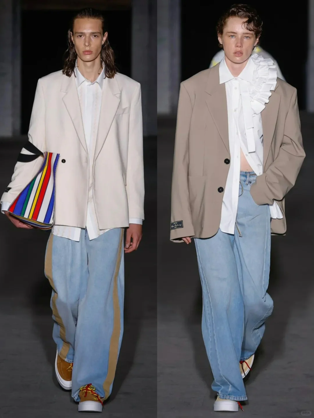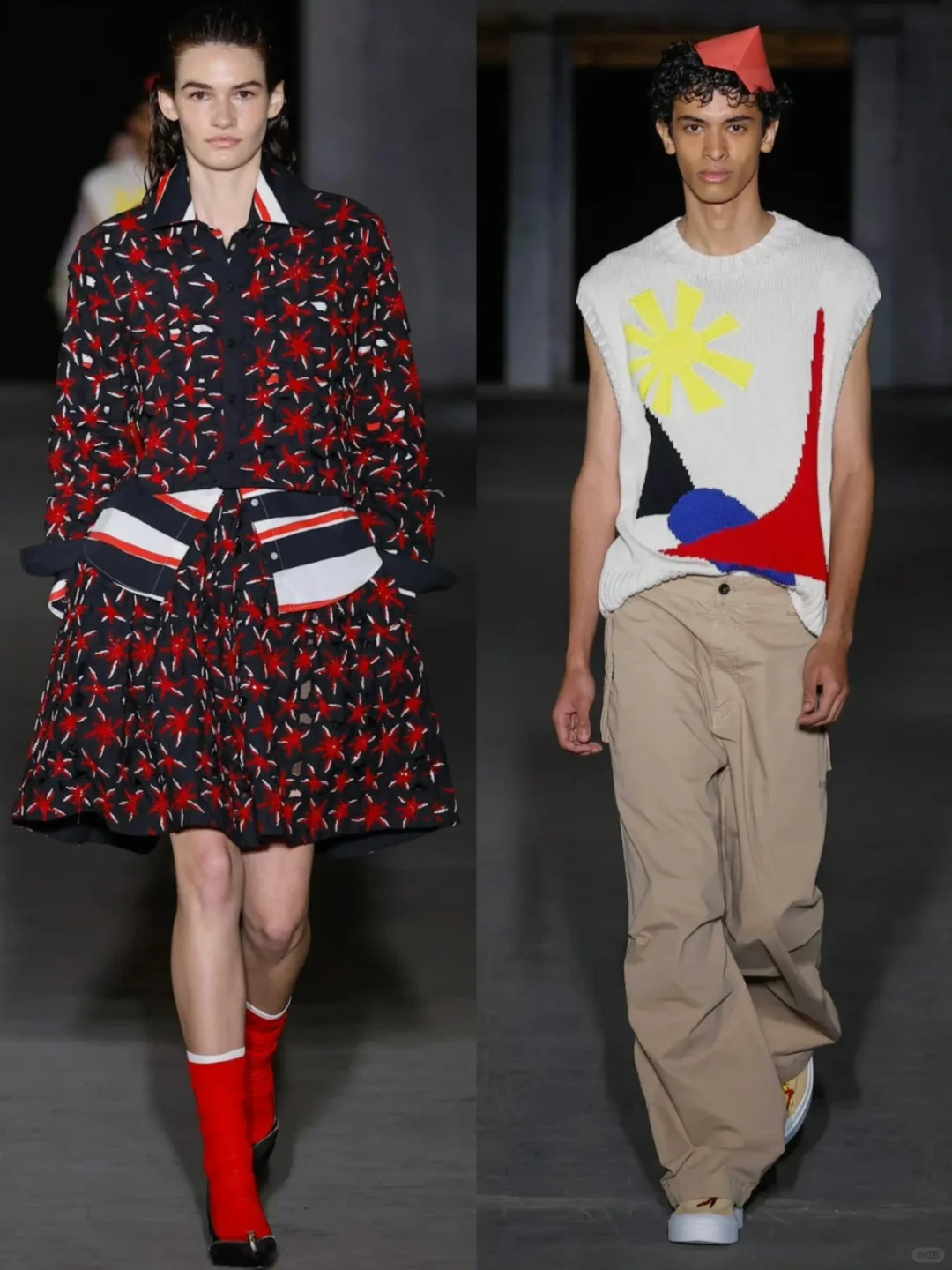 即便是在追求深邃色调与成熟剪裁的设计上,乔尔盖蒂依旧保持了一贯的随性态度,通过刺绣和彩色波浪图案的点缀,为服装增添了几分玩味。
