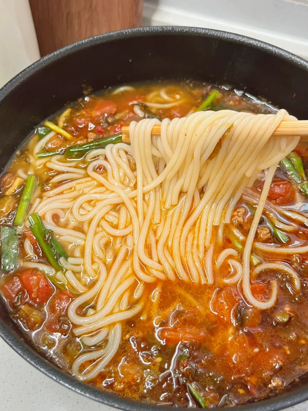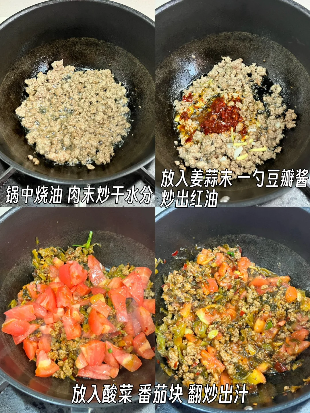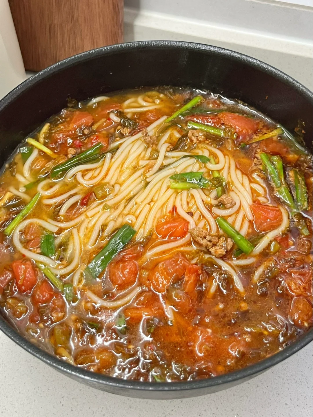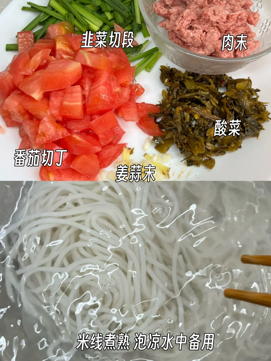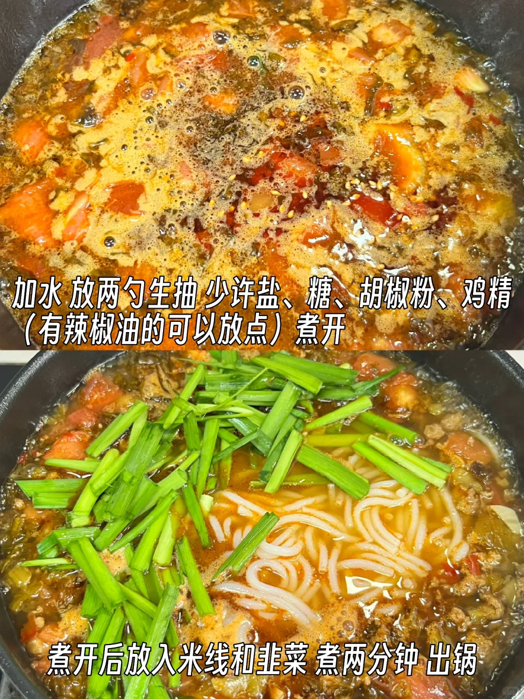好吃到连汤都不剩的小锅米线来咯! - 1️⃣米线煮熟,放凉水备用 2️⃣锅中烧油,肉末炒干水分,放姜蒜末,一勺豆瓣酱炒出红油 3️⃣放酸菜、番茄块炒出汁水,加足量水 4️⃣放两勺生抽、少许盐、糖,少许胡椒粉、鸡精大火煮开(有辣椒油的可以放点) 5️⃣放入米线和韭菜,煮两分钟,完成✅ -