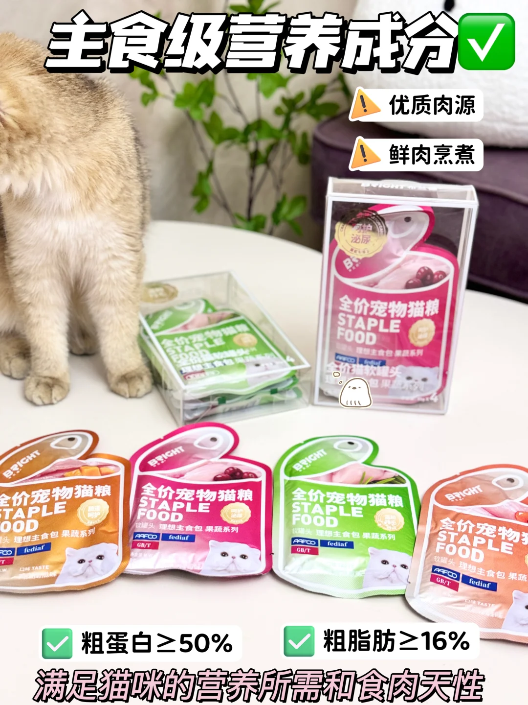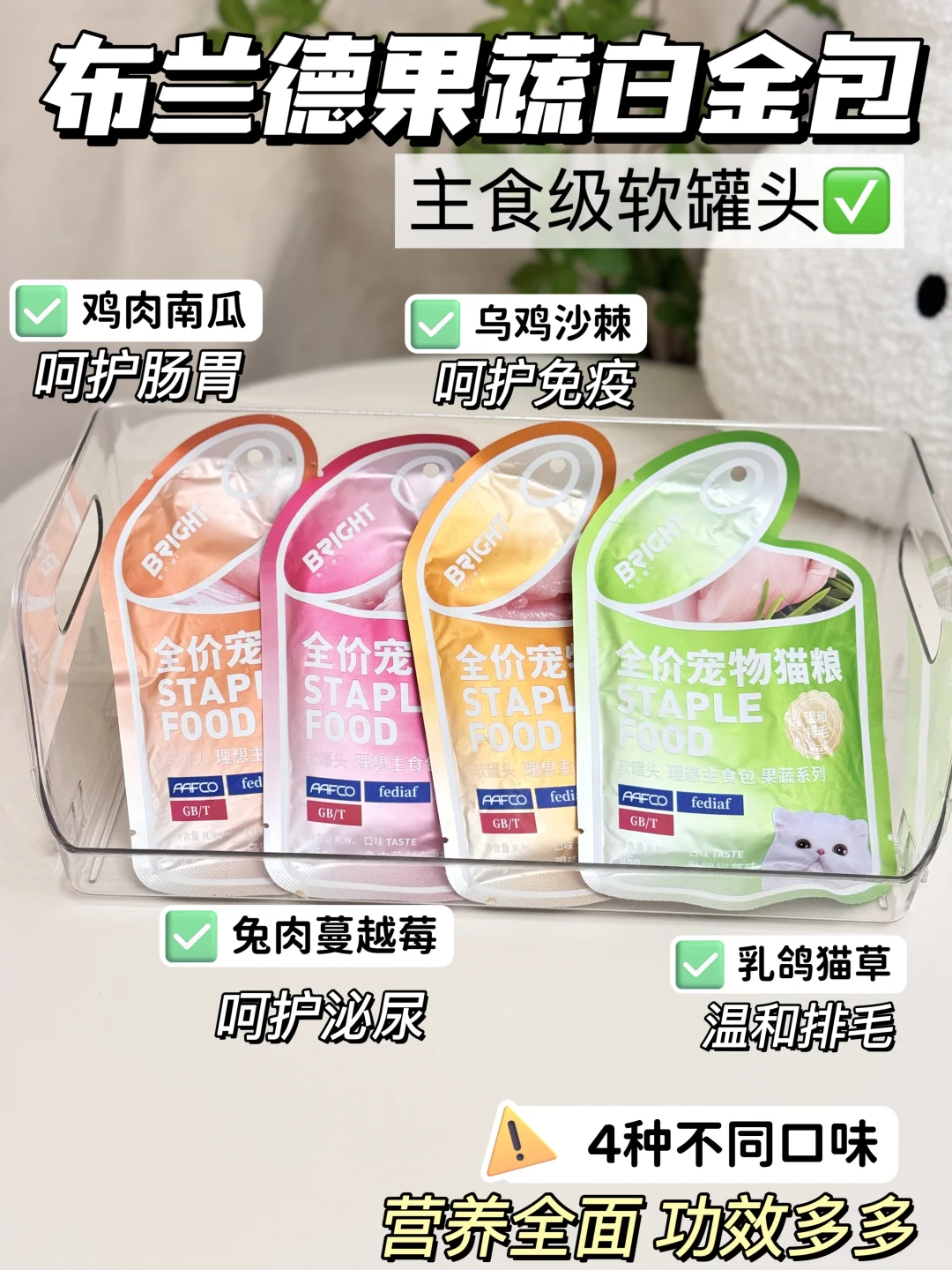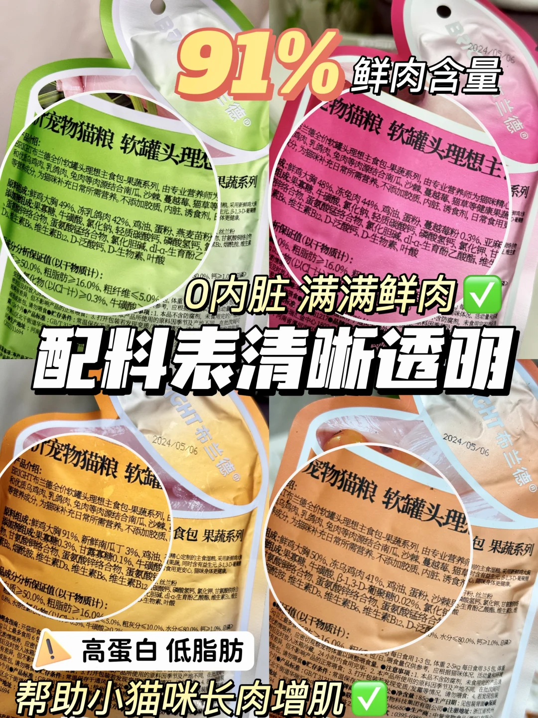 就是这个布兰德果蔬白金包,刚打开的时候我也被香住了,看了一下配料表,一包含肉量达到了91%,这让天生就爱吃肉肉的小猫咪怎么能拒绝🥩,但真正让适口性这么好的秘诀是纯鲜肉蒸煮,整体是细腻绵密的慕斯质地,这让毛孩子吃起来不费劲好消化,我家舔舔怪也能轻松吃到肉肉,怪不得不松嘴。营养方面靠谱,主食级的餐包,0内脏添加这点很好(市面很多罐头加了内脏适口性差且容易造成猫猫健康问题),让小猫咪吃到嘴里的都是实打实的鲜肉含水量高达75%,边吃边补水[派对R],也很适合夏天骗水,85g一包一餐不浪费同时它有4种口味,添加不同果蔬肉眼可见,有不一样的功能,简直比好多罐头都优秀!