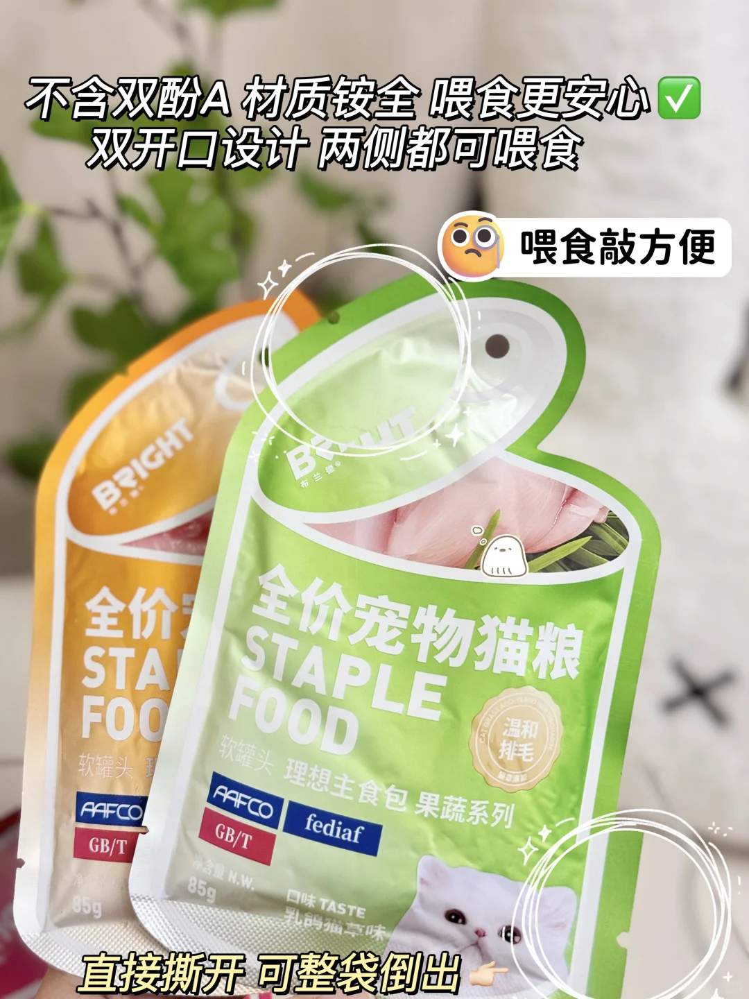鸡肉南瓜:富含膳食纤维和维生素,还有益生元,呵护肠胃,不软便兔肉蔓越莓:蔓越莓富含花青素,呵护猫猫的泌尿系统,小公猫必备~乌鸡沙棘:富含维生素C,沙棘被称为“天然维生素的宝库”,加强免疫力鸽肉猫草:添加猫草,促进肠蠕动的同时温和排毛比较细节一点的是包装,双开口设计📌,既能当猫条喂,又能倒出来大口吃,值得铲屎官们一试,而且材质更安全,不含双酚A,比普通那种铁罐好太多!