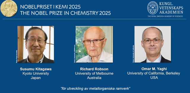 2025年诺贝尔化学奖揭晓,授予了日本京都大学教授北川进(Susumu Kitagawa)、澳大利亚墨尔本大学教授理查德·罗布森(Richard Robson)以及美国加州大学伯克利分校教授奥马尔·M·亚吉(Omar M. Yaghi)。
