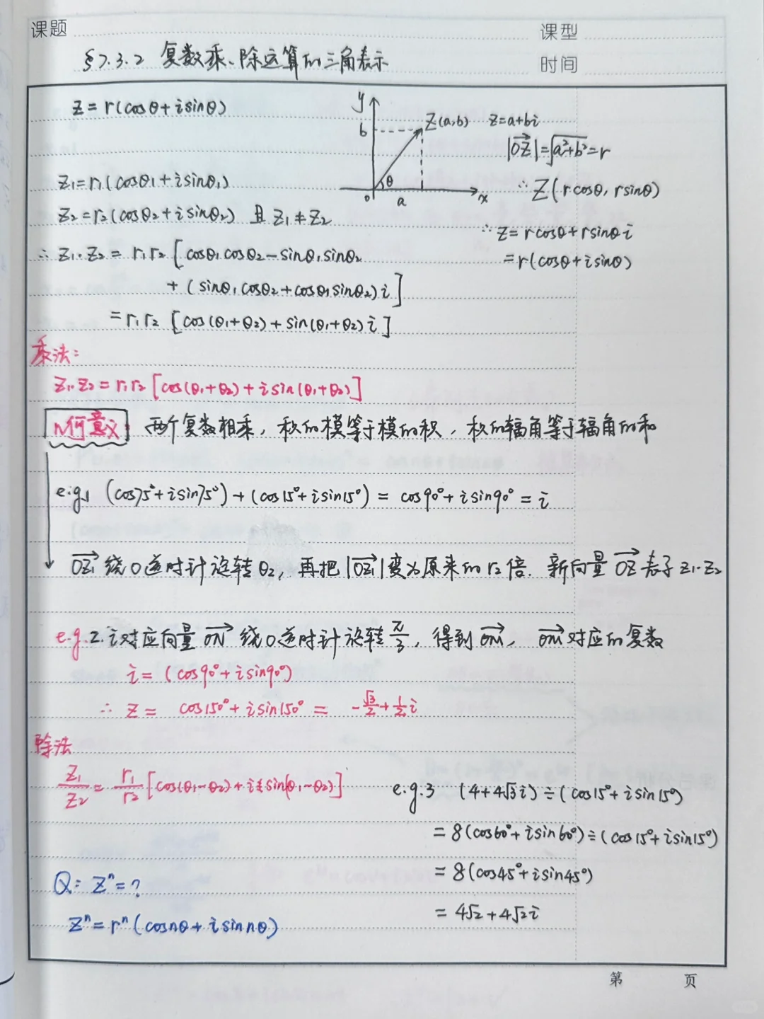 复数的三角形式这一节内容是带星号的,友友们,你们上课讲这一节没呢~ 如果从复数乘、除法的几何意义角度出发给学生讲,这一章的知识结构框架就清晰完整啦~ 我还准备给学生讲讲欧拉公式怎么推导出来的,有点大胆,想带着学生一点一点去理解这个上帝的公式!