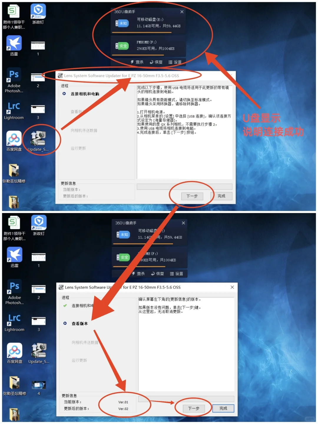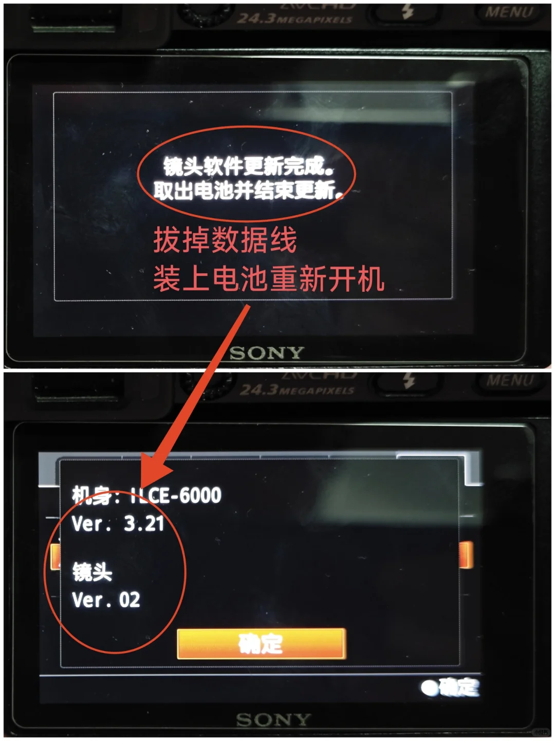 7️⃣电脑上点击『完成✅』→拔掉数据线→相机关机→装上电池→相机开机→查看当前镜头版本→显示镜头版本Ver.02→升级成功 如图8️⃣