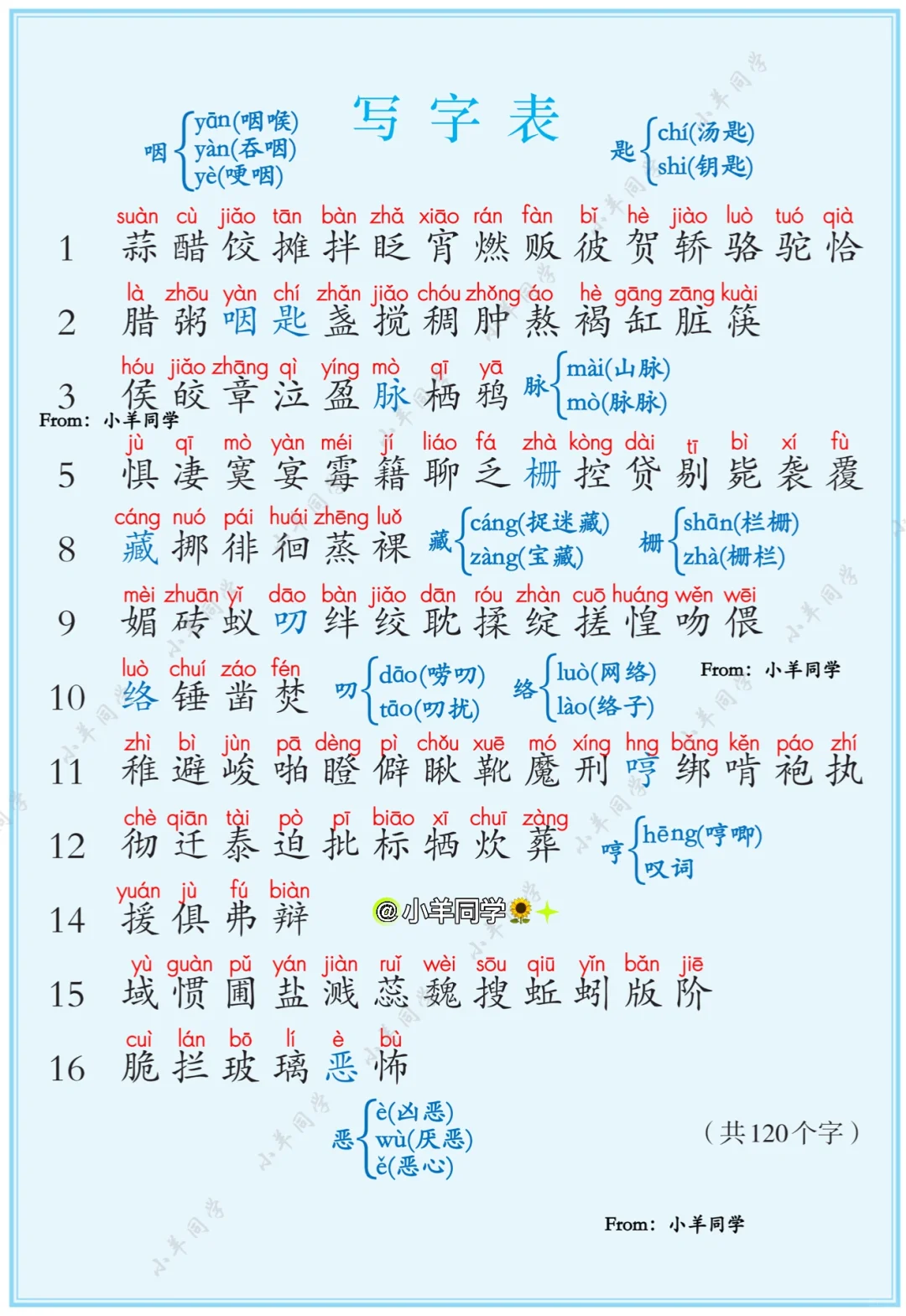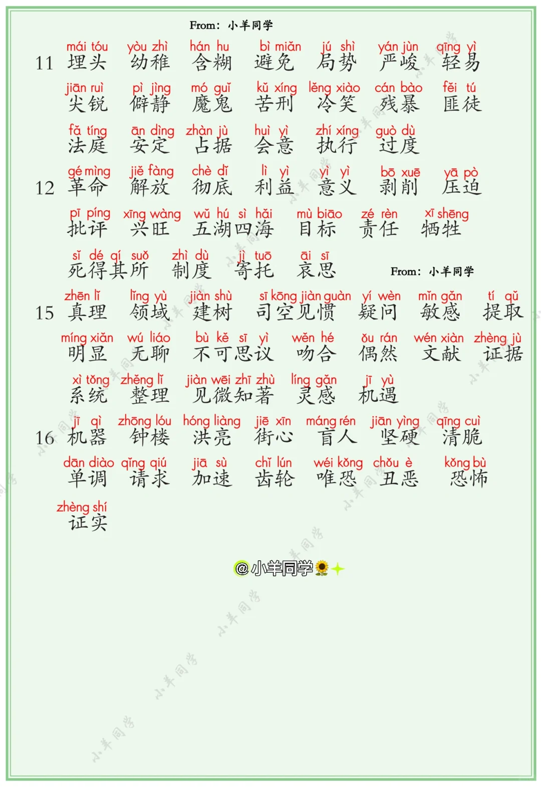 六下没有识字表,目前1-6年级下册所有的词语表、识字表、生字表注音全部完成了,需要的同学直接保存图片即可,我发的全部都是完整版,整理不易,请勿转载,取图的同学记得留言支持一下小羊哦~