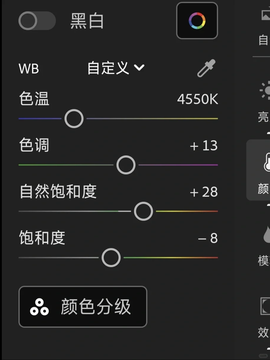 ◐ 自然饱和度:+28(环境色彩更鲜艳看一些)