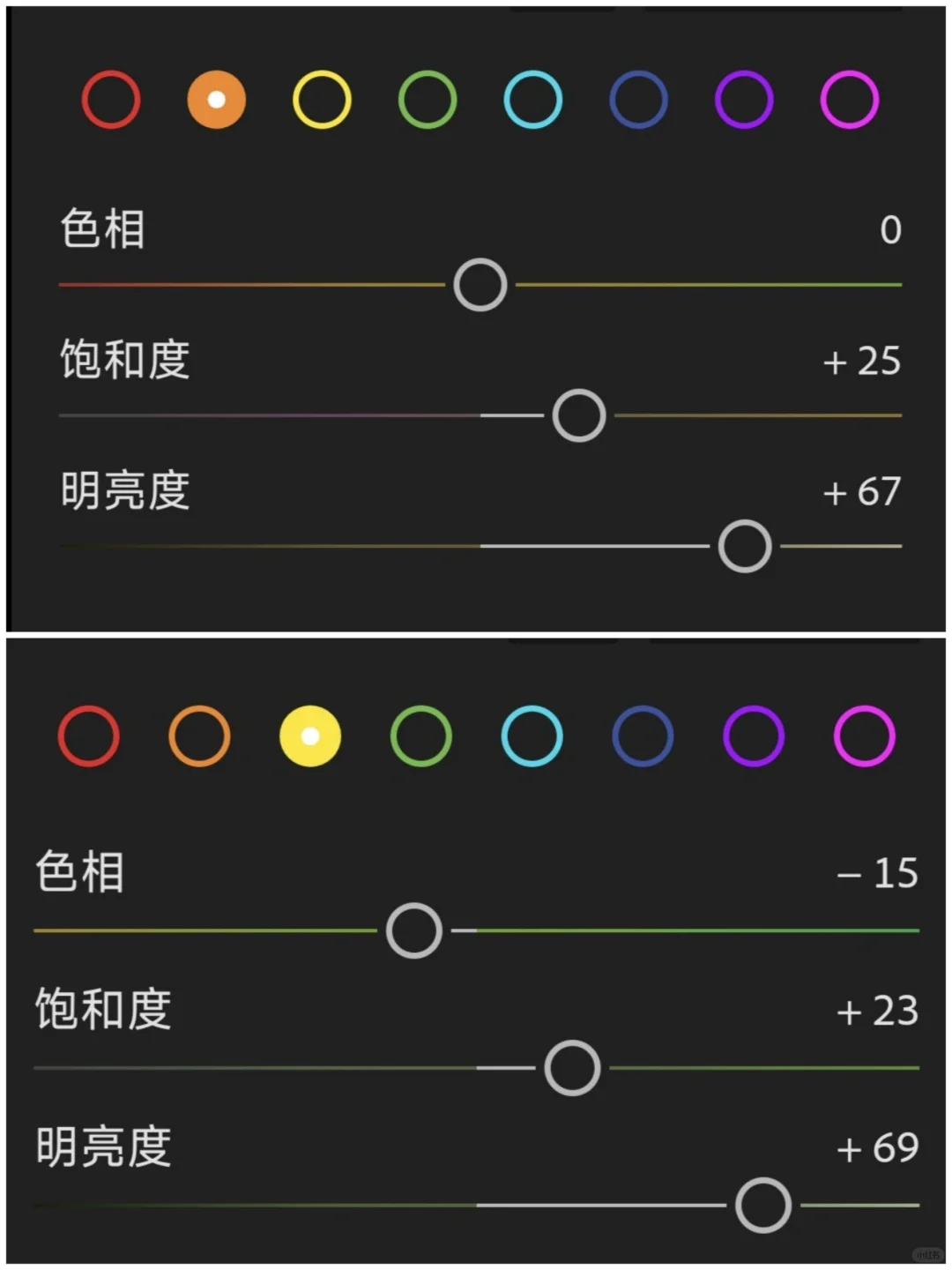(黄色和橙色是画面的主色调,提高黄色和橙色饱和度和亮度。让画面主体更好的展现)