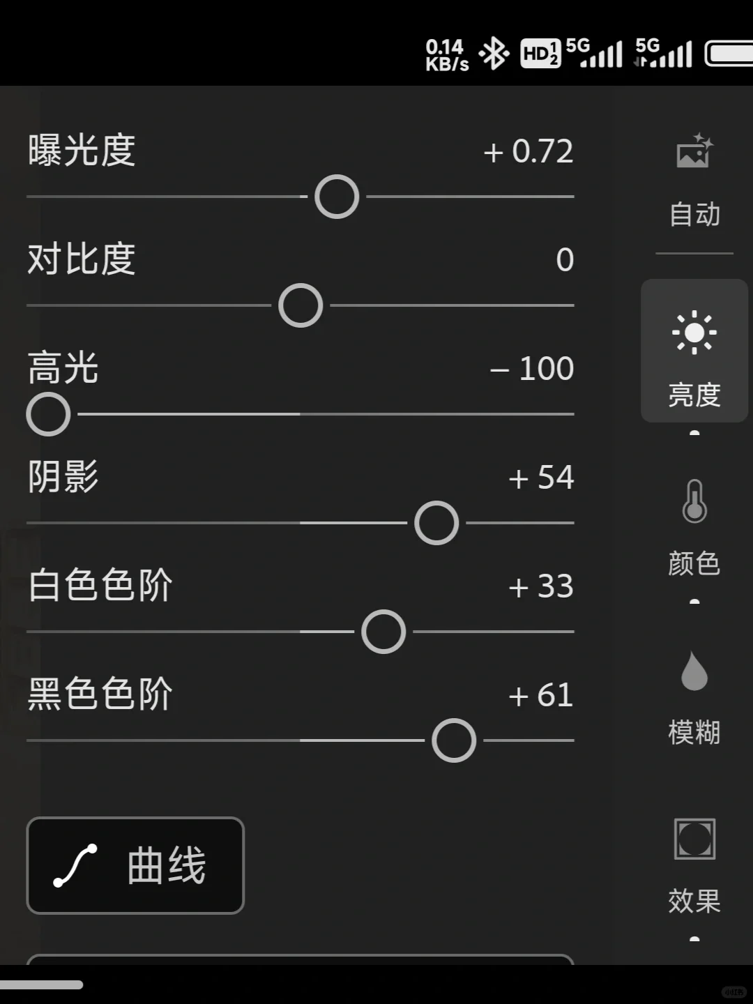 ◐ 曝光度:+0.72 (画面整体偏暗,提高整体曝光度)