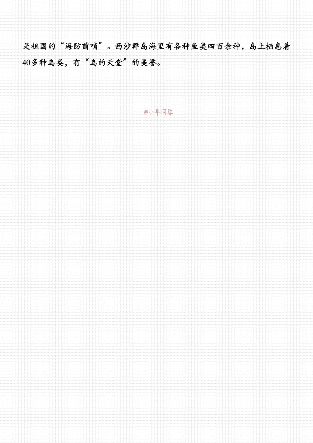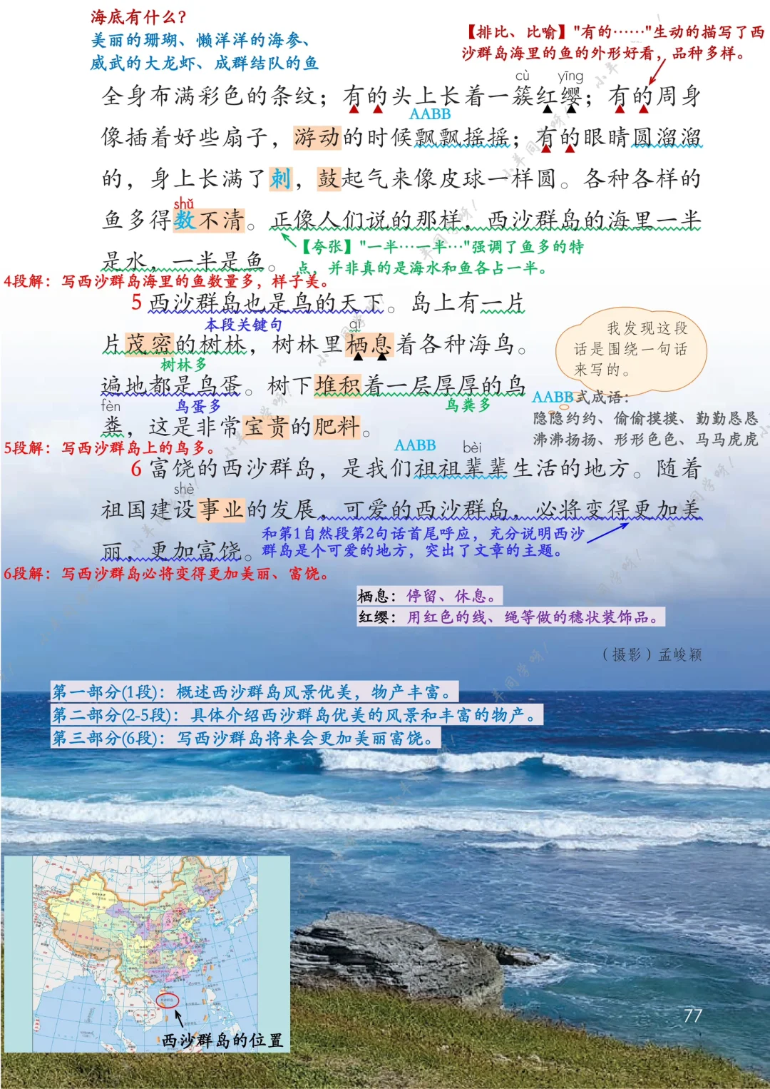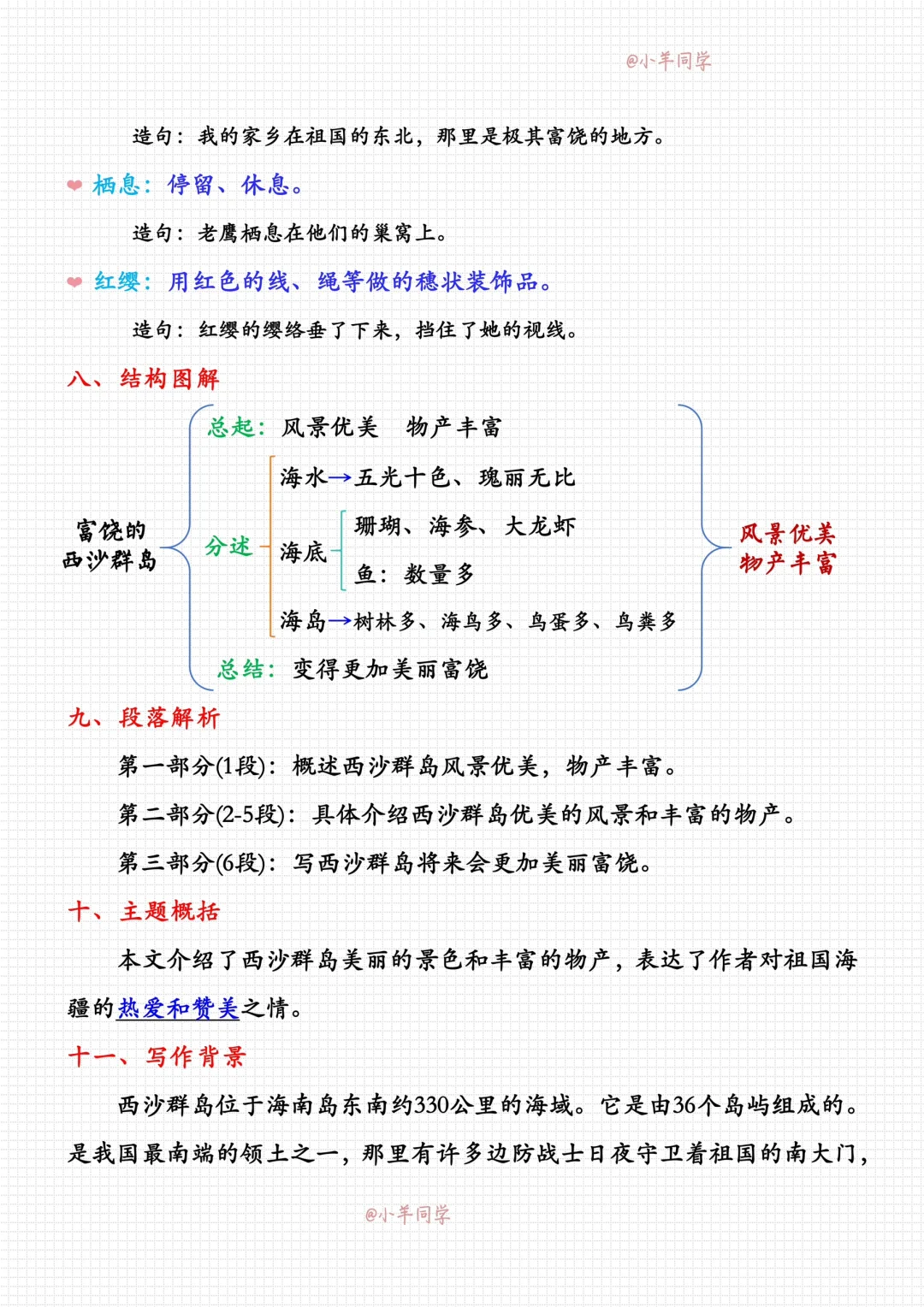本文介绍了西沙群岛美丽的景色和丰富的物产,表达了作者对祖国海疆的热爱和赞美之情。