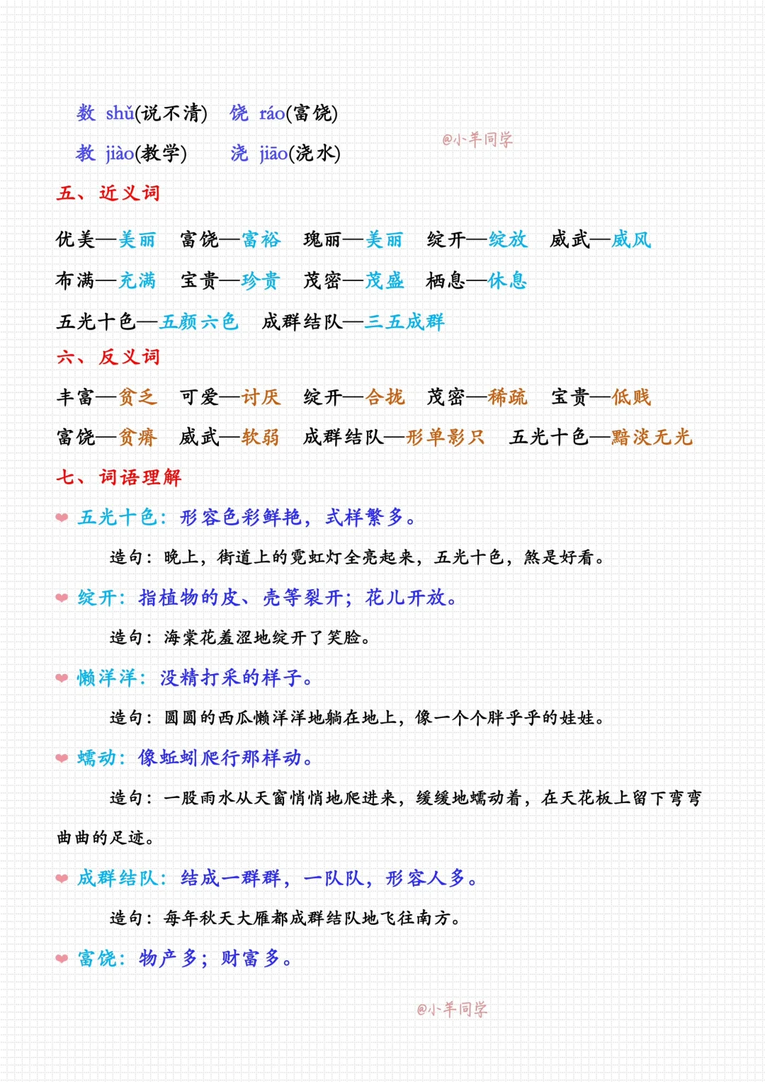 优美—美丽 富饶—富裕 瑰丽—美丽 绽开—绽放