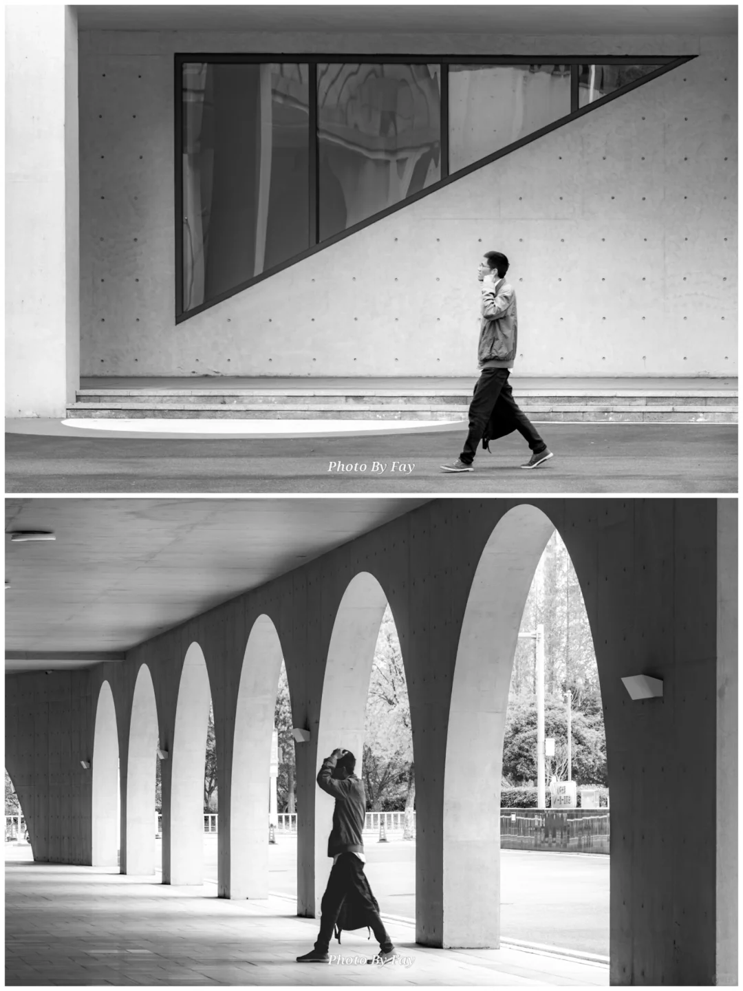 图9️⃣下 半圆形门框和地面的光影形成引导线和框架,抓拍路人走在框架里