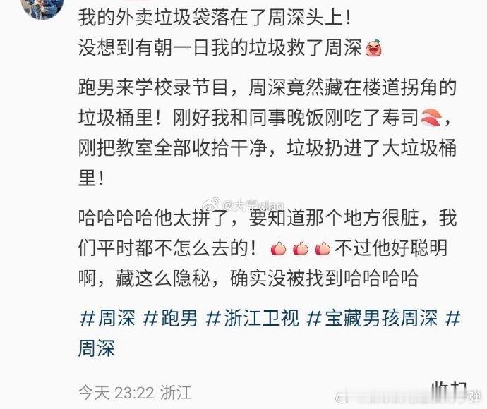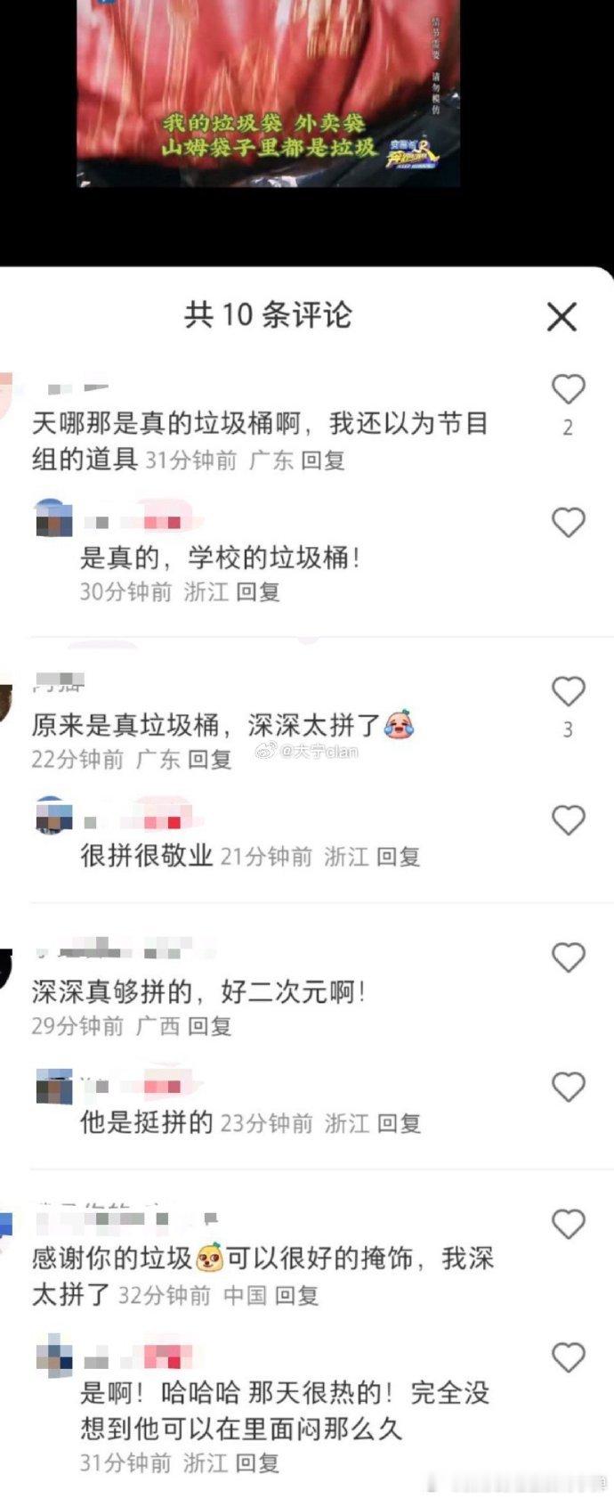 #我的外卖垃圾落到了周深头上# 在《奔跑吧》里,周深的拼命程度让人惊叹!以垃圾桶为藏身之处,承受着真垃圾落在头上的状况,却依然能够稳定发挥。他用实际行动证明了自己的努力和对节目的投入,着实令人佩服!