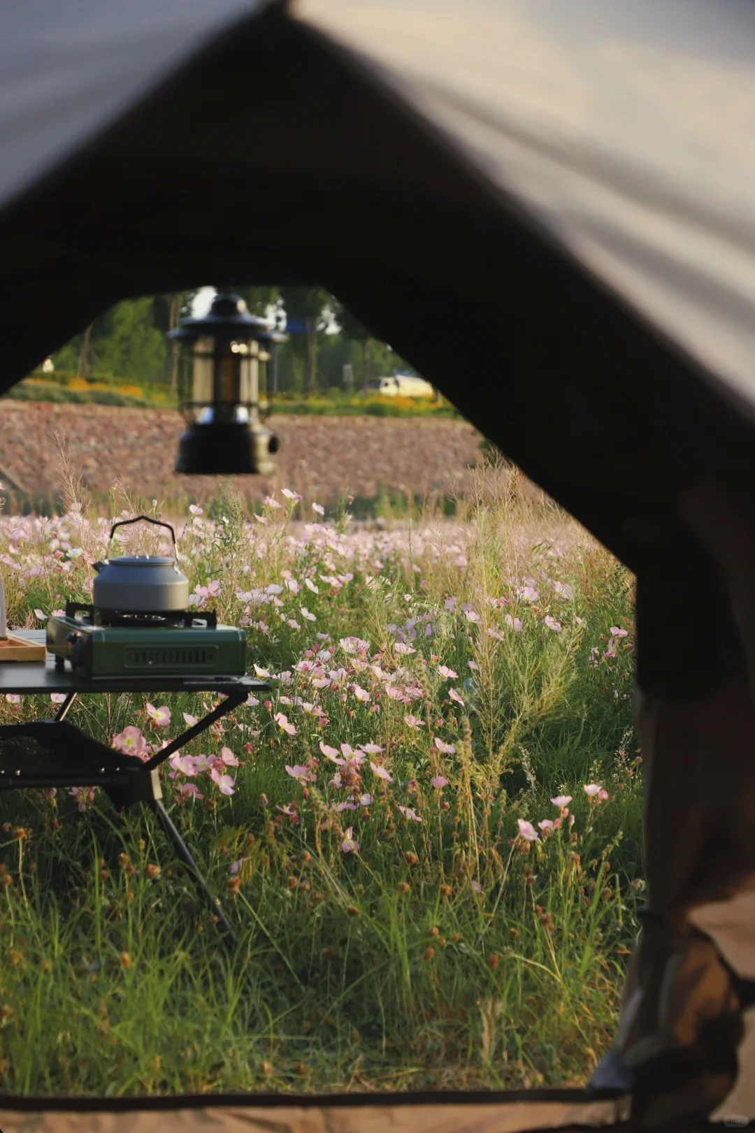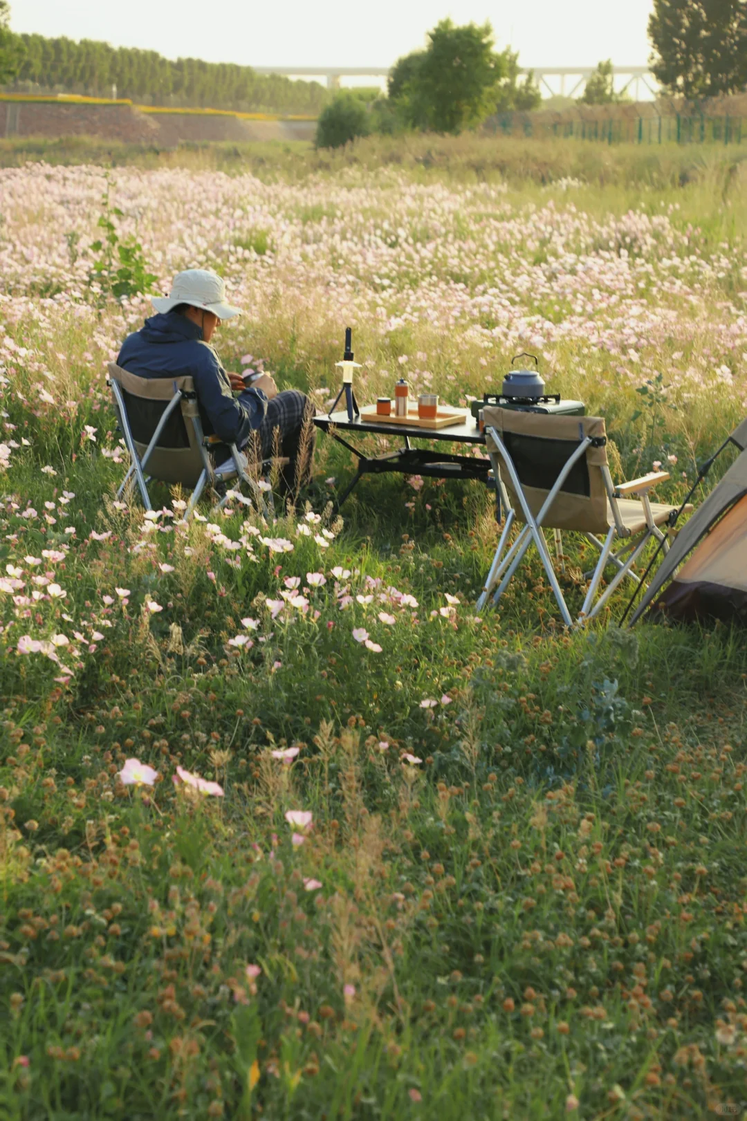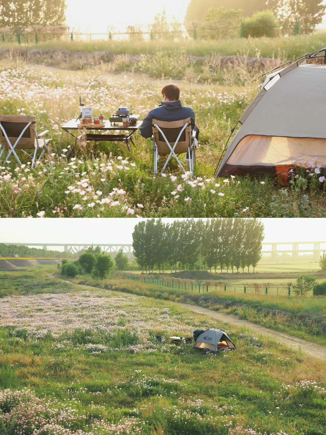 ▫️带了一套便携的轻量化露营桌椅,从大堤上可以下到滩地的花海里,在夕阳的花海里静等一场日落,-