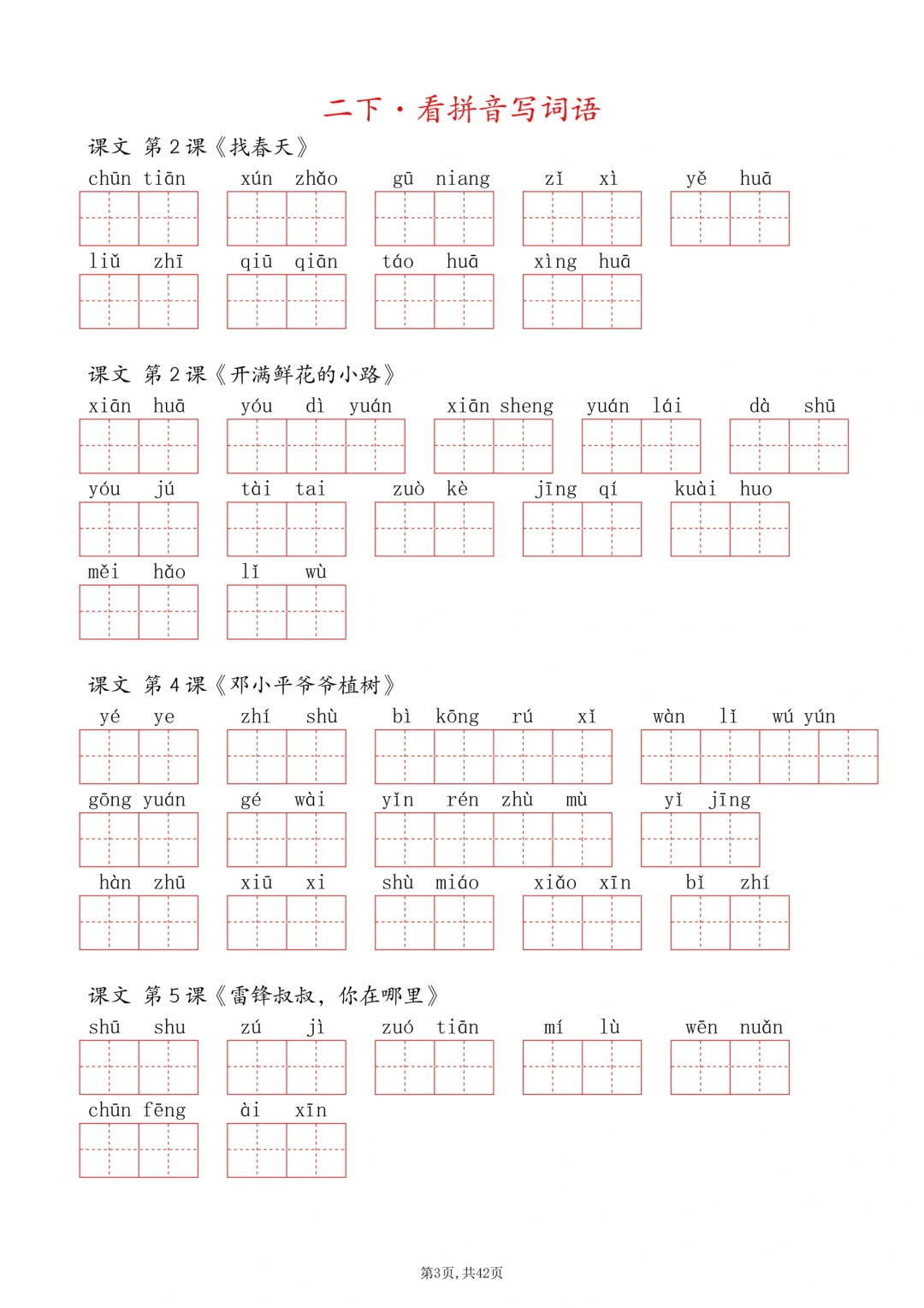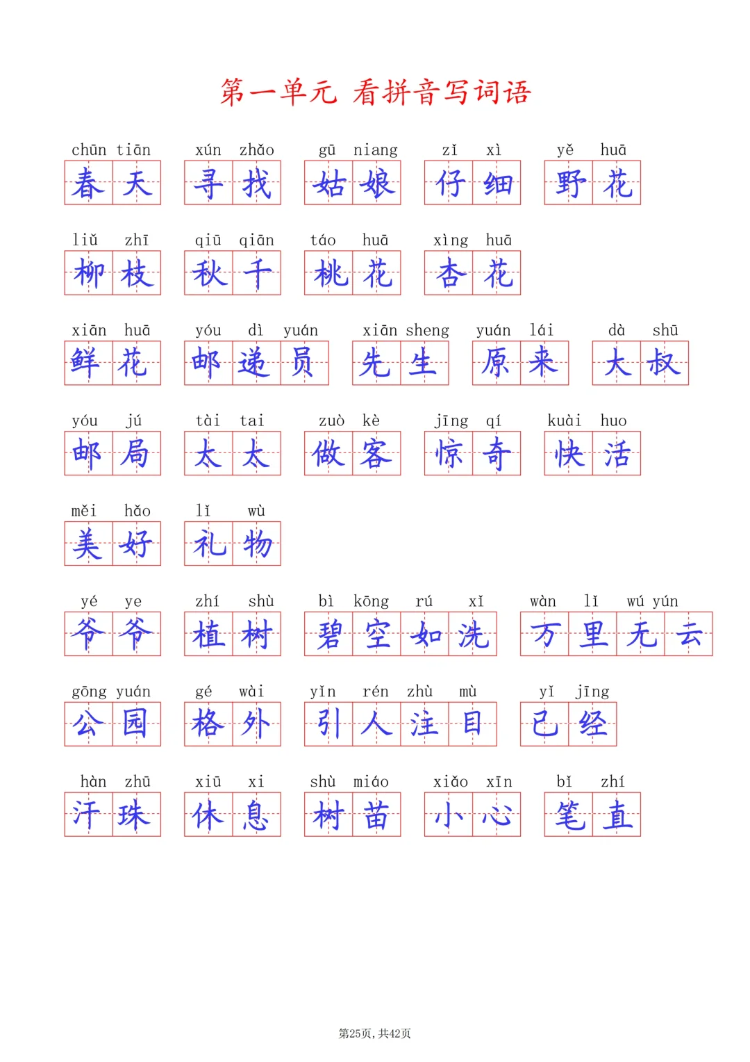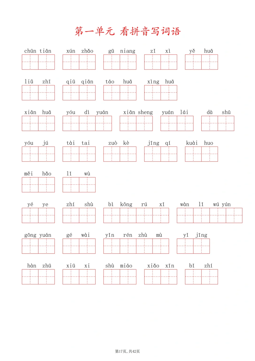 内容: 1️⃣课后词语表(答案) 2️⃣看拼音写词语 3️⃣写字表+识字表注音 4️⃣古诗词默写 5️⃣单元看拼音写词语表 ⚠️:注音没有答案,全部是课后写字表识字表的字;古诗词默写也没有答案,都是课本内容。 ⚠️:一共42页。