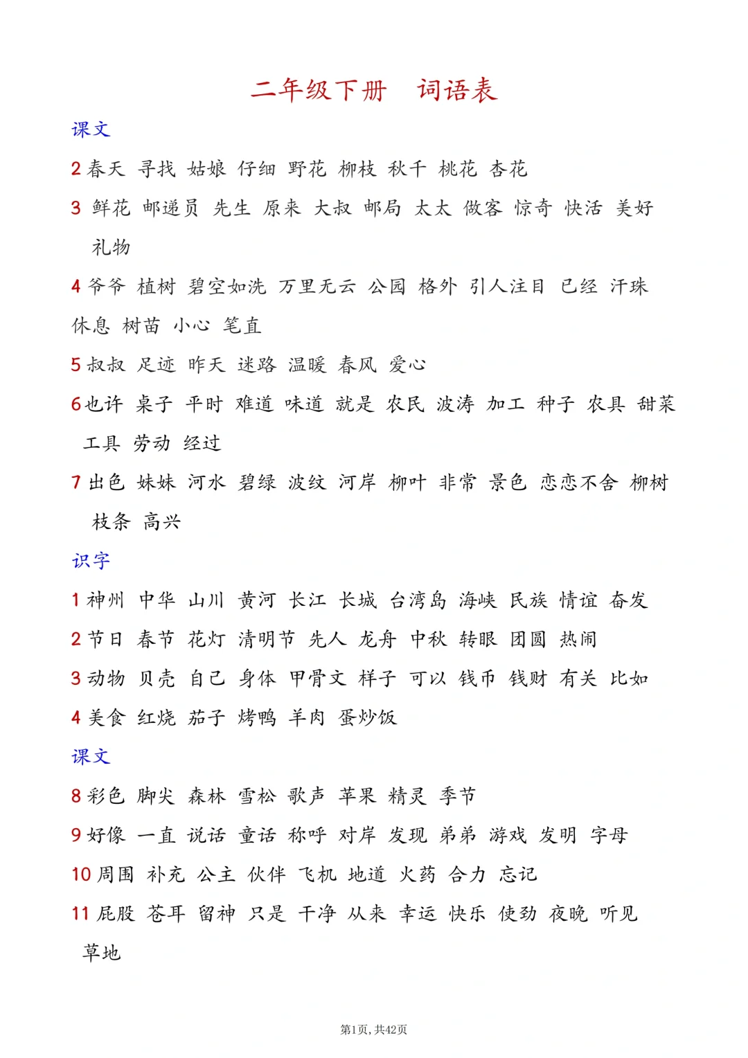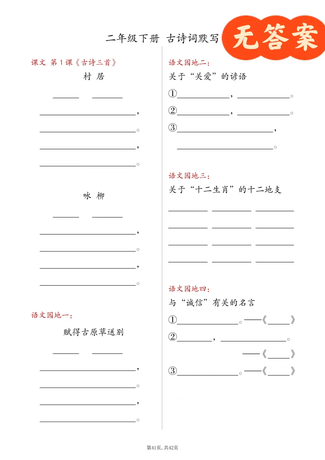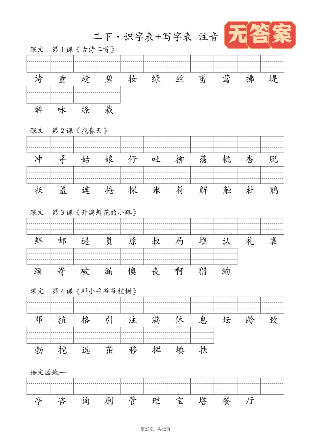 内容: 1️⃣课后词语表(答案) 2️⃣看拼音写词语 3️⃣写字表+识字表注音 4️⃣古诗词默写 5️⃣单元看拼音写词语表 ⚠️:注音没有答案,全部是课后写字表识字表的字;古诗词默写也没有答案,都是课本内容。 ⚠️:一共42页。