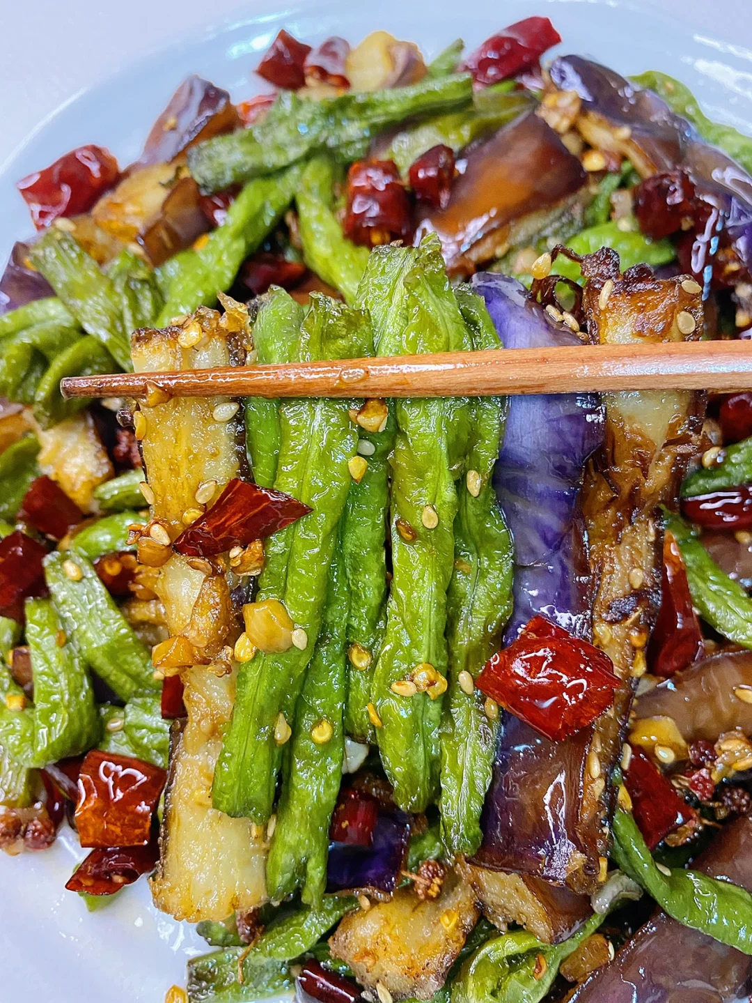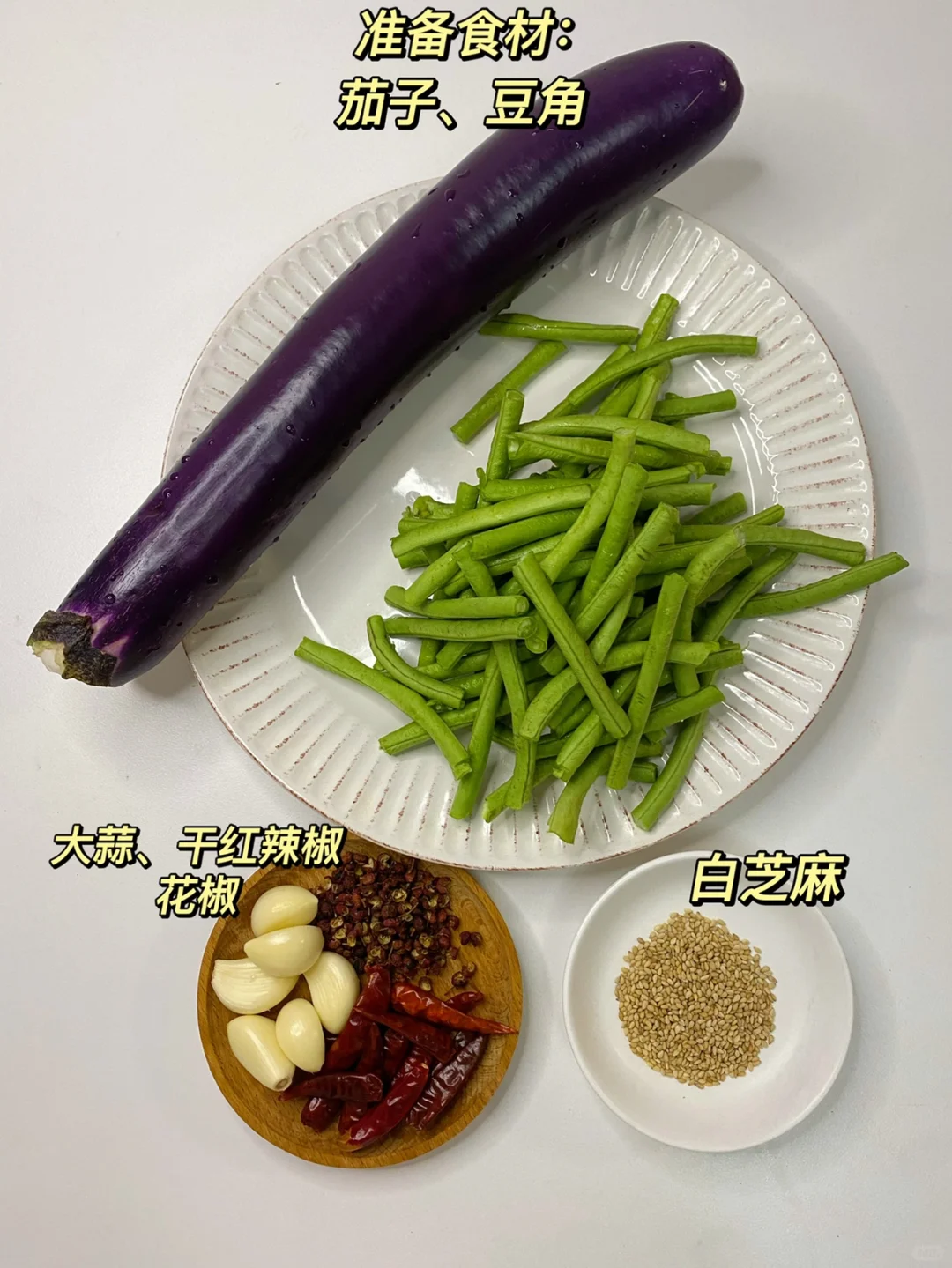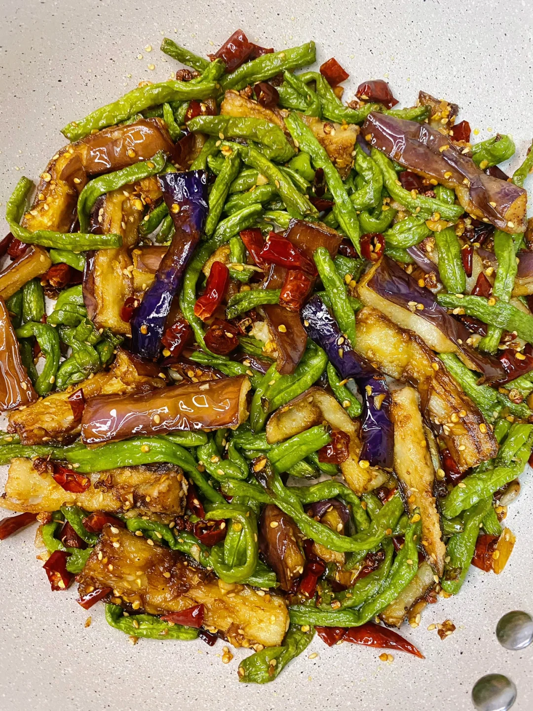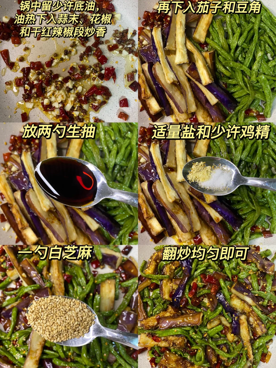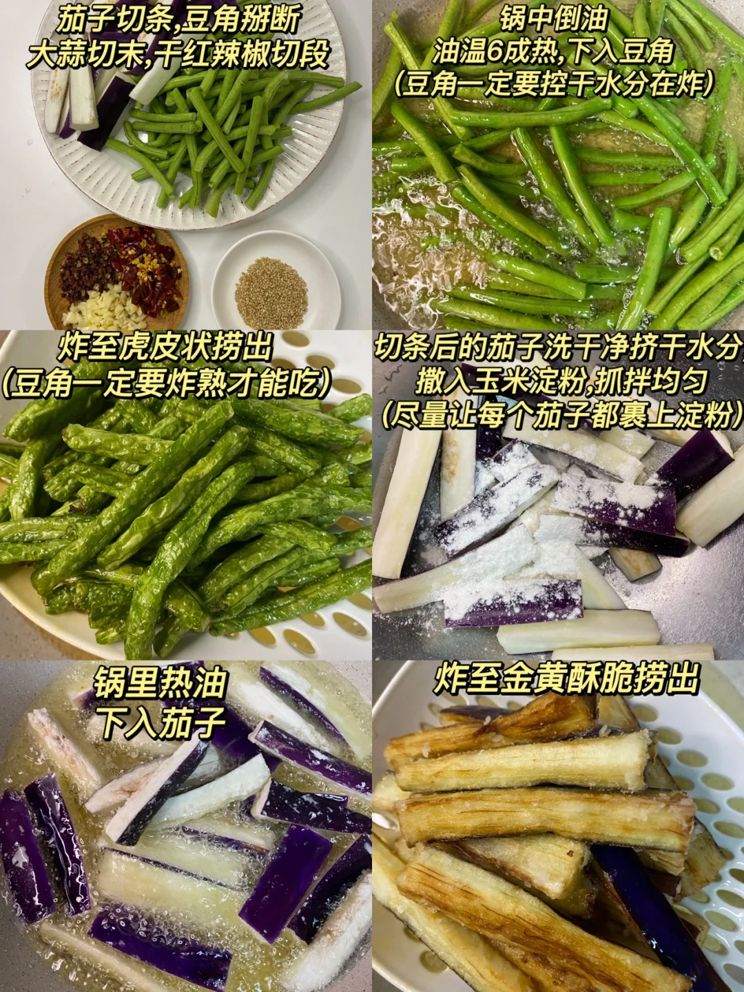 🍃食材: 一根茄子、豆角、大蒜、干红辣椒、花椒、白芝麻 🍃做法: 1、豆角洗干净掰断,茄子切条,干红辣椒切段,大蒜切末。 2、锅中多倒点油,油温6成热下入豆角炸至虎皮状捞出(豆角一定要控干水分在炸)。茄子洗干净挤干水分,再撒入玉米淀粉抓拌均匀,锅里热油,下入茄子炸至金黄色捞出。 3、锅中留少许底油,油热下入蒜末、花椒和干红辣椒段炒香,下入豆角和茄子,放两勺生抽➕适量盐➕少许鸡精➕一勺白芝麻翻炒均匀即可出锅。