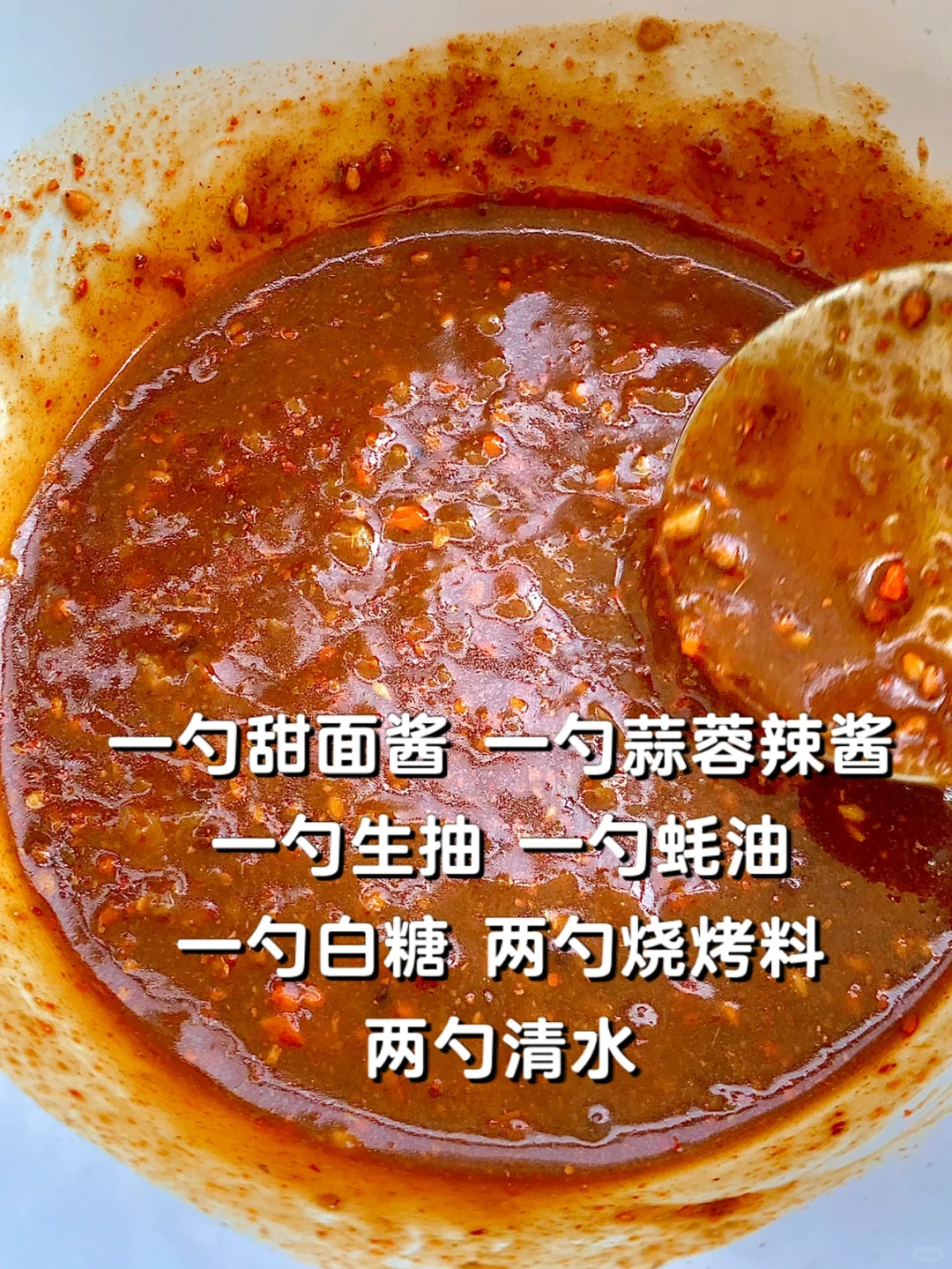 酱料㊙️:一勺甜面酱、一勺蒜蓉辣酱、一勺生抽、一勺蚝油、一勺白糖、两勺烧烤料、两勺清水