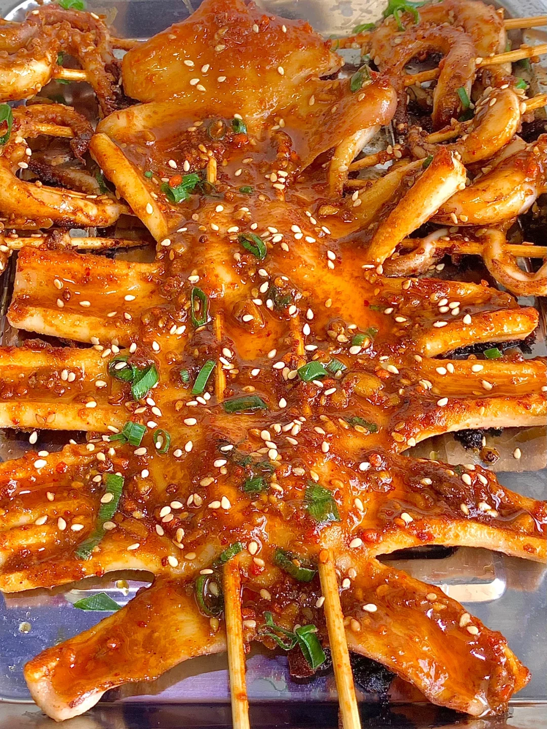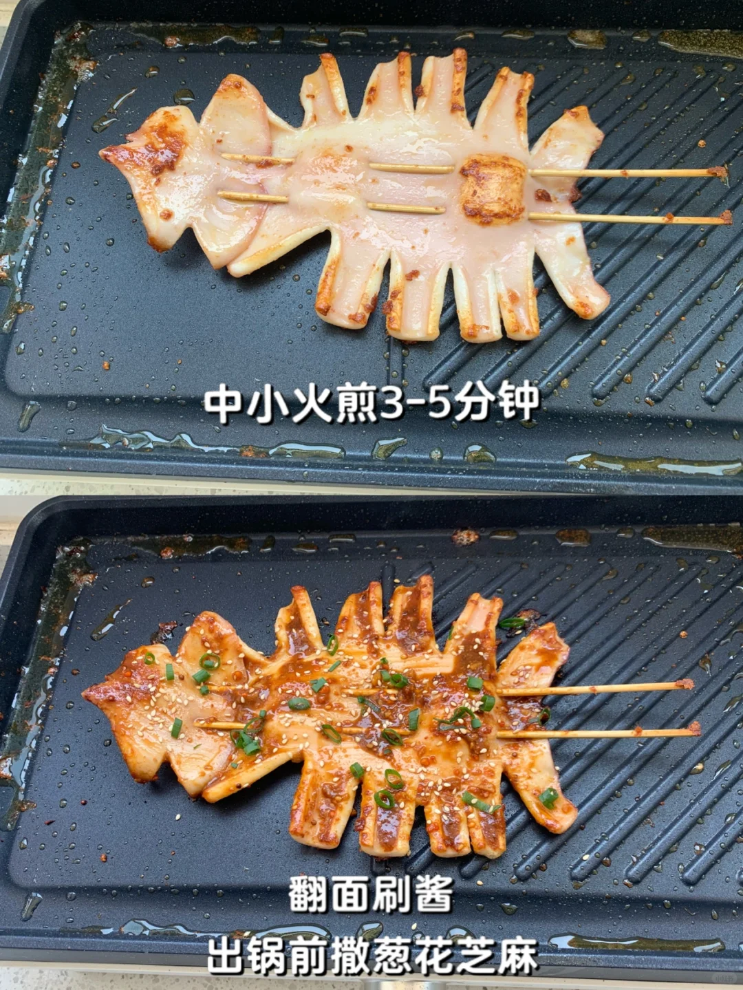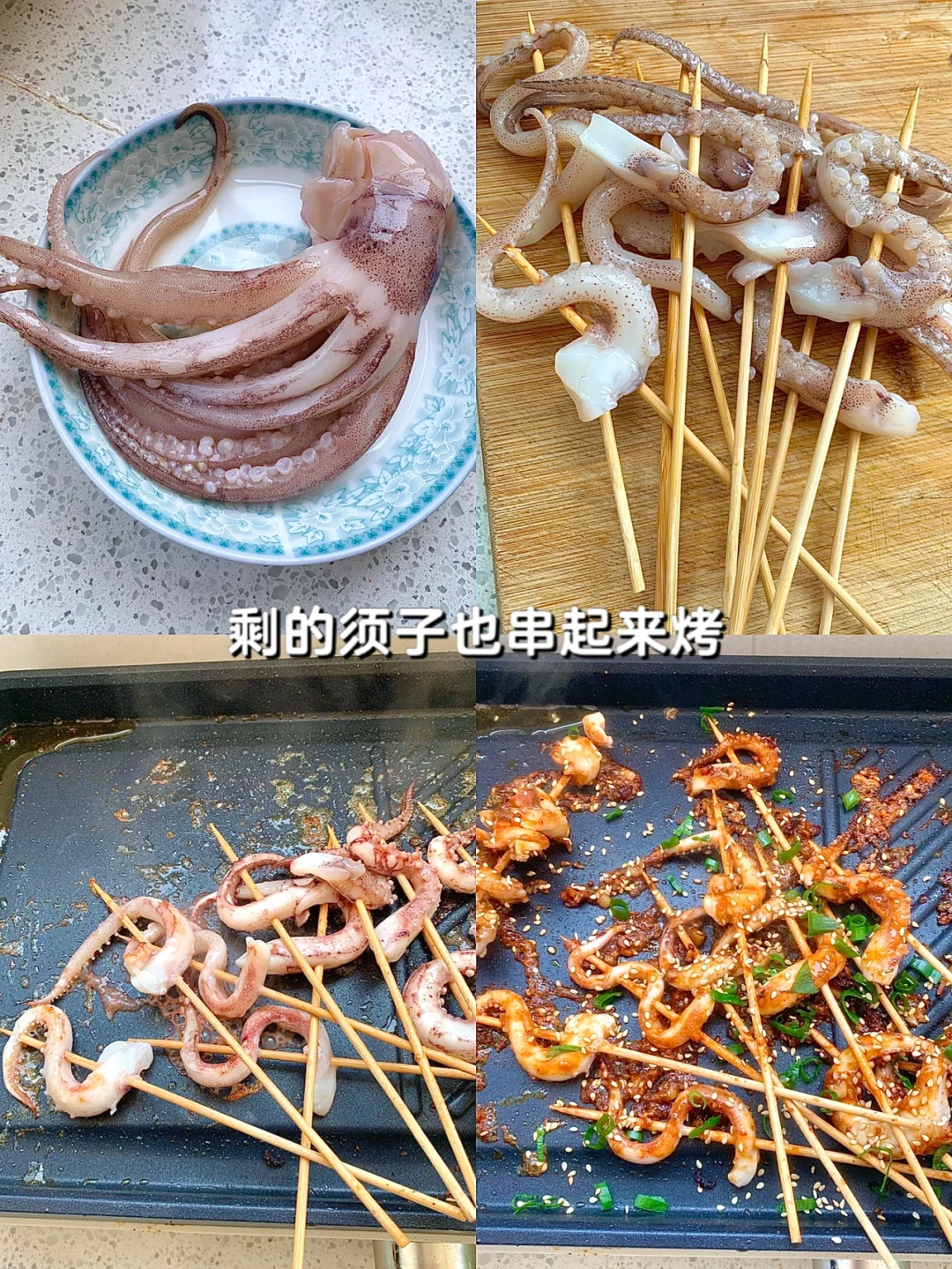 1⃣️鱿鱼从肚子剪开,去除内脏洗净,剥皮(不剥也可以),两边煎花刀,剩的须子也可以串串