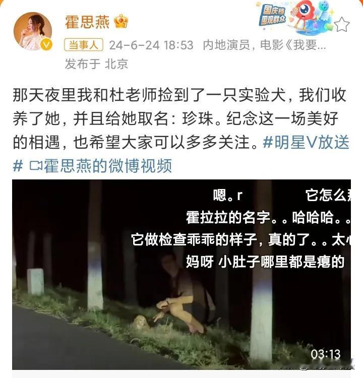 6月25日,霍思燕、杜江夫妇冲上热搜,原因是他们在24日深夜路边捡到了一只实验犬,送医后发现这只实验犬是比格犬,耳朵上有编号,脾脏有缺失,最终夫妇俩决定收养,并为其取名“珍珠”,并发文呼吁大家多多关注实验犬。