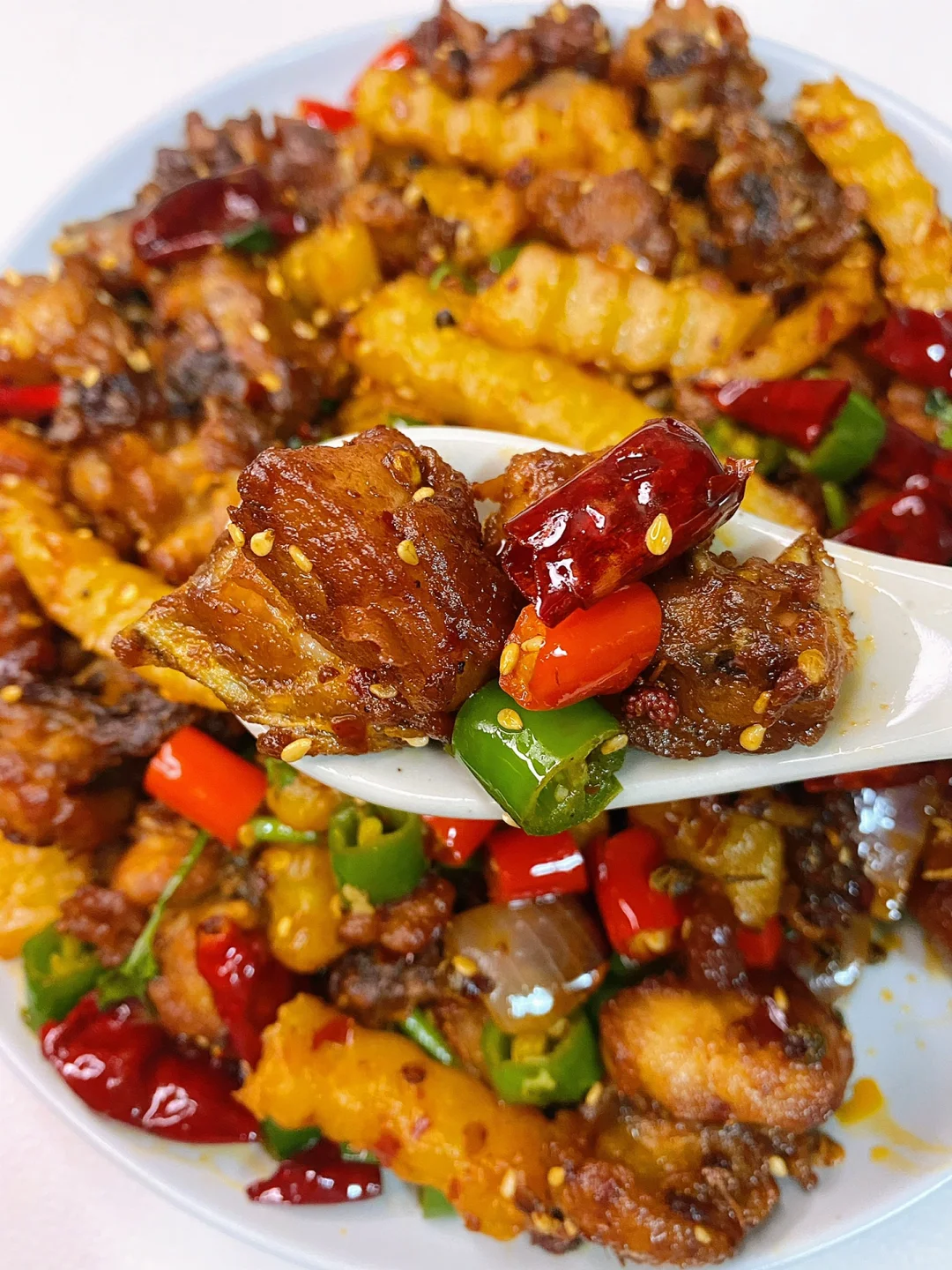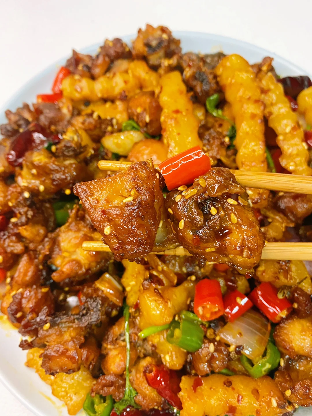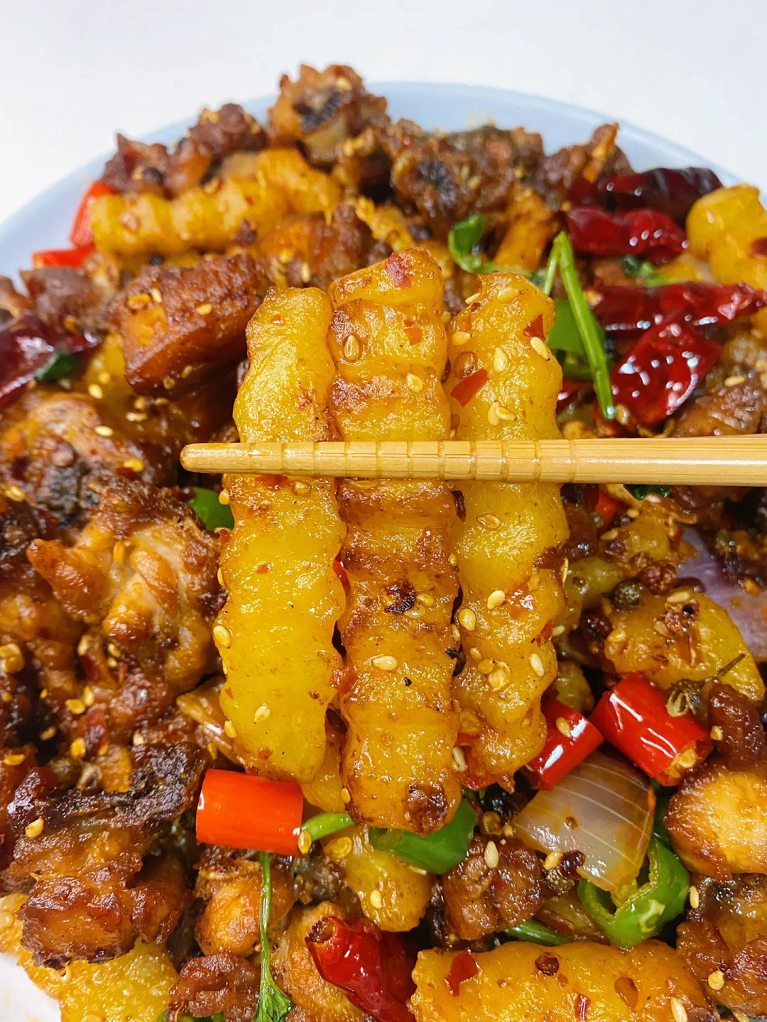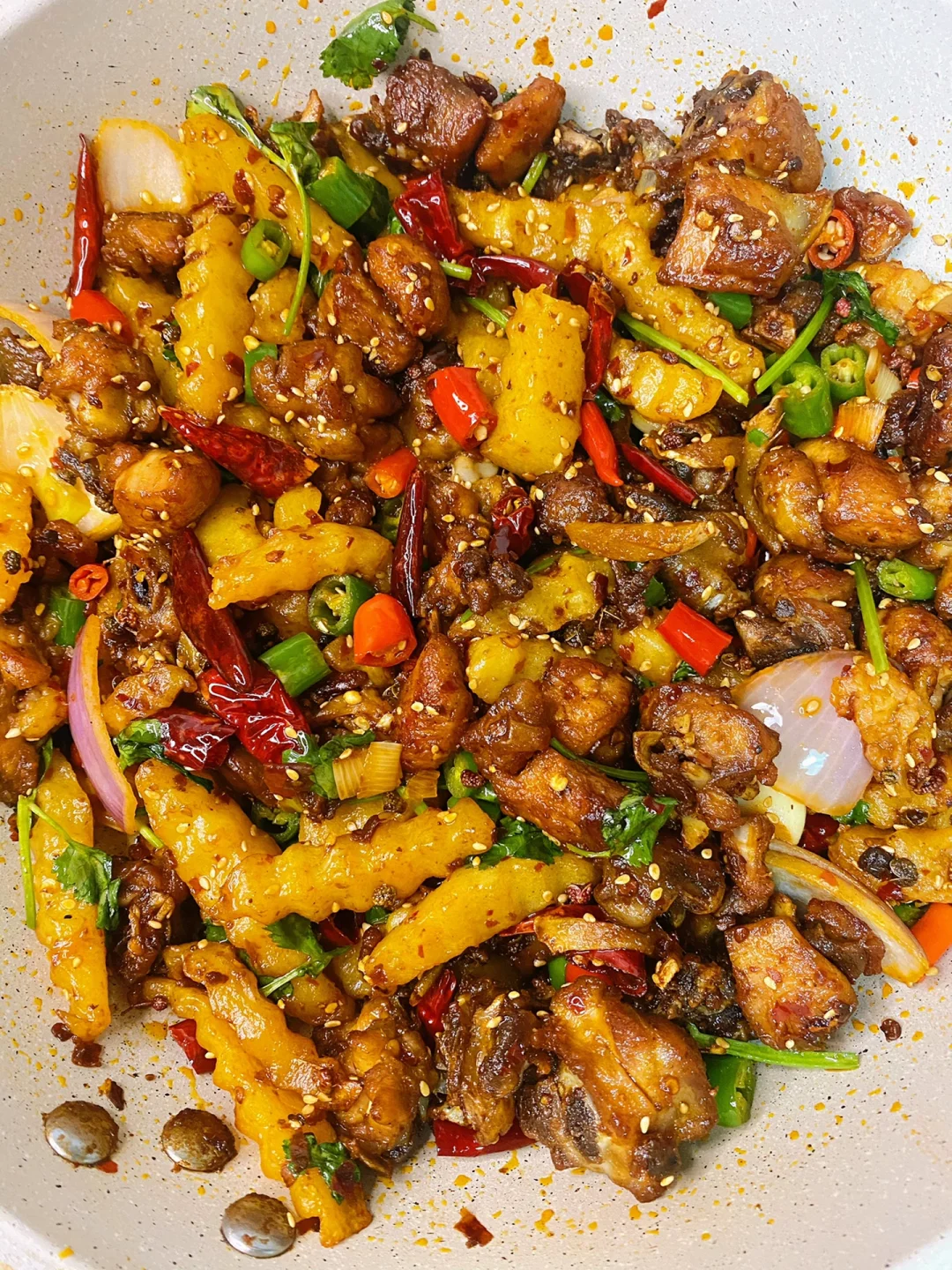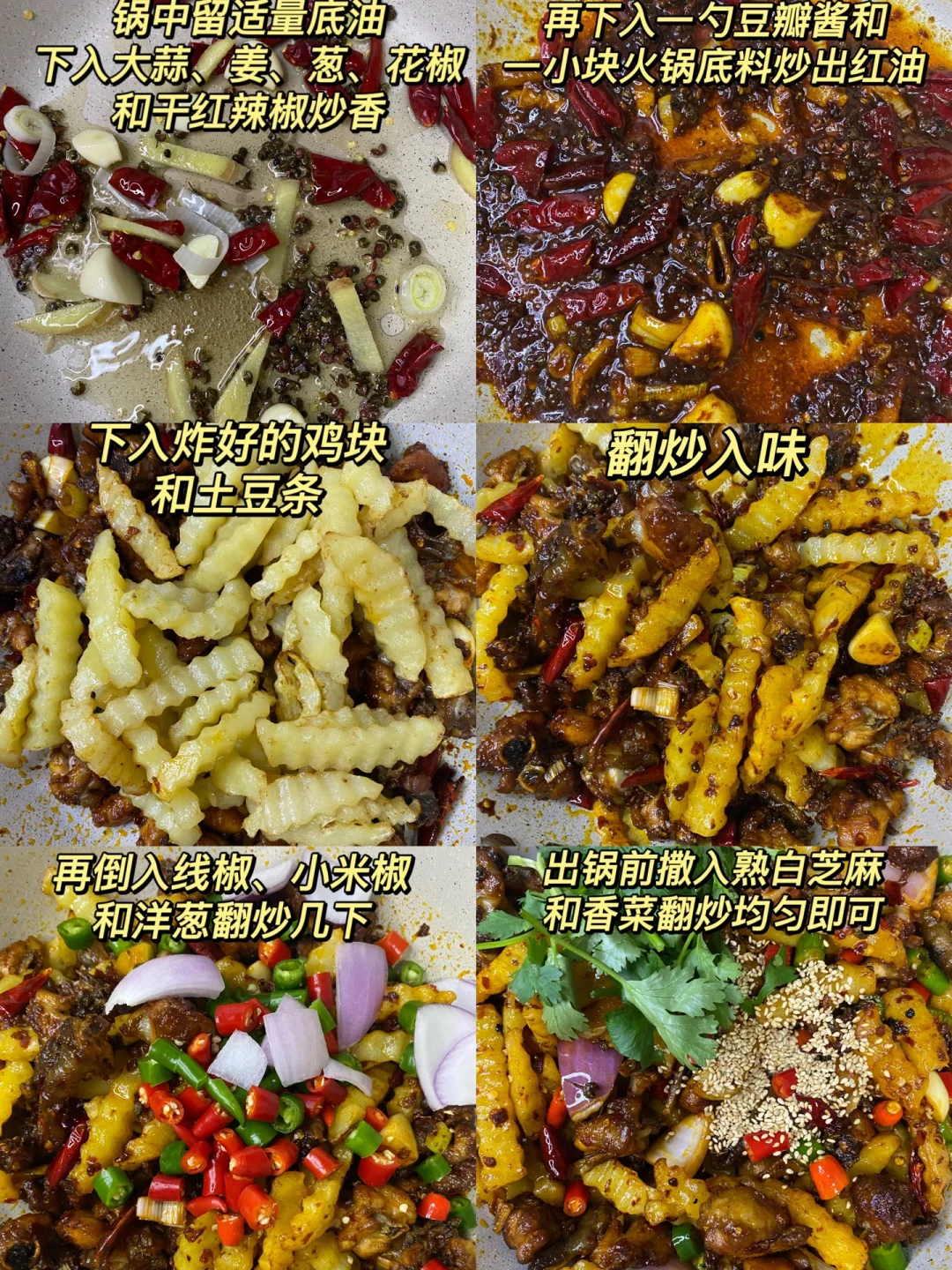 4、锅中留少许底油,下入大蒜、葱姜、花椒和干红辣椒段炒香,再下入一勺豆瓣酱和一小块火锅底料炒出红油,下入炸好的鸡块和土豆条翻炒入味,再倒入线椒、小米椒和洋葱翻炒几下,出锅前撒入熟白芝麻和香菜翻炒均匀即可。
