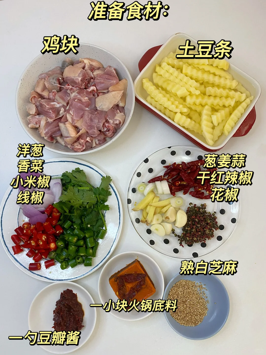 半只鸡、土豆、小葱、线椒、小米椒、洋葱、香菜、姜、大蒜、干红辣椒、花椒、一勺豆瓣酱、一小块火锅底料、熟白芝麻。
