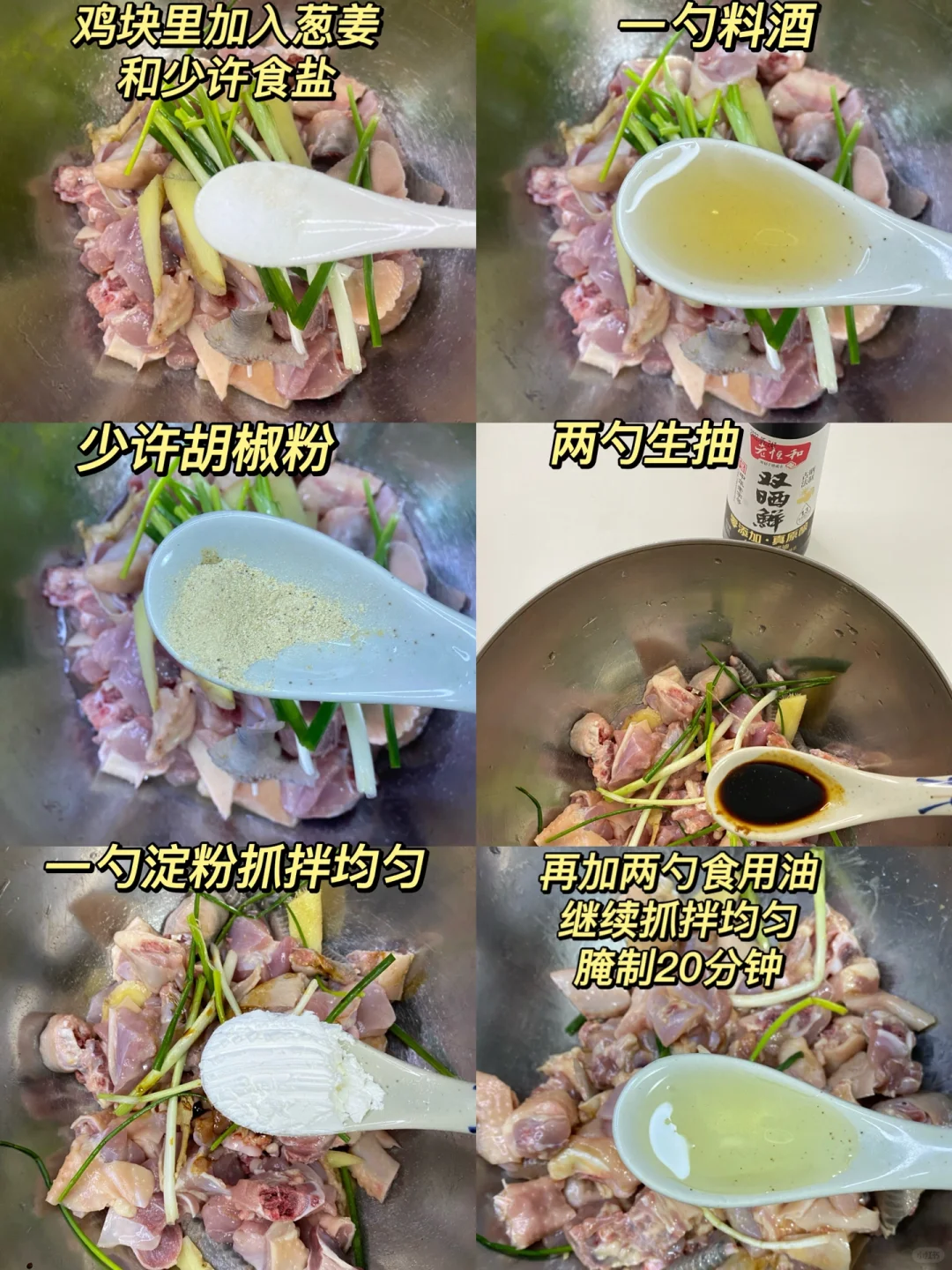 2、鸡块里加入葱和姜片➕少许食盐➕一勺料酒➕少许胡椒粉➕两勺生抽➕一勺淀粉抓拌均匀➕两勺食用油继续抓拌均匀腌制20分钟。