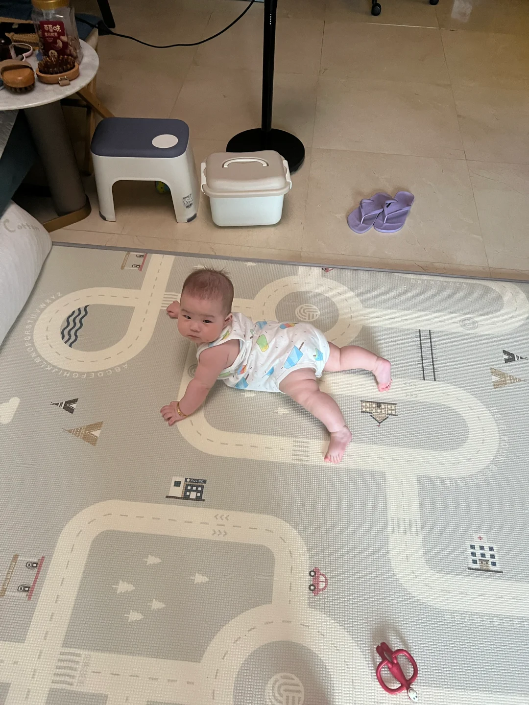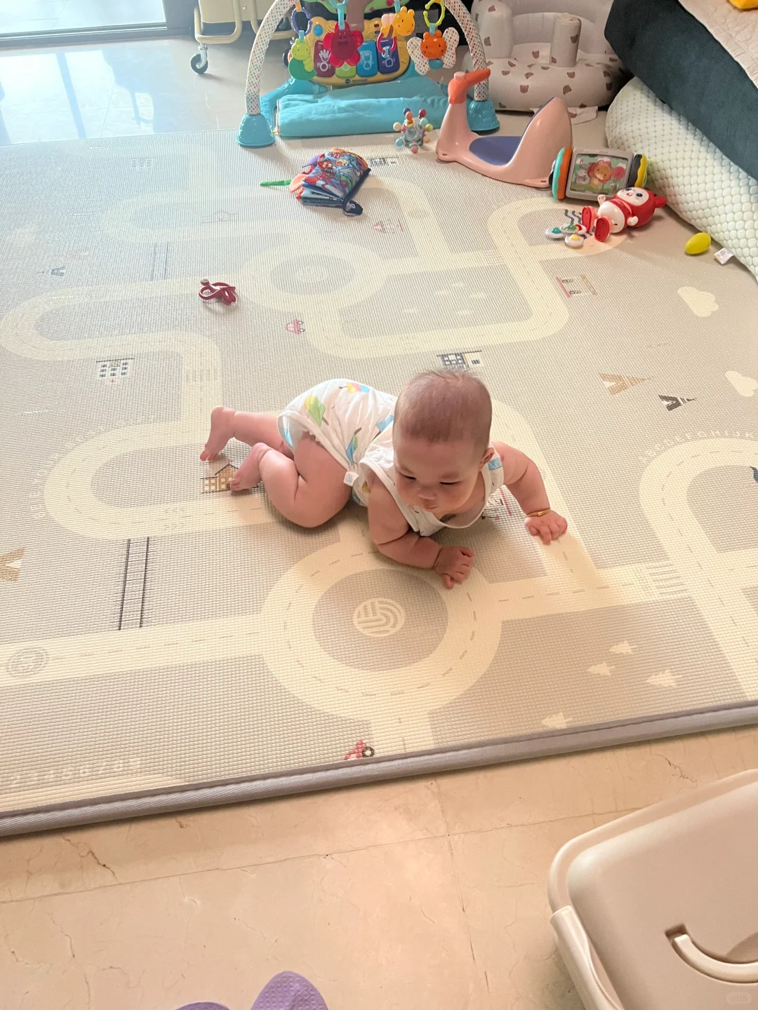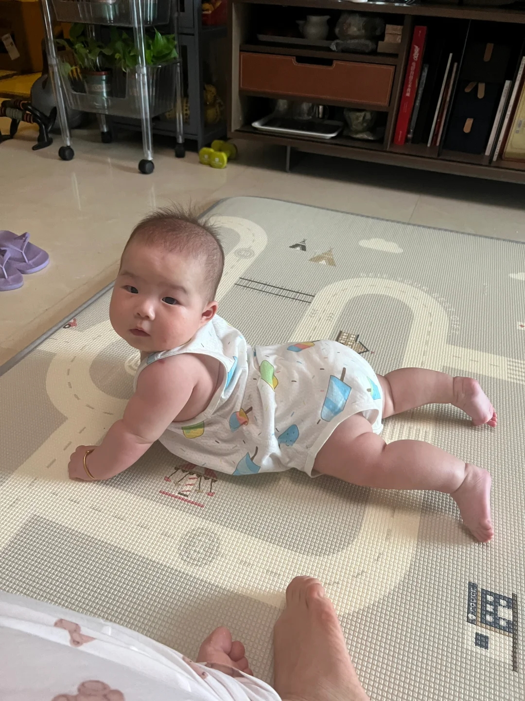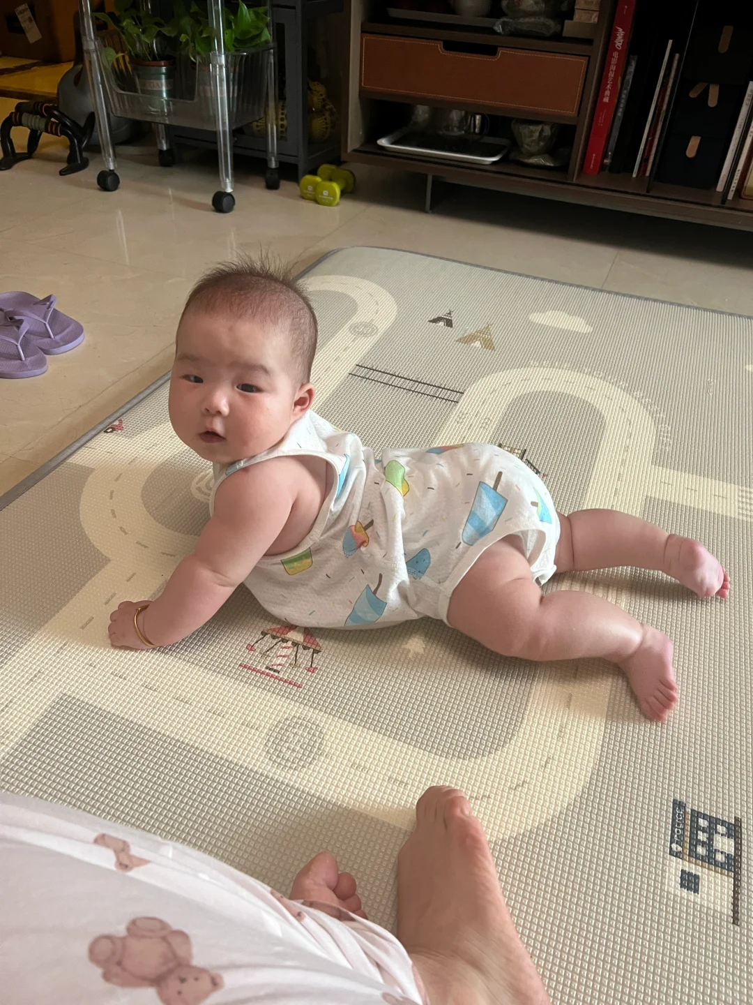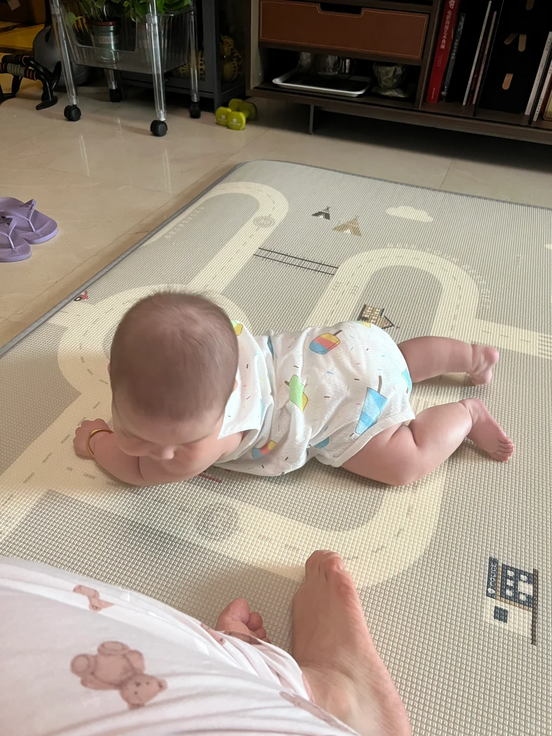 最个半月的宝宝,大运动很不错,又解锁了新技能:到手撑地[暗中观察R]