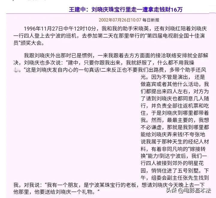 1996年,刘晓庆在宁波参观绿洲珠宝行时收了老板价值16万的珠宝,在场的一位小报记者迅速发了一篇“刘晓庆珠宝行里走一遭,拿走珠宝16万”的报道。