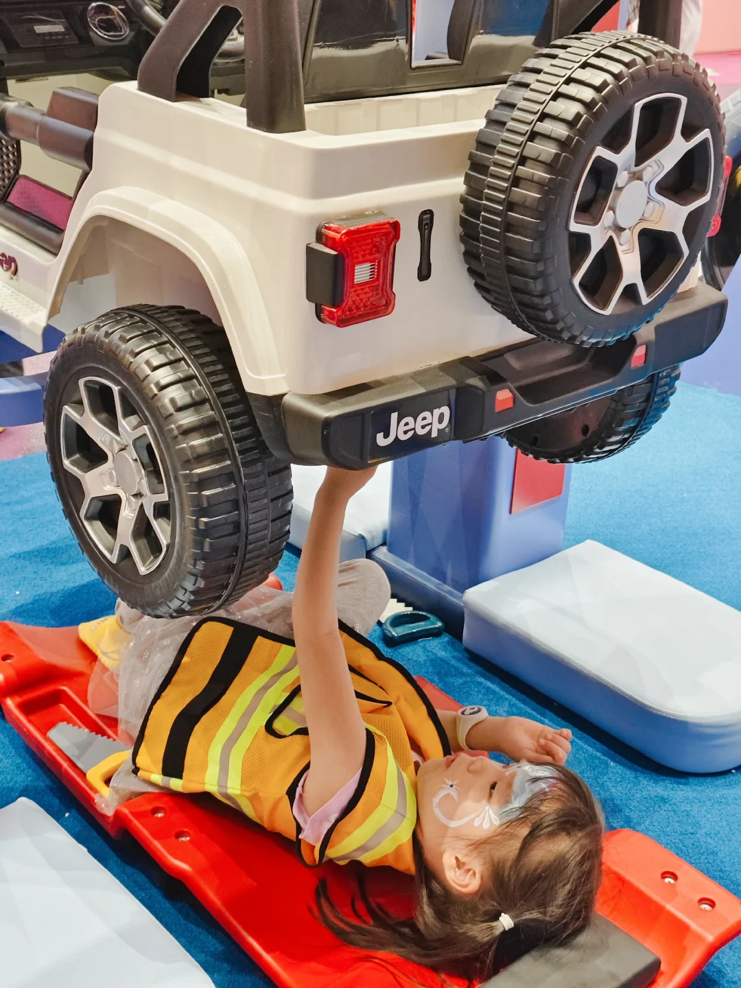 5⃣️修车区:换上工程师衣服,开始检修,真的要钻到车底下去哟!好有意思