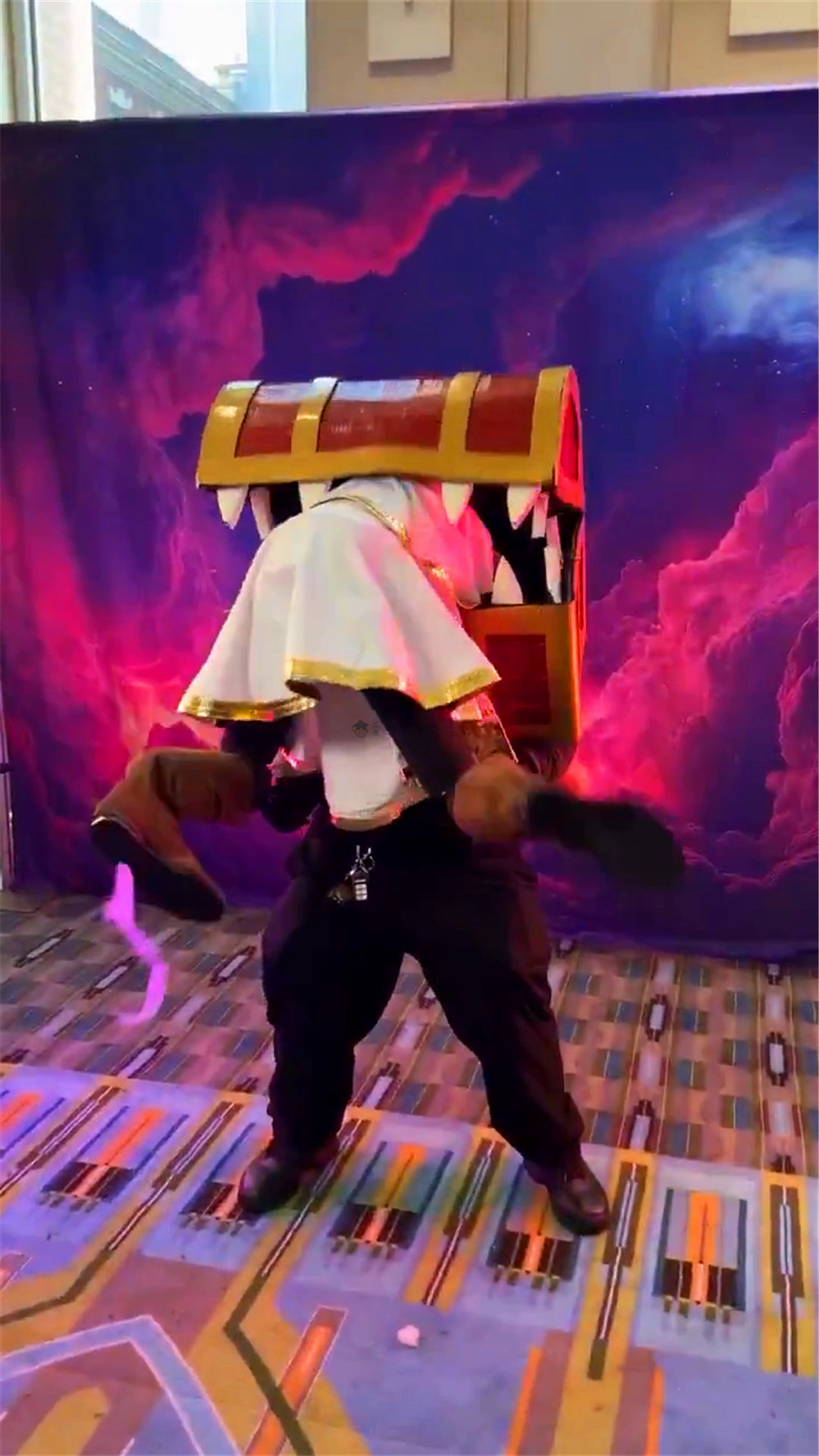 原来这是一个人假扮的,他上半身穿着宝箱怪造型的衣服,通过脑袋的伸缩控制宝箱的开合。那芙莉莲是抱着他吗?这也太累了吧?不对!“芙莉莲”的下半身应该也是制作的道具,而并非某个人。Coser的手与“芙莉莲”的膝盖接触,可以操作,还原双腿在外面乱蹬的经典动作。换句话来说,他独自一个人就完美Cos了《葬送的芙莉莲》宝箱怪名场面,且是可随时移动版的!
