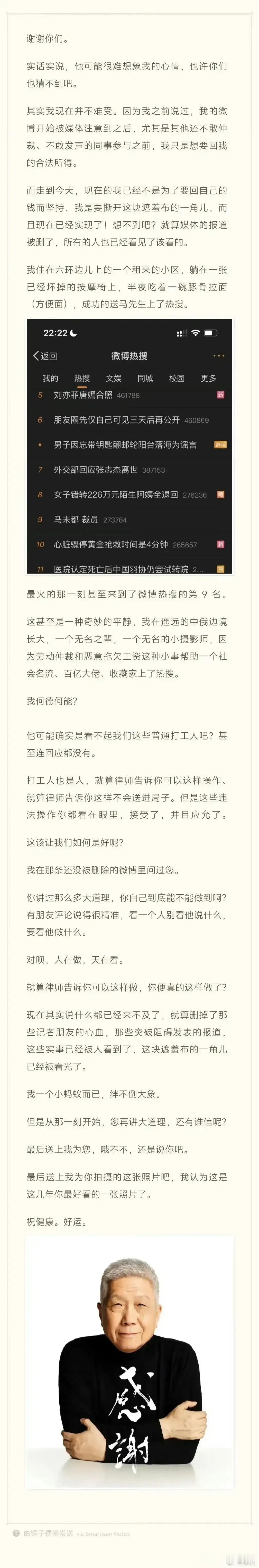 根据被裁员工的爆料,马未都在裁员时以非常强硬的态度无视了劳动法,并对员工采取了区别对待的态度: