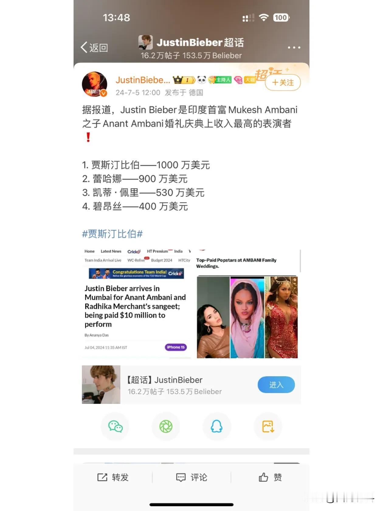 有钱真的可以为所欲为… 之前还以为比伯HaileyBieber不会去,没想到真的已经到了印度! 换算成人民币7200万[震惊][震惊] 有网友说,毕竟比伯现在要给女儿挣奶粉钱了哈哈哈哈!谁会跟💰过不去! 但是这好大一笔奶粉钱,怎么花,愁人不[我想静静]