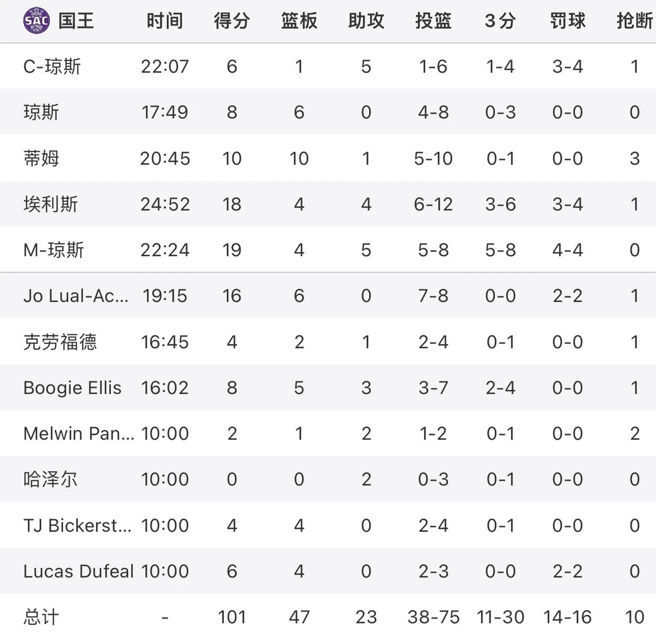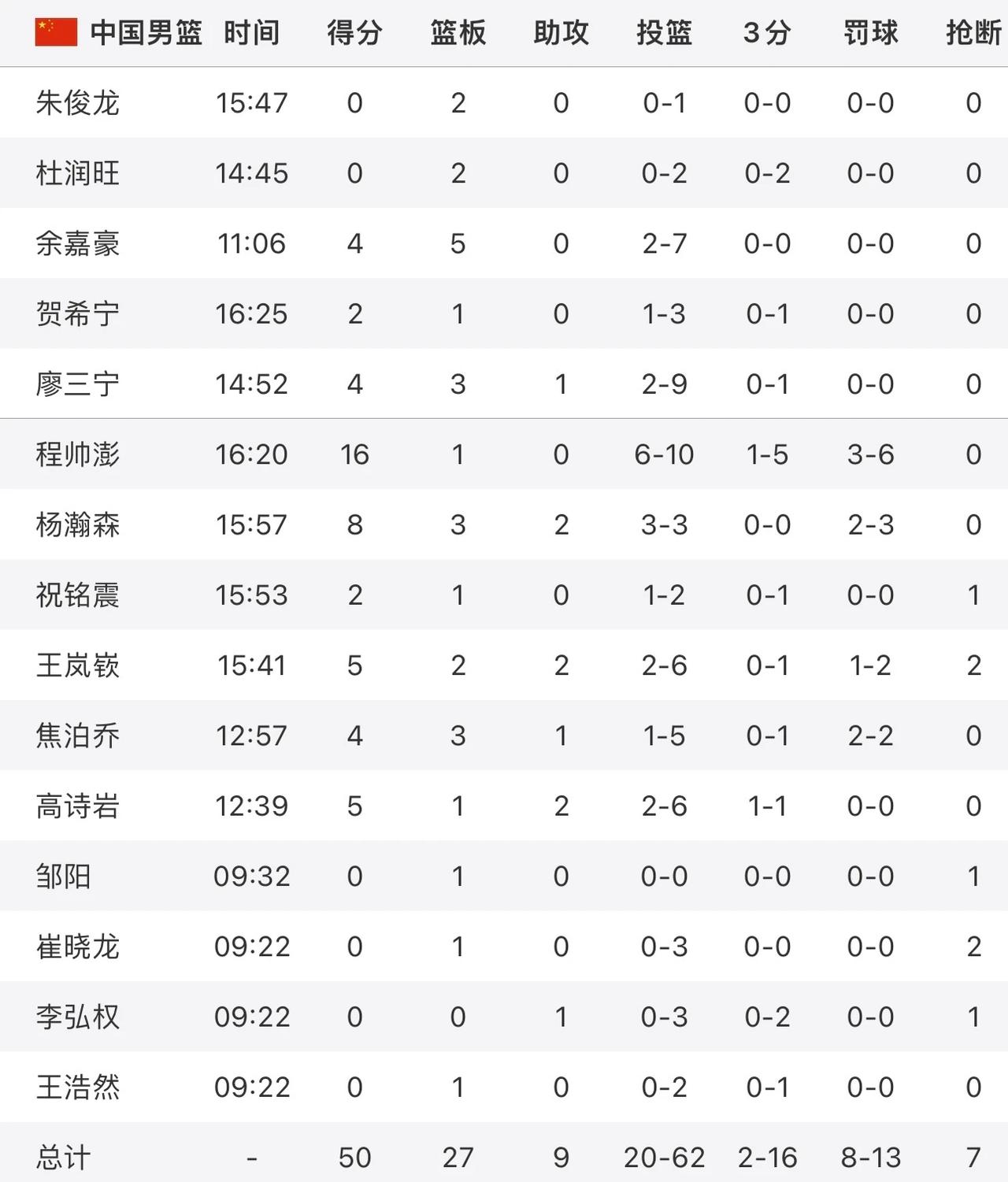 中国男篮在今天与国王的夏季联赛中50比101输掉比赛,只有程帅澎得分上双。