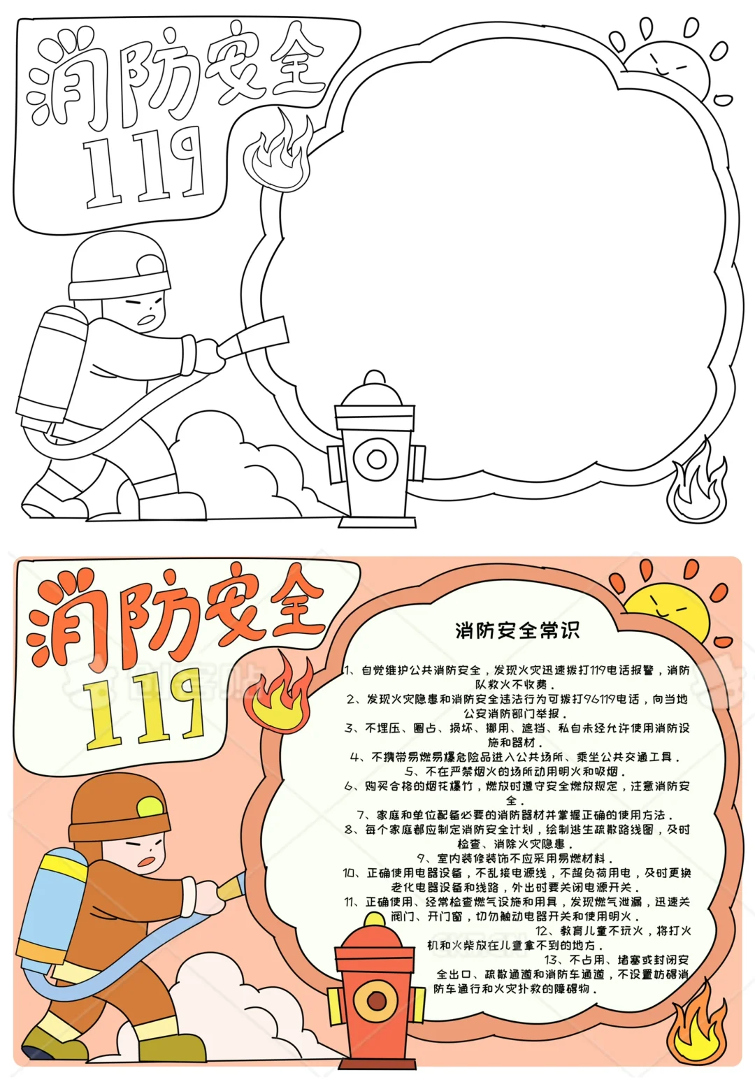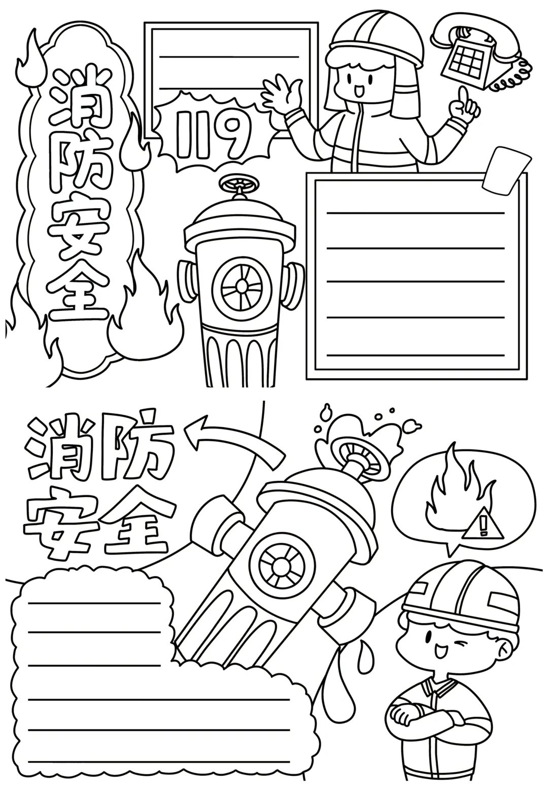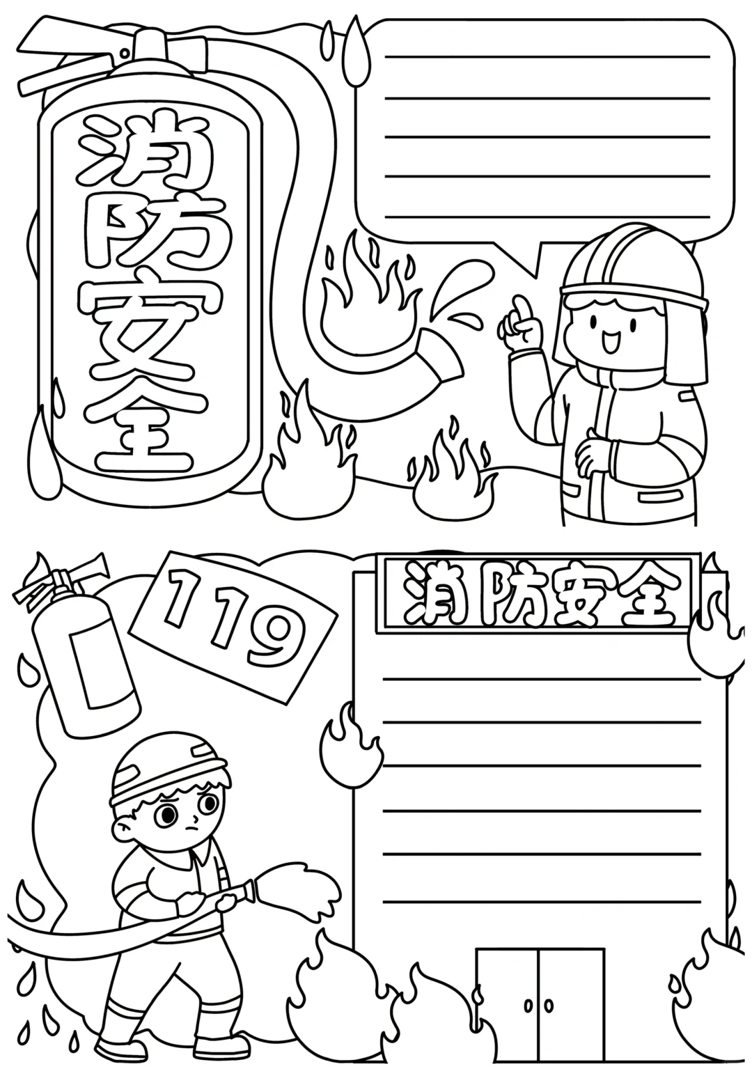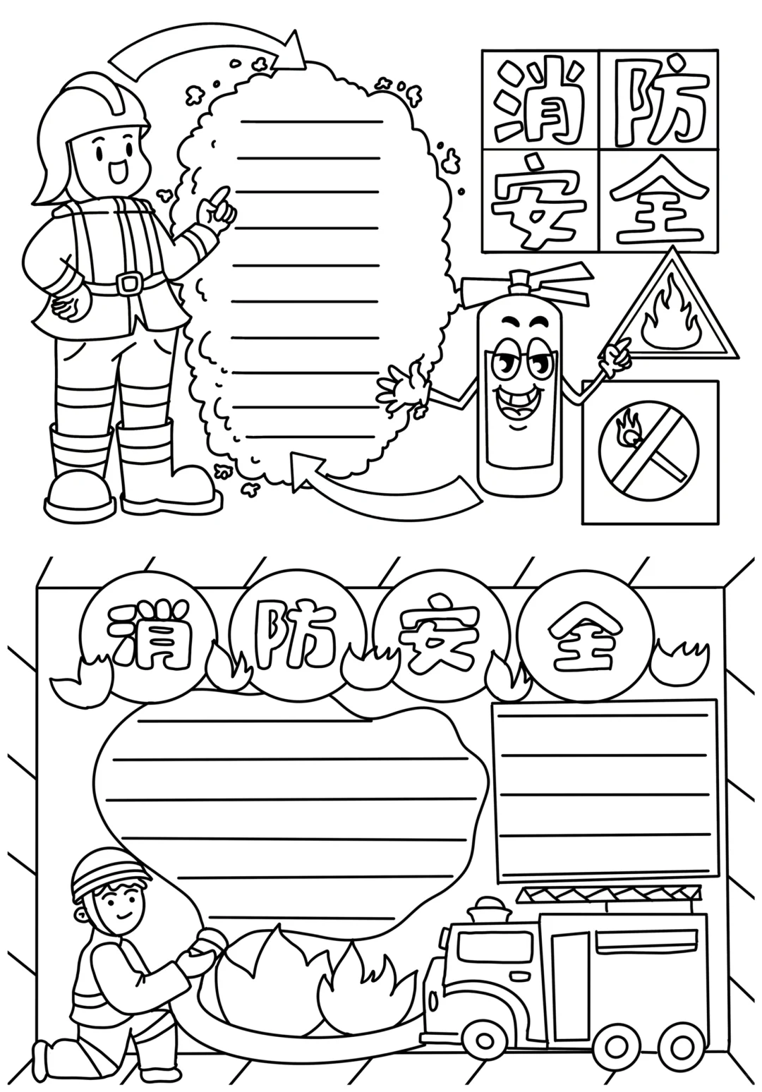 📚“消防安全”系列主题手抄报模版,附线稿。 🎨标题、元素、图片、文案素材适用于主题画、手抄报、黑板报、手账,及相关的美术课程。 📚模版图片来源于