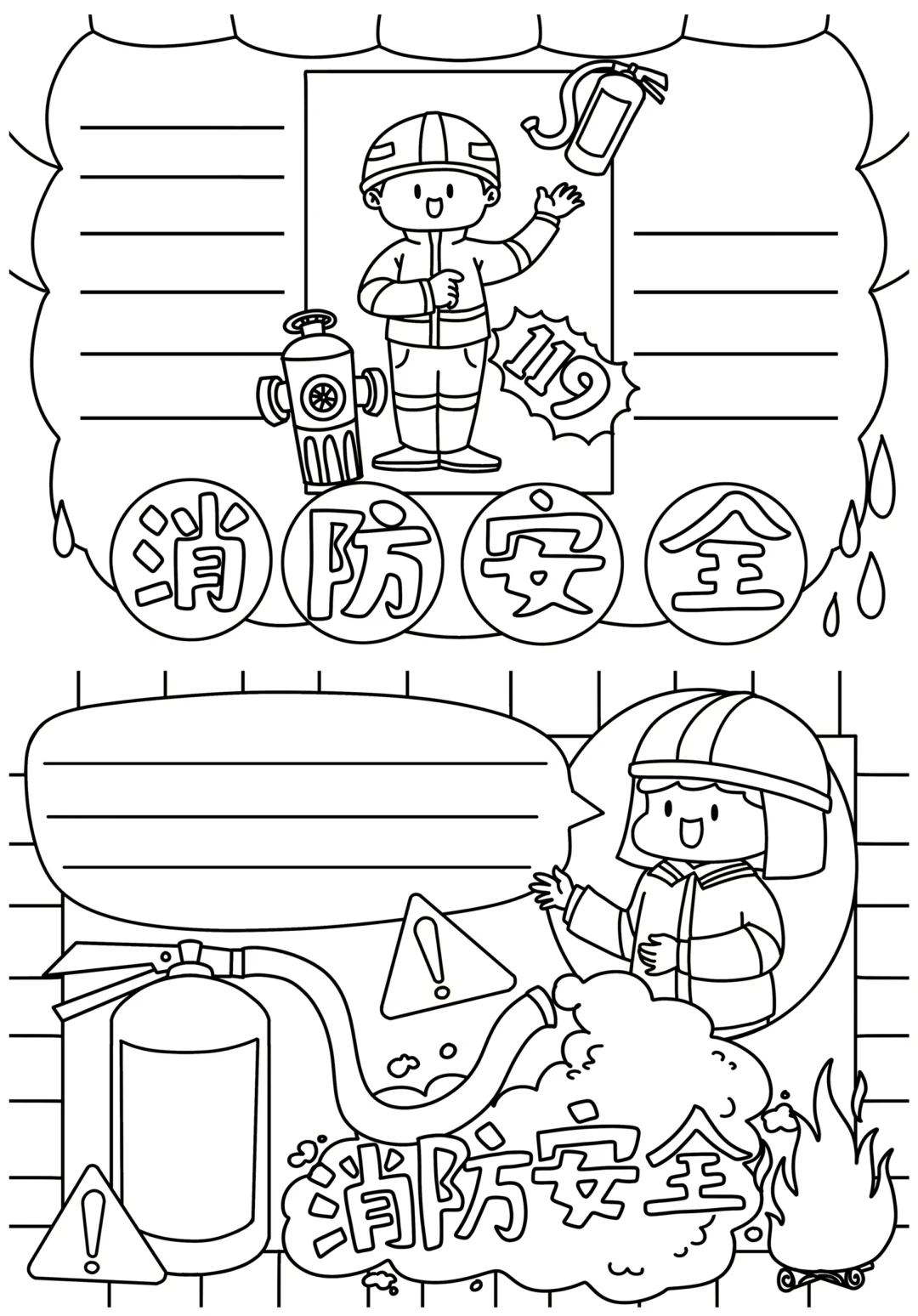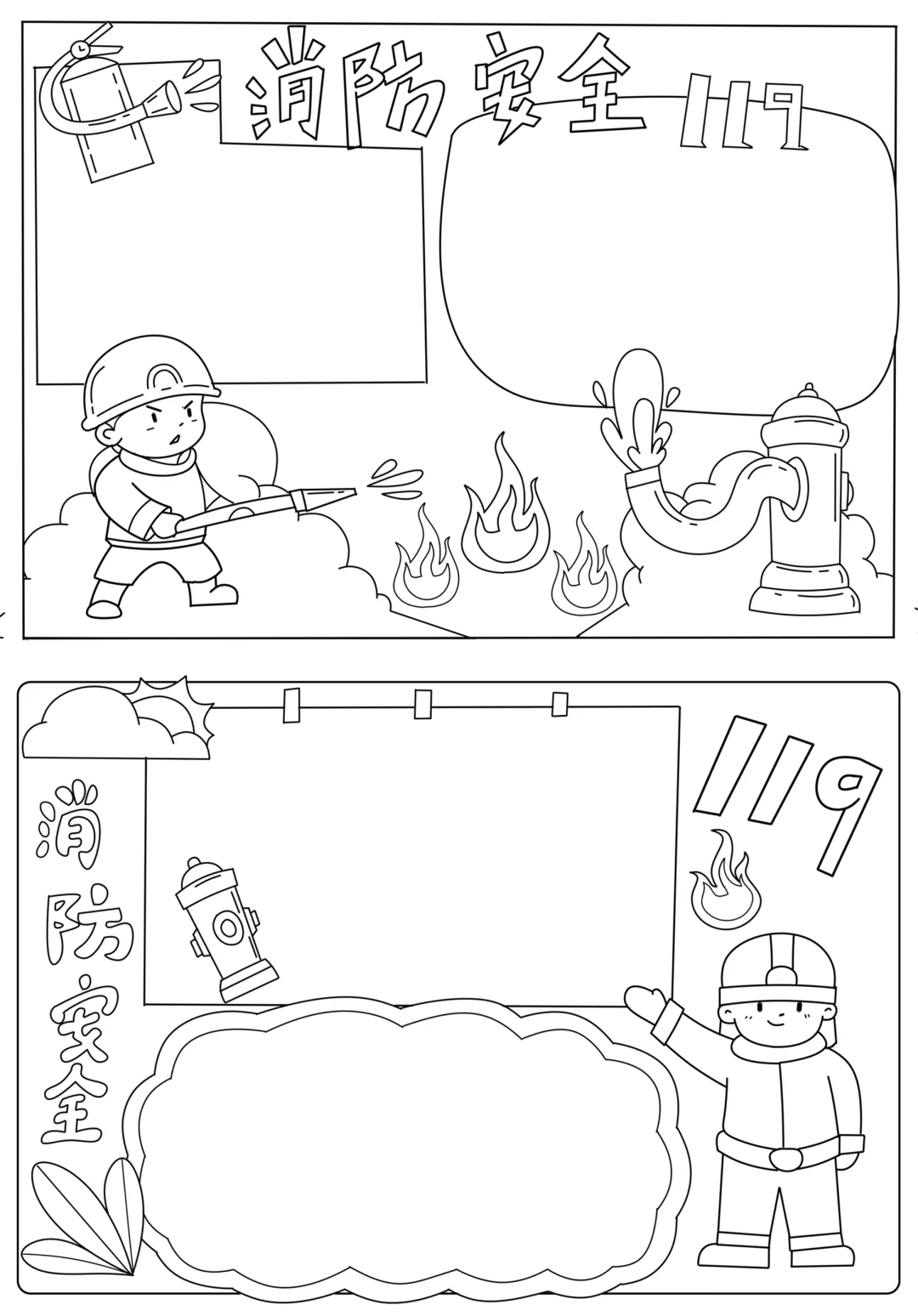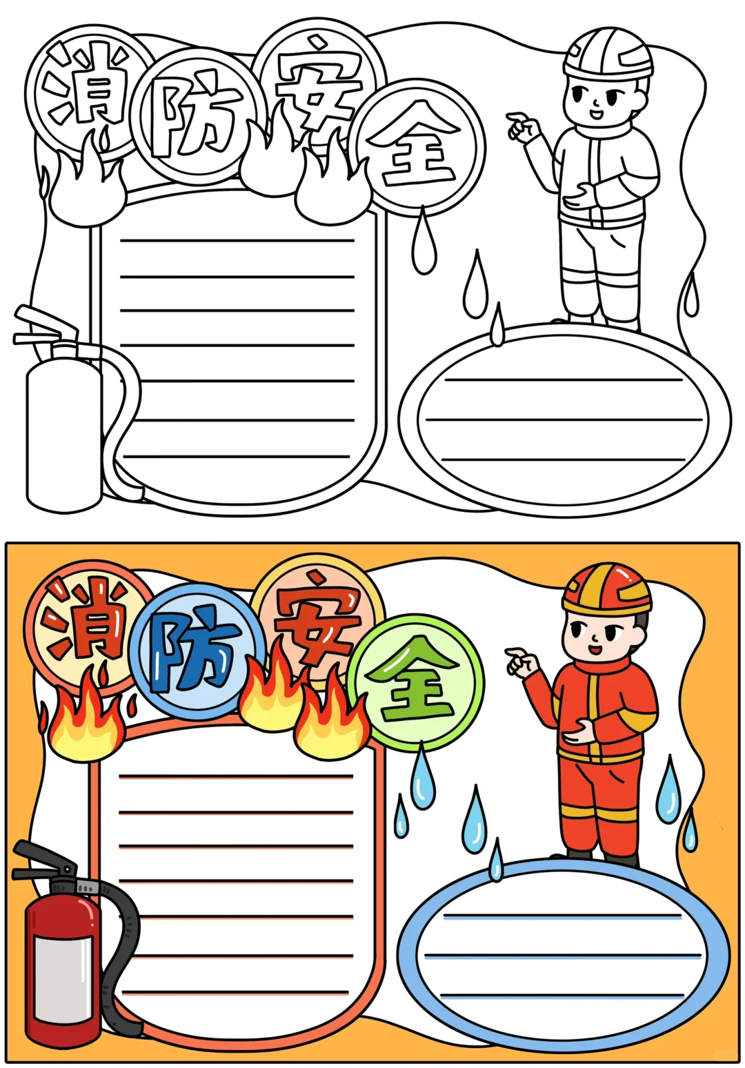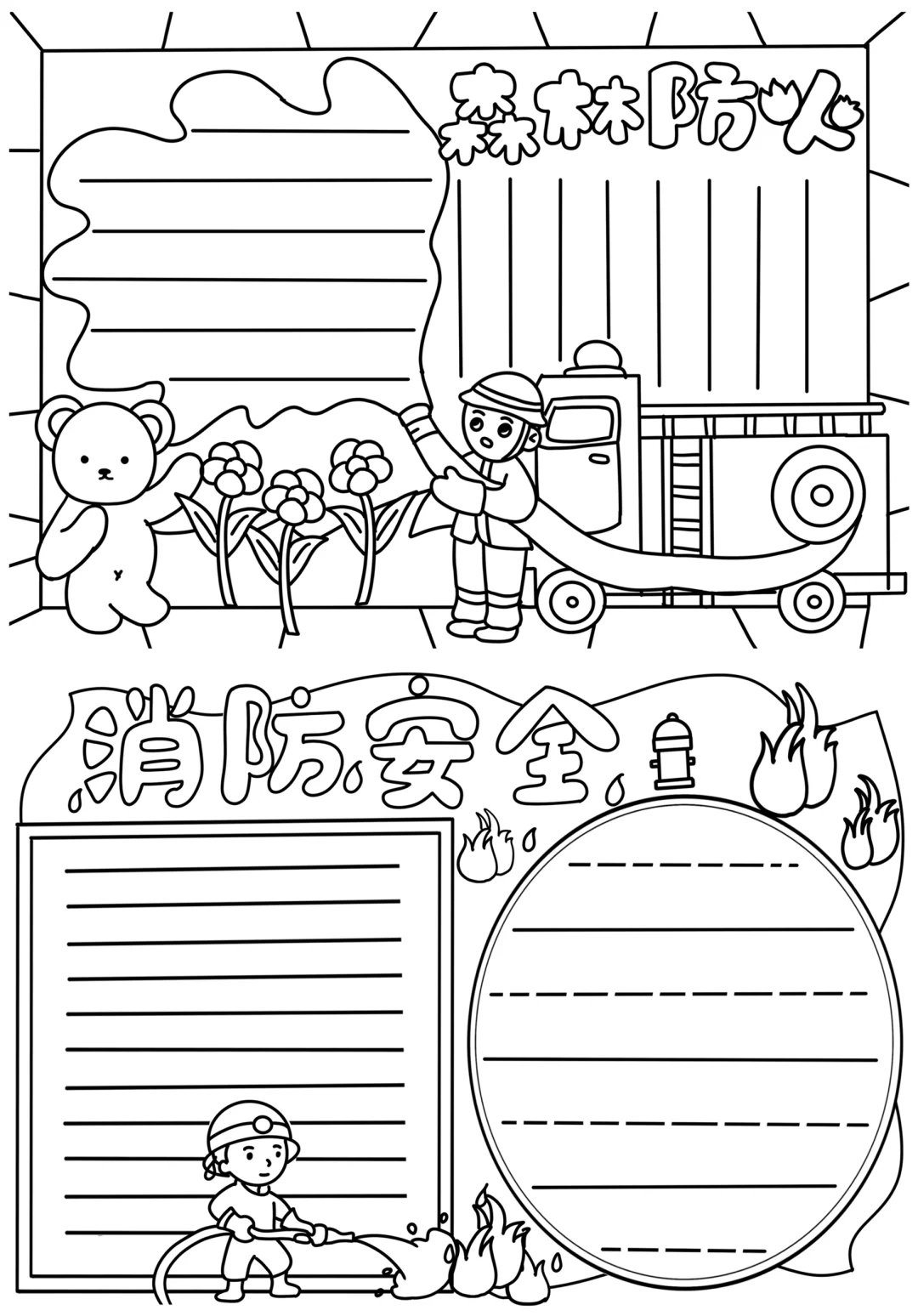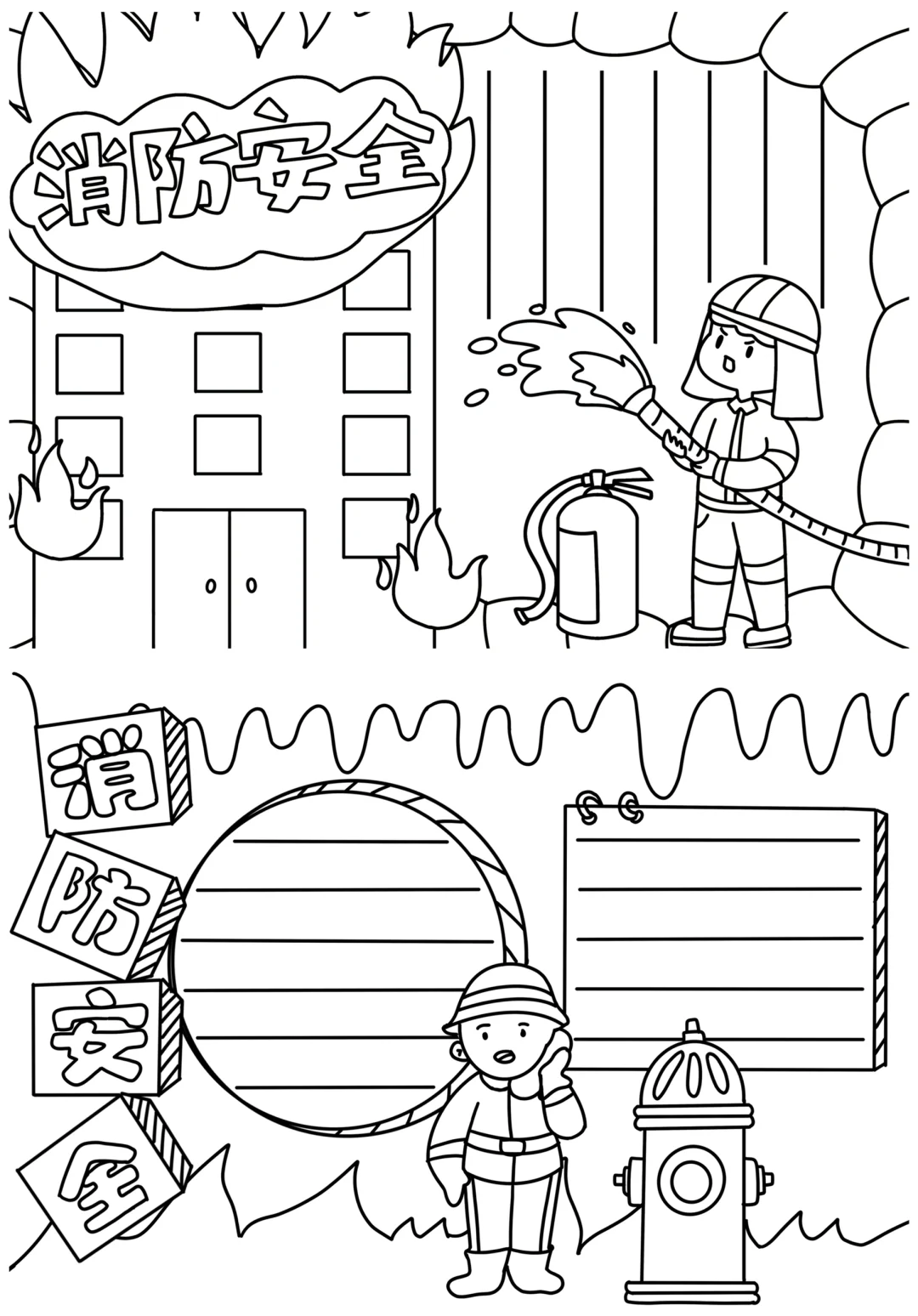 📚“消防安全”系列主题手抄报模版,附线稿。 🎨标题、元素、图片、文案素材适用于主题画、手抄报、黑板报、手账,及相关的美术课程。 📚模版图片来源于