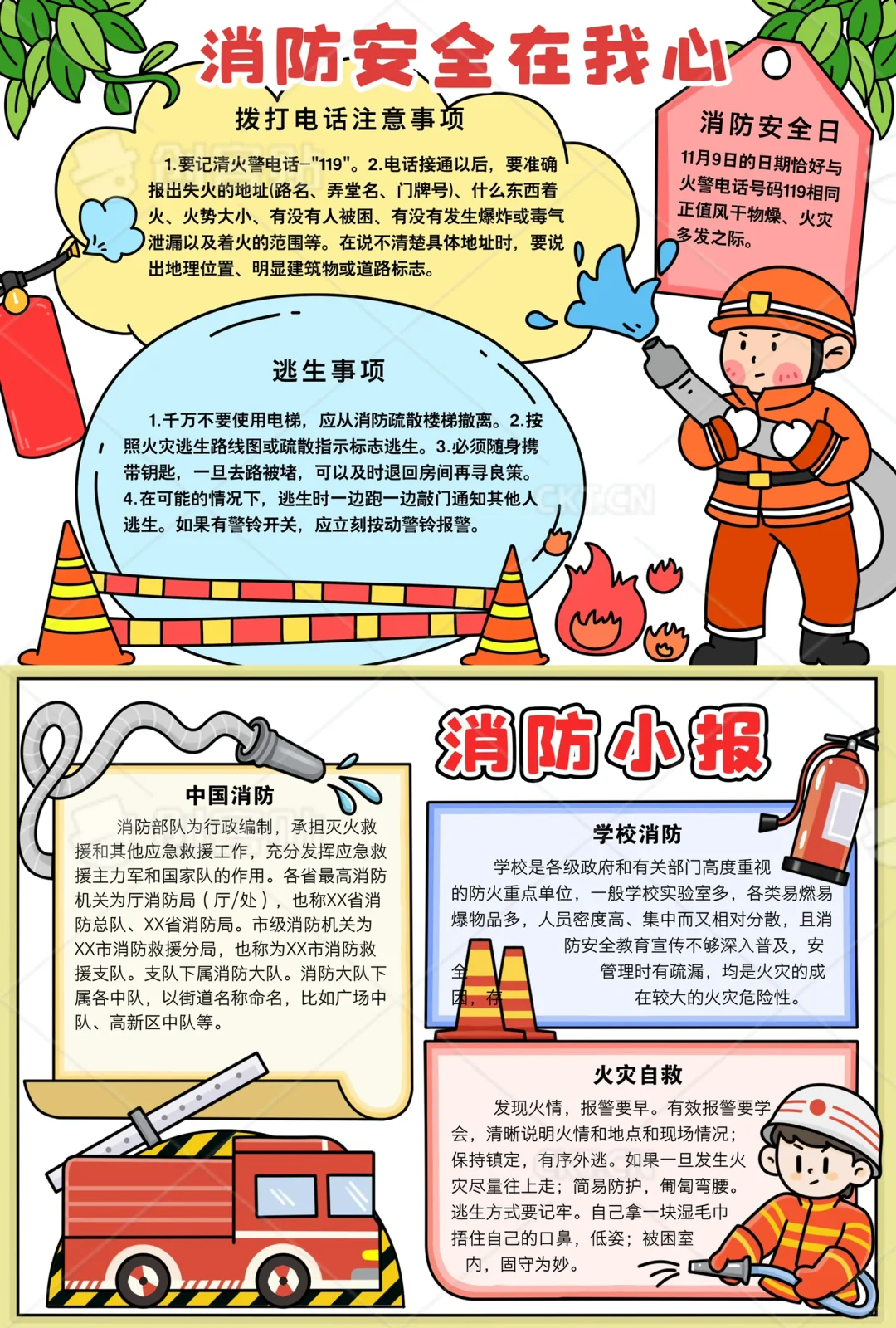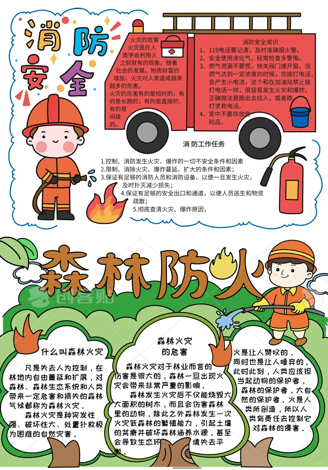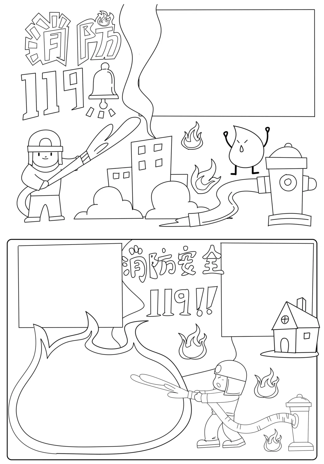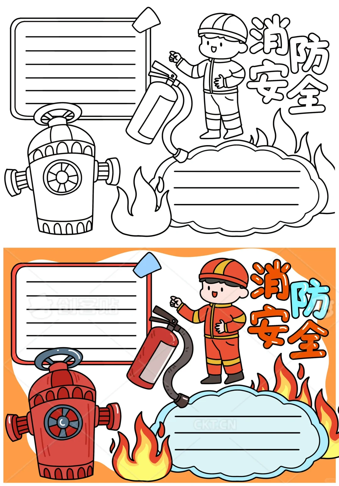 📚“消防安全”系列主题手抄报模版,附线稿。 🎨标题、元素、图片、文案素材适用于主题画、手抄报、黑板报、手账,及相关的美术课程。 📚模版图片来源于