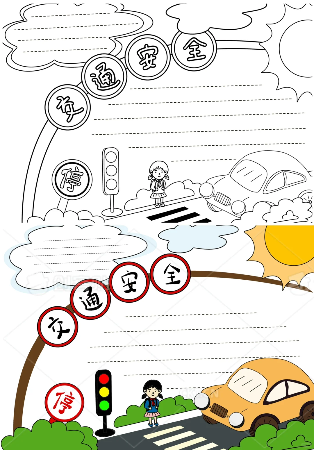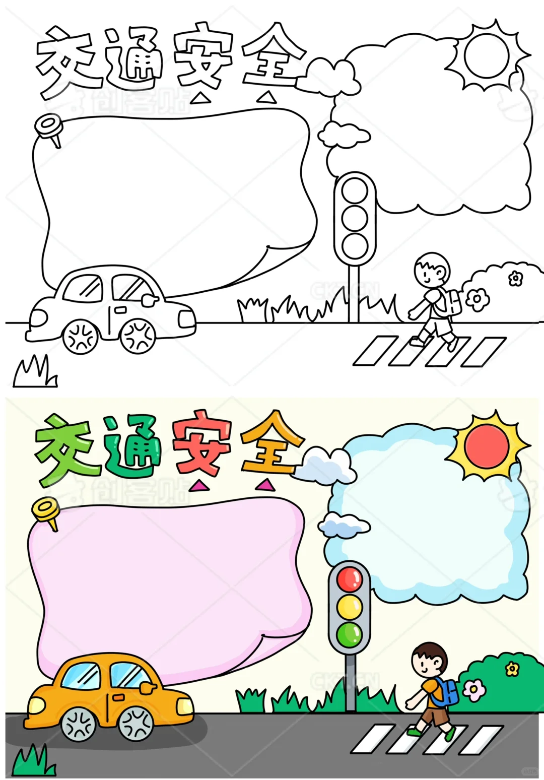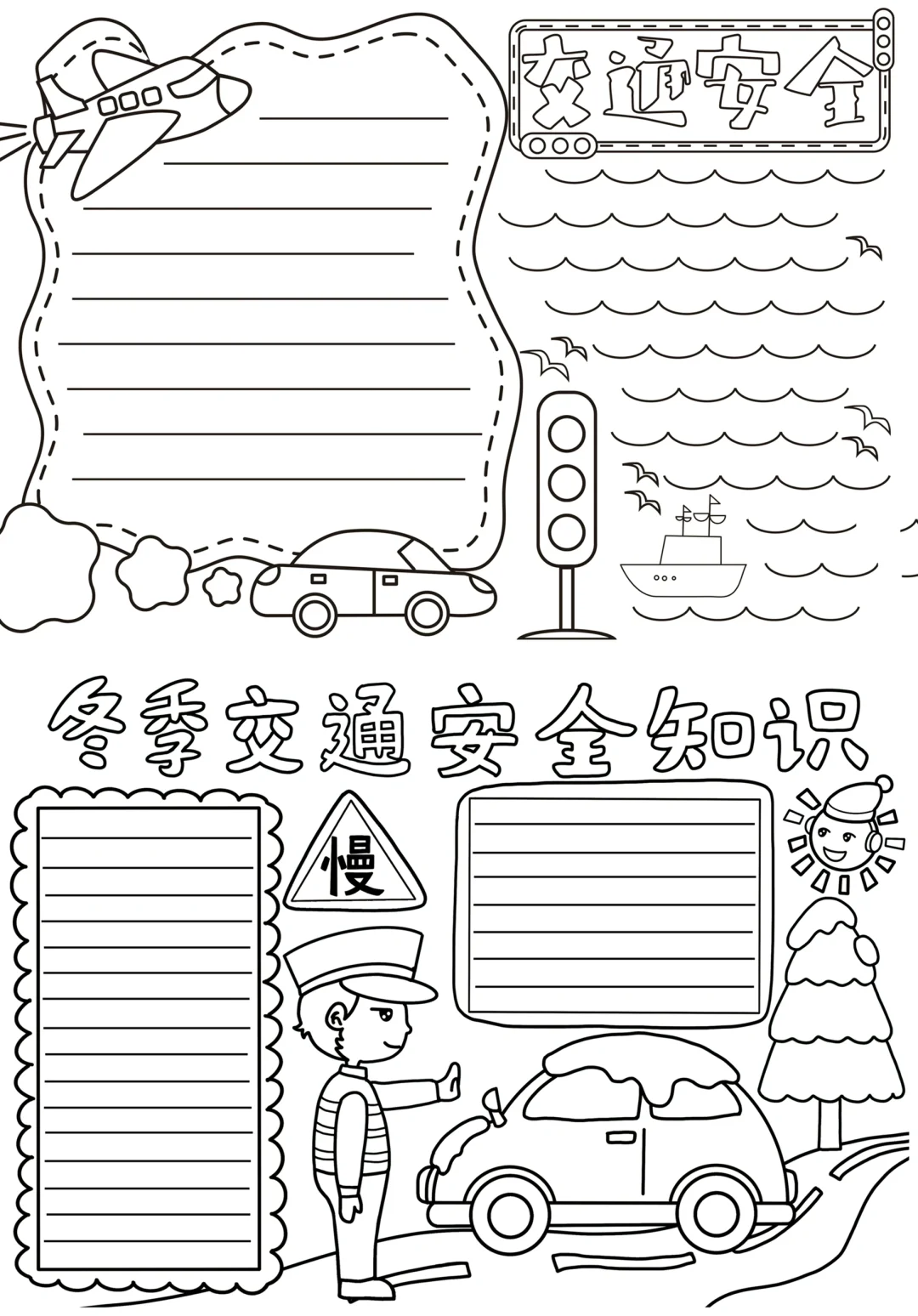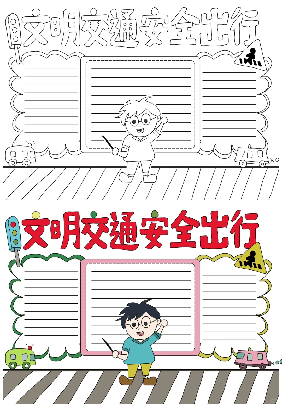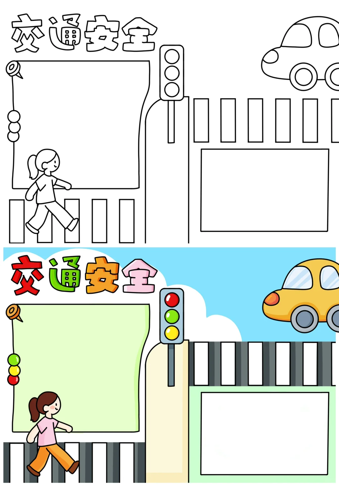 📚“交通安全”系列主题手抄报模版,附线稿。 🎨标题、元素、图片、文案素材适用于主题画、手抄报、黑板报、手账,及相关的美术课程。 📚模版图片来源于