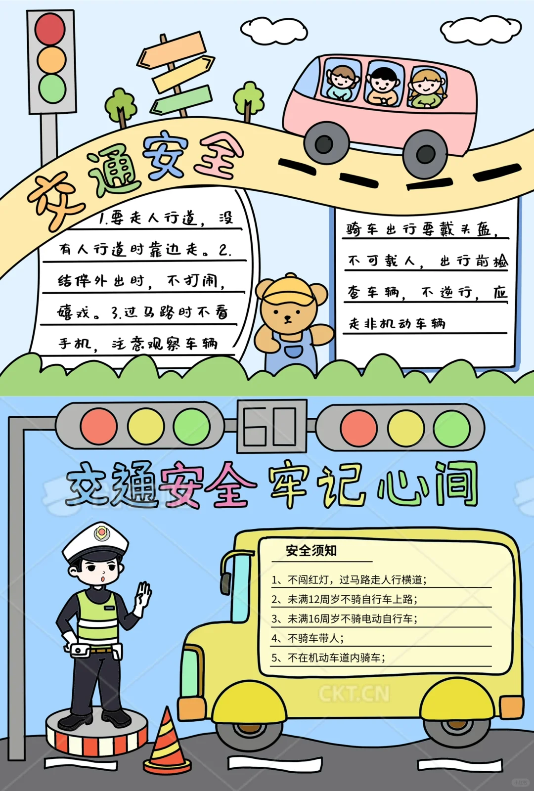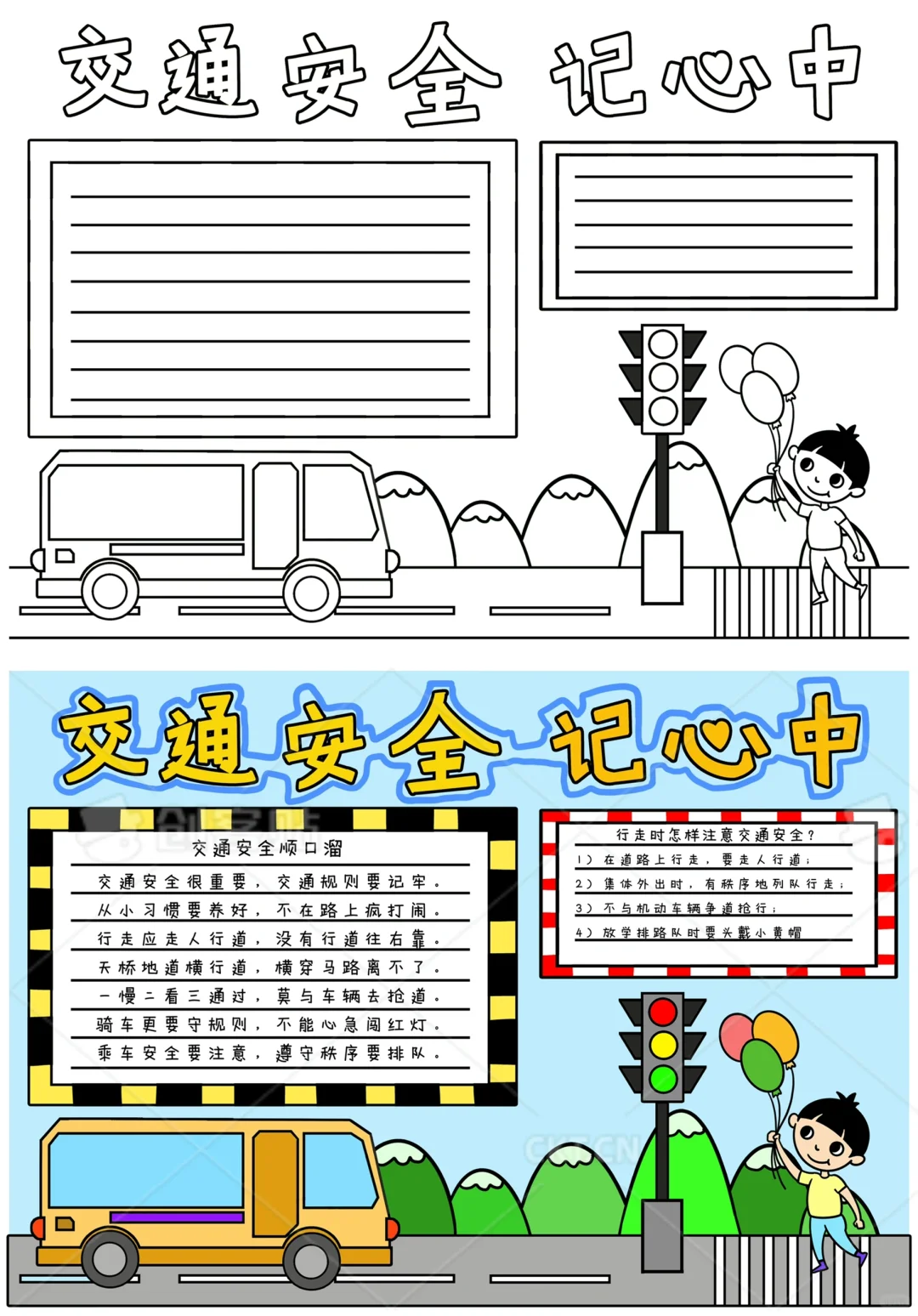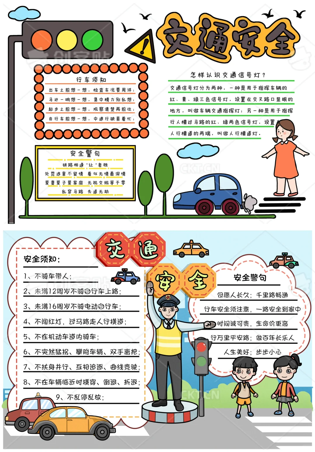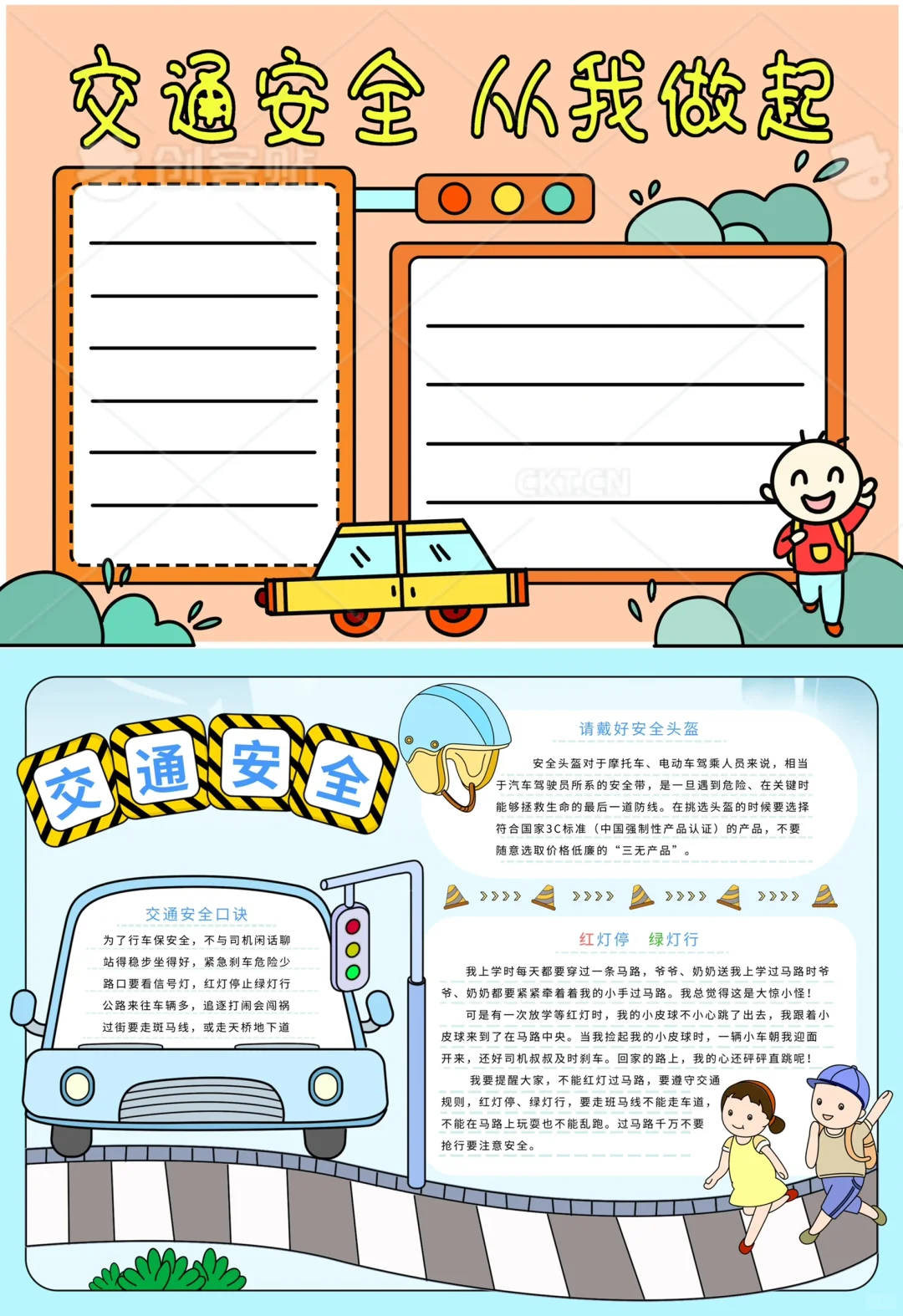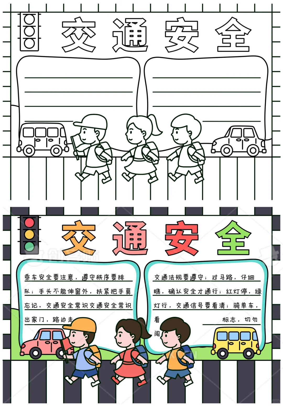 📚“交通安全”系列主题手抄报模版,附线稿。 🎨标题、元素、图片、文案素材适用于主题画、手抄报、黑板报、手账,及相关的美术课程。 📚模版图片来源于