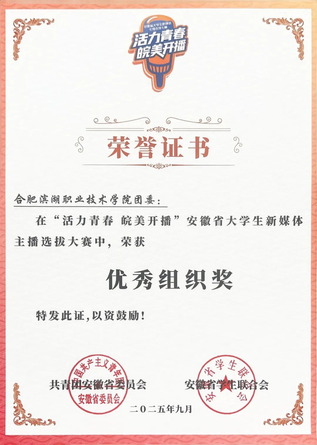 9月12日,由共青团安徽省委、安徽省学联等多部门联合举办的安徽省大学生新媒体主播选拔大赛颁奖典礼在沈福村文化创意产业基地隆重举行。我校汤玉新同学荣获大赛一等奖,学校团委荣获优秀组织奖。