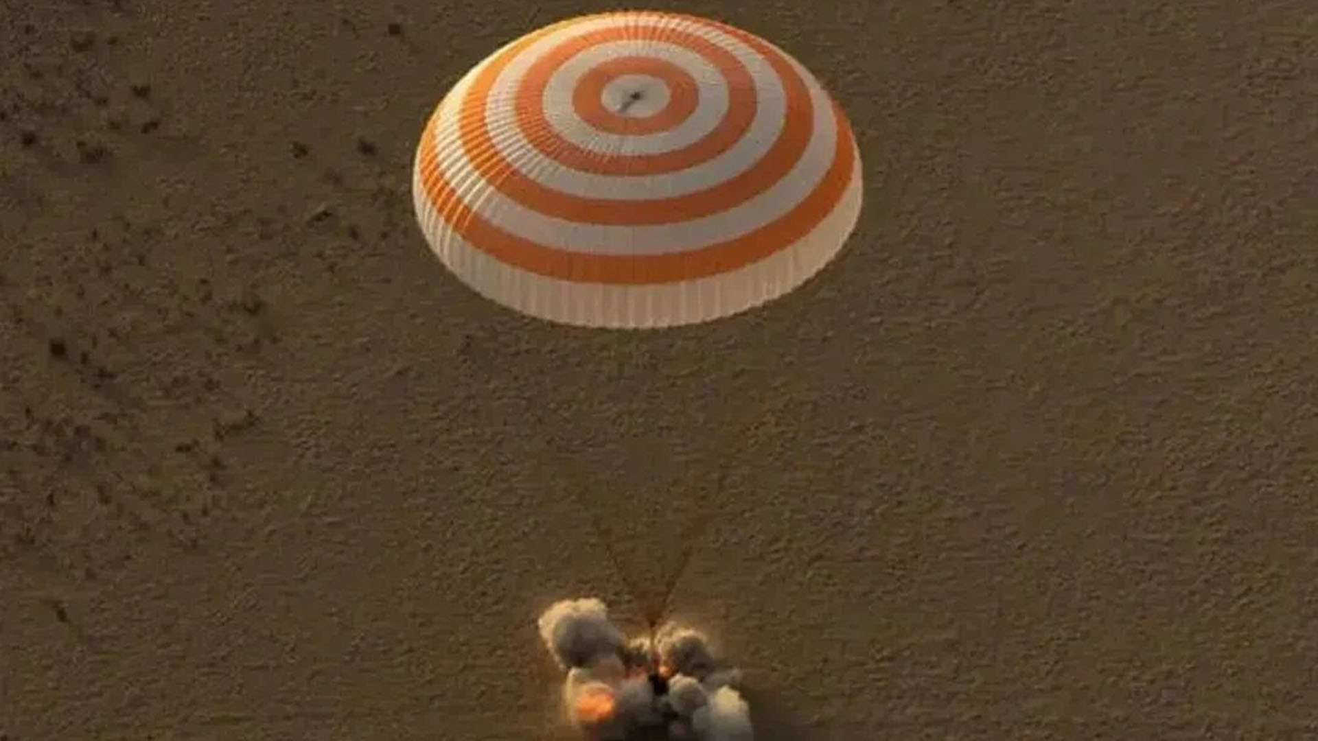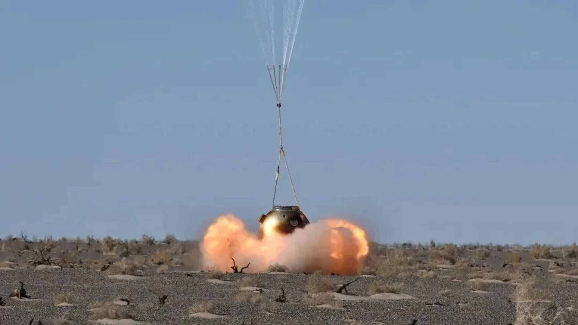 不知大家发现了没,当返回舱打开大伞之后,画面开始时候还那么平稳,但在大约离地面6公里高的地方,返回舱底部突然“哐当”一下掉了好大一块东西!紧接着,就在扔掉东西不久,落地的一刹那,返回舱底部“轰”地冒出一团火光,四周顿时烟尘滚滚。