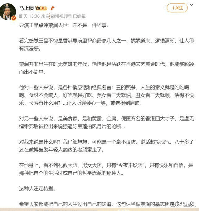 王晶和蔡澜相识数十年,他的话听来格外真实:“蔡澜的离开,不是坏事,可能是一种解脱。”看似冷淡,其实这句话比任何悼词都诚实。