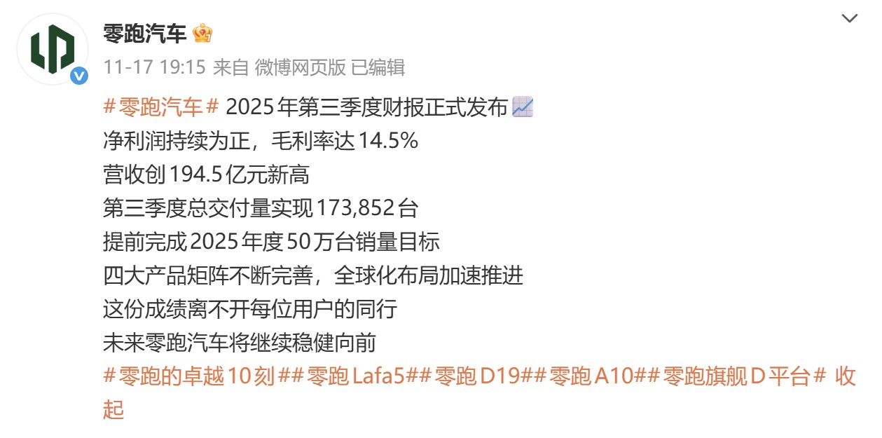 零跑三季度财报再创佳绩,多项核心指标展现出强劲的增长动能。今年第三季度,零跑实现营收194.5亿元,同比增长97.3%;归母净利润达到了1.5亿元,与去年同期相比扭亏为盈;毛利率达到了14.5%。截至2025年9月30日,零跑现金及现金等价物、受限制现金、按公允价值计入损益的金融资产及银行定期存款结余为339.2亿元。