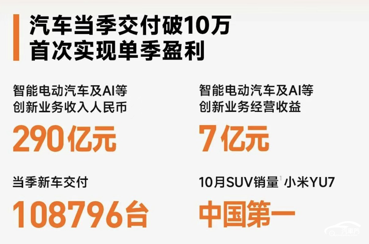 业绩的增长,主要来源于小米SU7和小米YU7两款车型。今年第三季度,小米汽车共交付了108796辆,同比增长了173.4%,同样创历史新高。与此同时,小米汽车的单车平均售价已经从25.37万元提升至26.01万元,持续优化盈利能力。小米董事长雷军称:本月23日前,小米汽车将完成全年35万辆的交付目标,今年全年预估交付将超40万辆。
