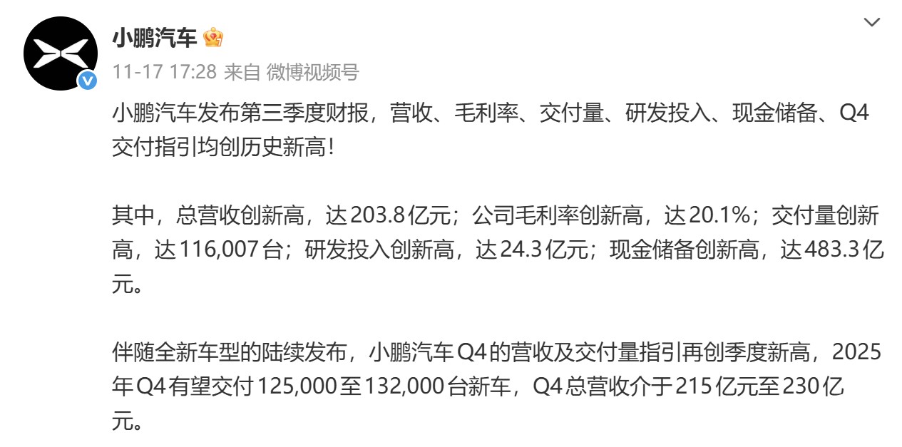 小鹏的盈利临界点近在眼前。数据显示:今年第三季度,小鹏汽车业务营收达到了180.5亿元,同比增长了105.3%;归属于上市公司股东的净亏损3.8亿元,同比收窄了79%;汽车毛利率为13.1%,同比增长了4.5%。截至2025年9月30日,小鹏汽车现金及现金等价物、受限制现金、短期投资及定期存款为人民币483.3亿元。
