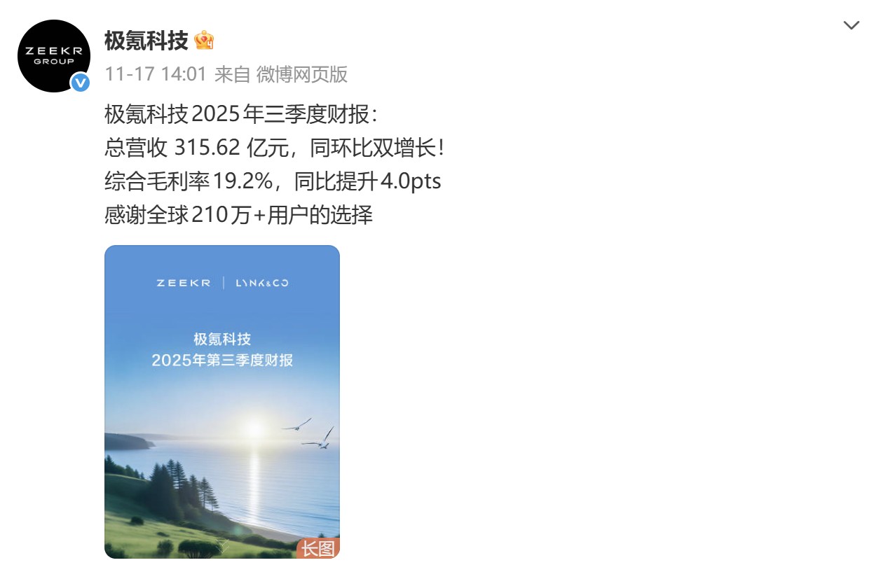 极氪科技盈利能力显著提升。数据显示:7-9月,极氪科技当季整车业务营收265.27亿元,同比增长7.3%,主要受益于三季度多款改款及全新车型上市带动销量;净亏损3.07亿元,同比收窄了84.9%,盈利质量继续改善;综合毛利率19.2%,与去年相比提升4%,毛利润60.46亿元,同比上涨了37.1%。