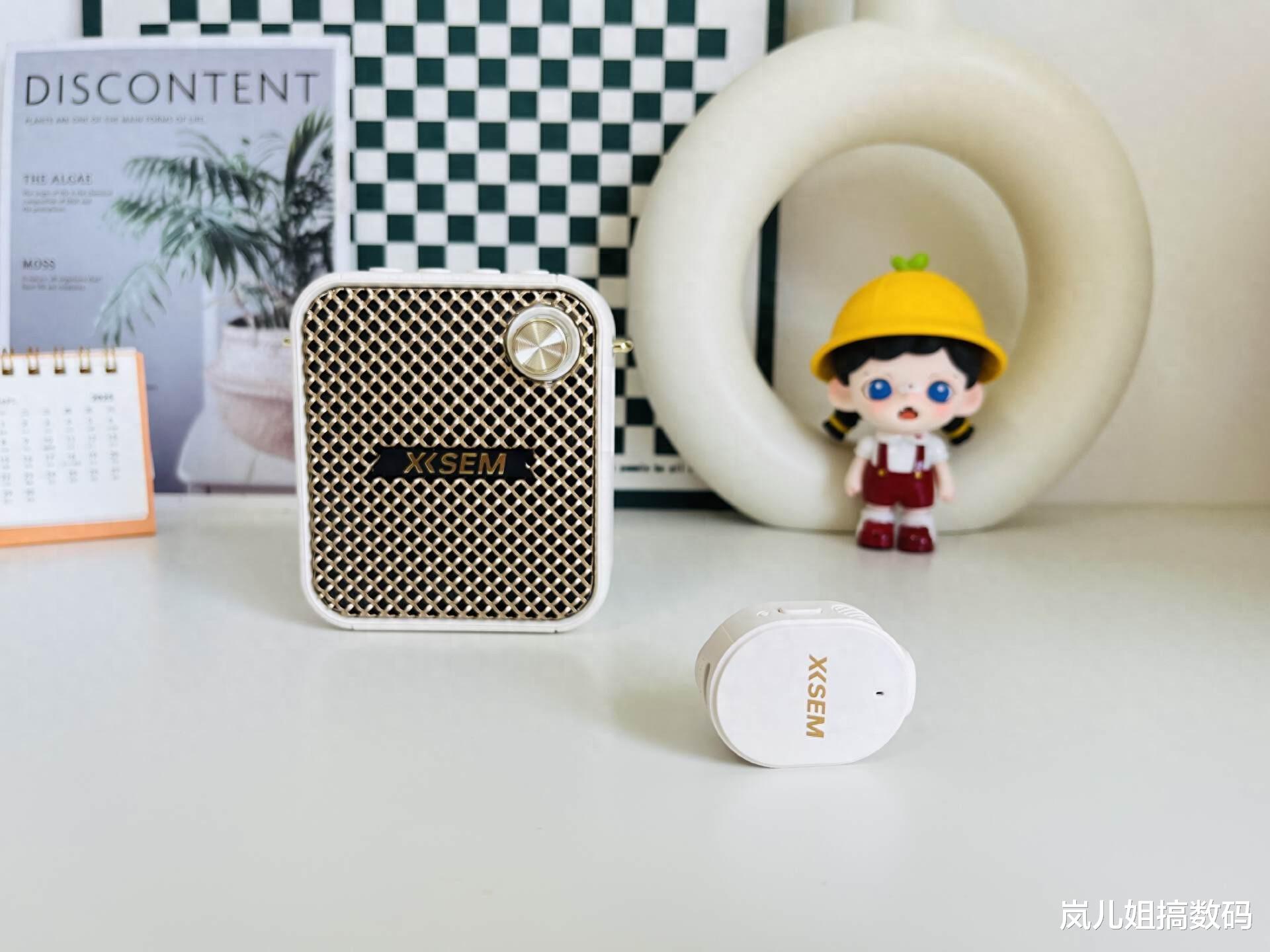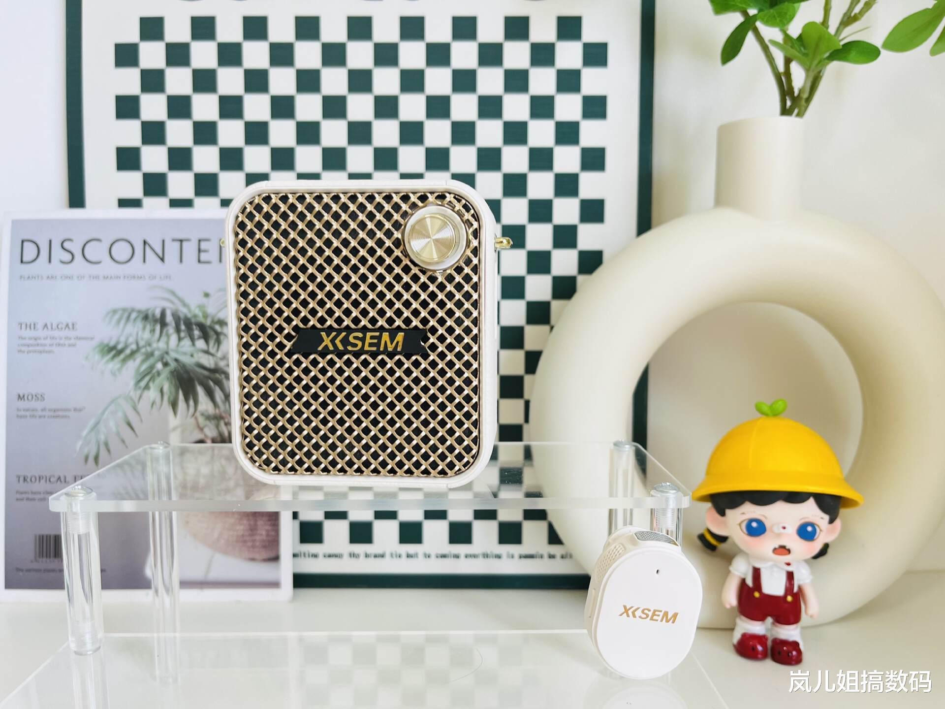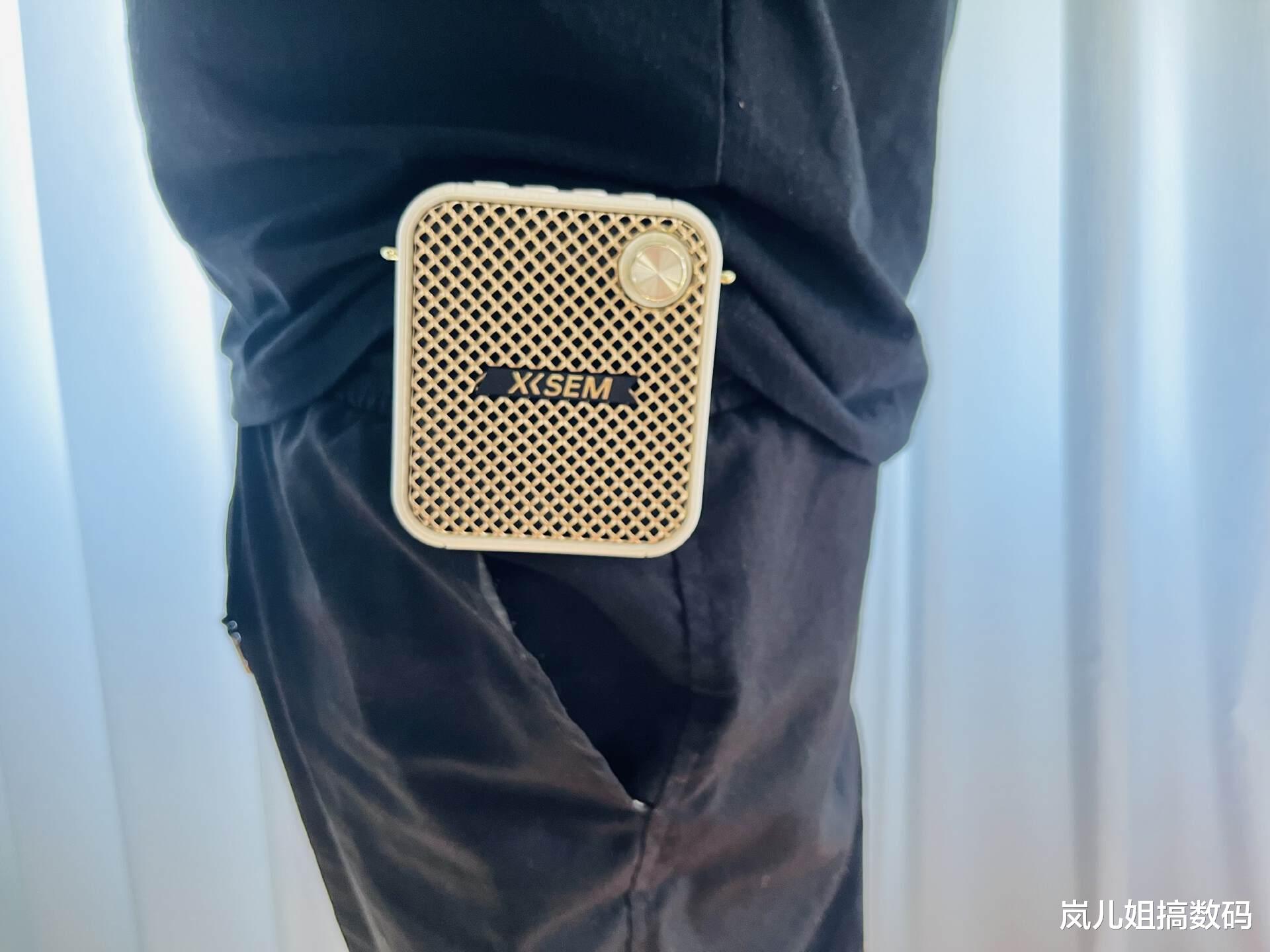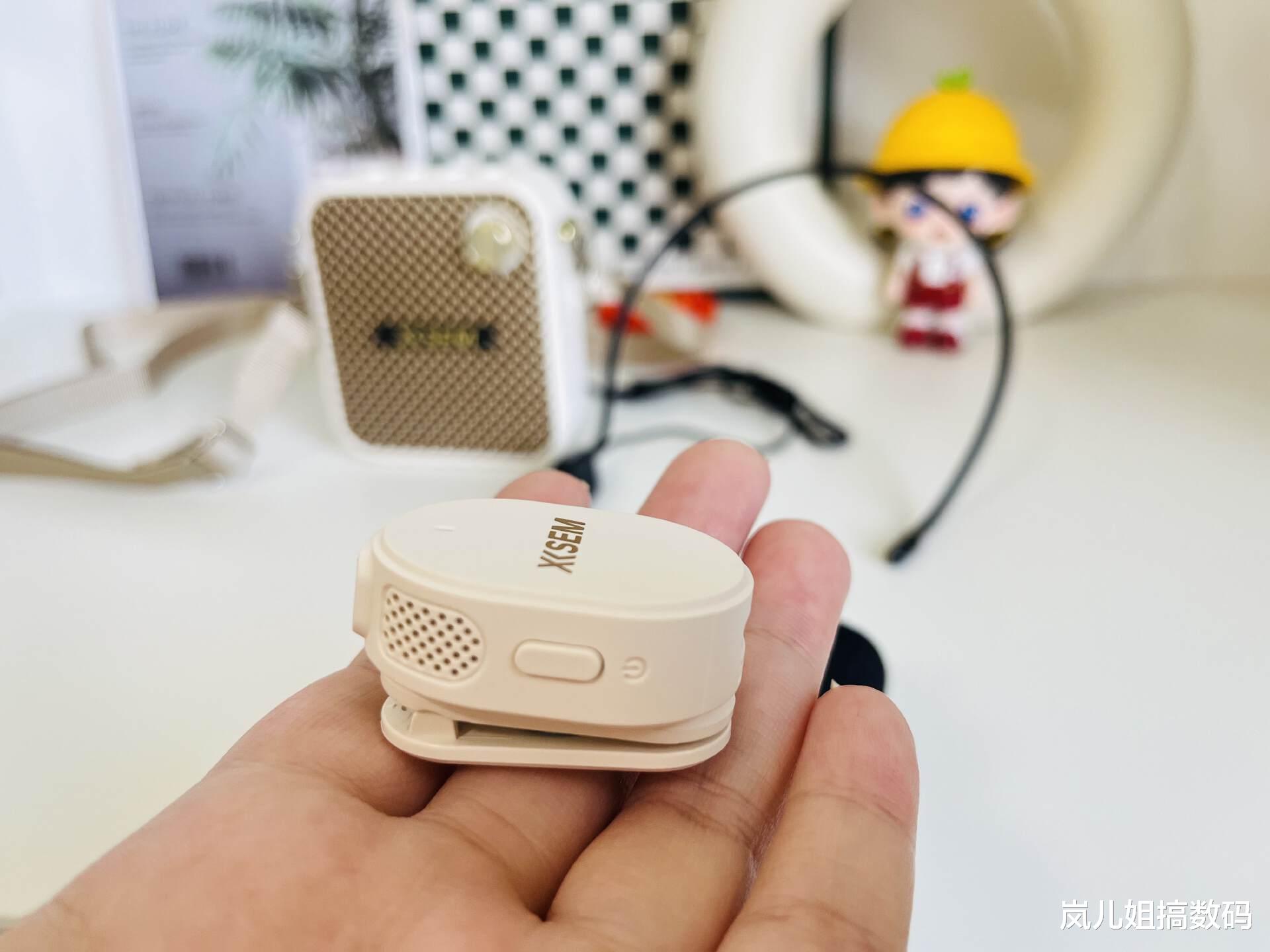 西圣Bee小蜜蜂扩音器机身小巧精致,卡其配色简约又时尚,机身整个线条十分流畅,像个复古小收音机,尺寸大小为82*37*95mm,单机重约165g,不管是拿在手里还是别在裤腰、背着,都很轻巧便携。